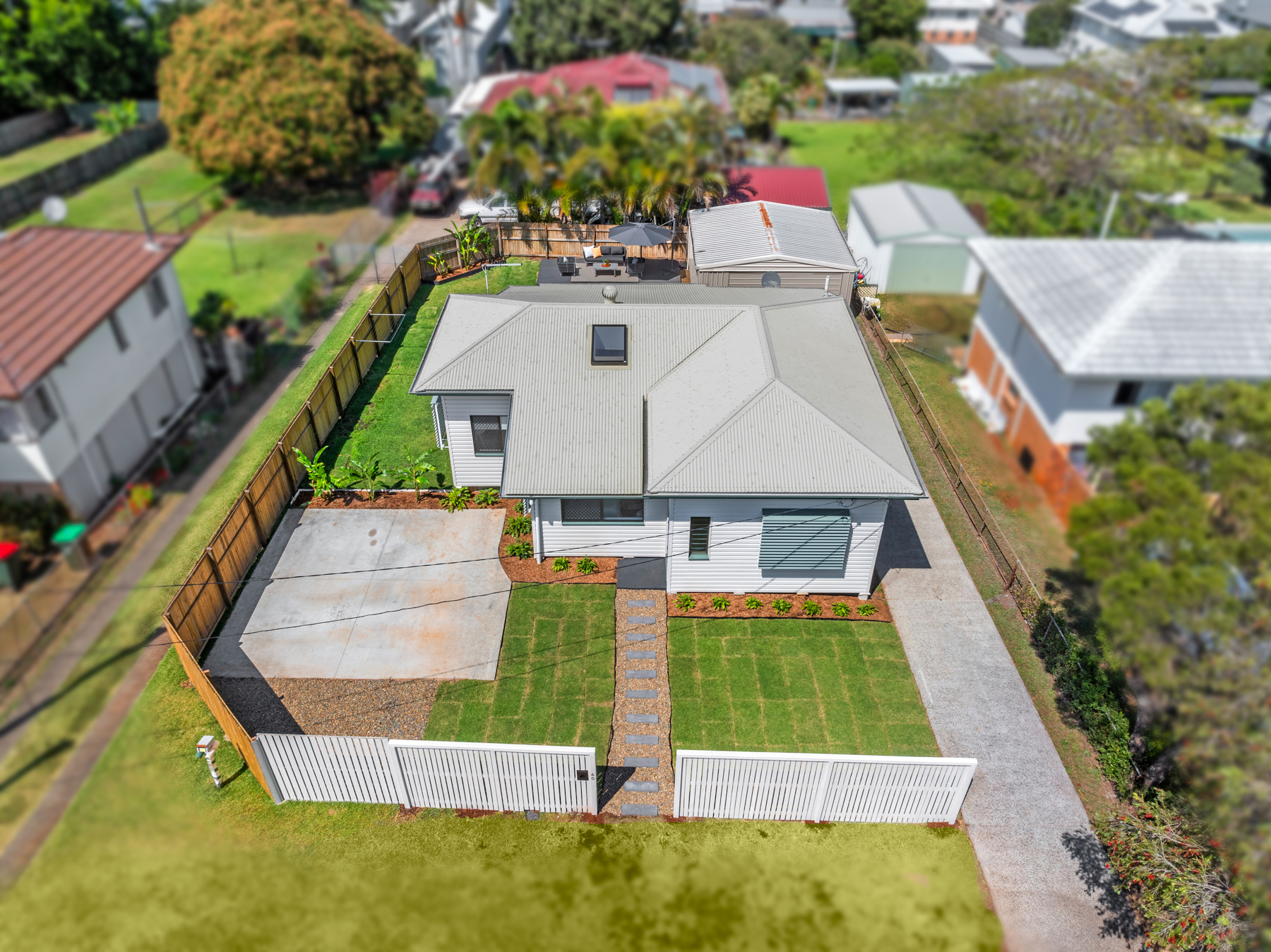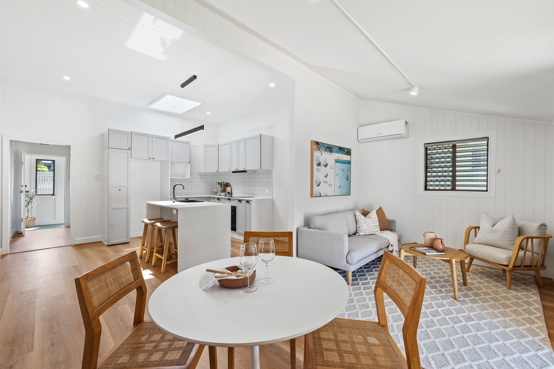 Step inside and you’ll immediately feel the warmth and light – high ceilings, fresh interiors, and a gorgeous skylight over the kitchen that floods the home with sunshine. The beautifully renovated kitchen features brand-new appliances, electric cooking, and quality finishes – the perfect space to entertain or unwind. With air conditioning, ceiling fans, and a flexible layout of four bedrooms (or three plus a second living/media), there’s room for everyone.