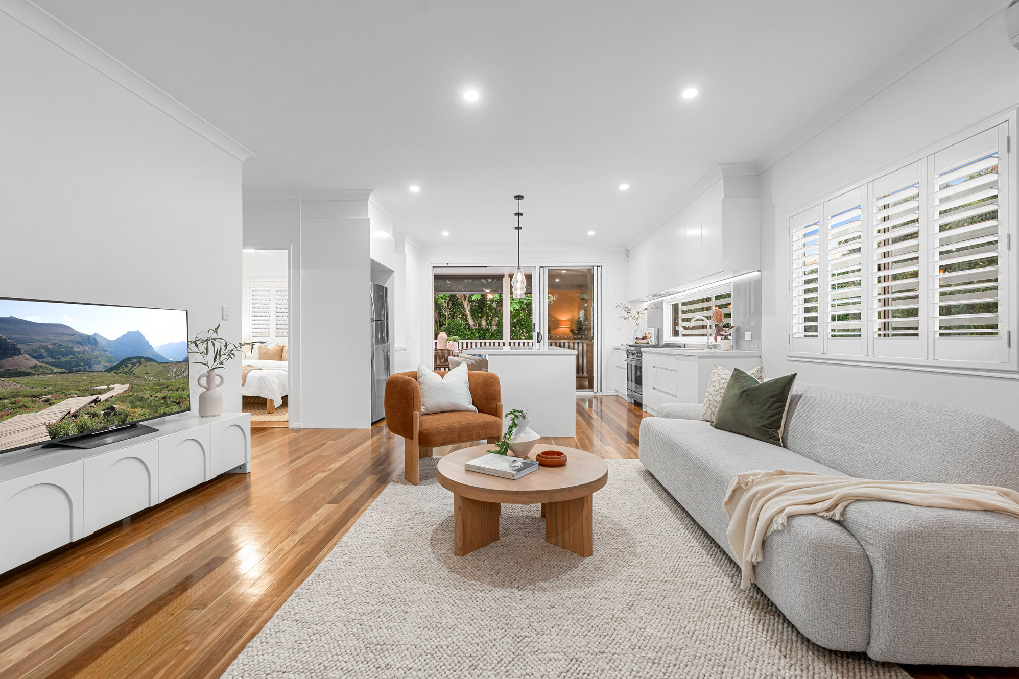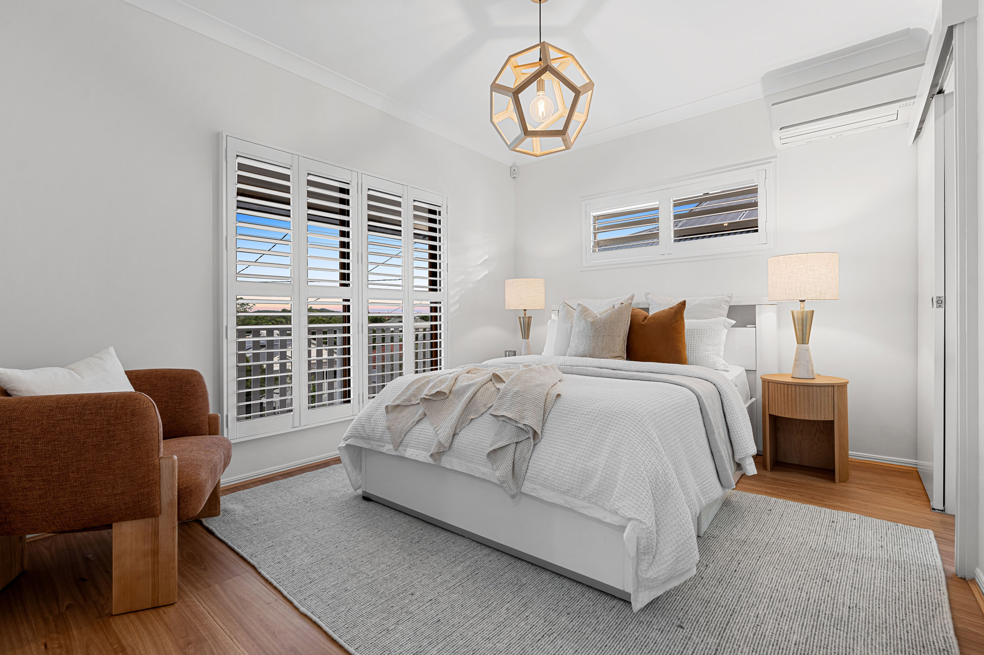 – The upper level boasts polished hardwood timber floors, soaring 2.9-meter-high ceilings, and elegant plantation shutters throughout