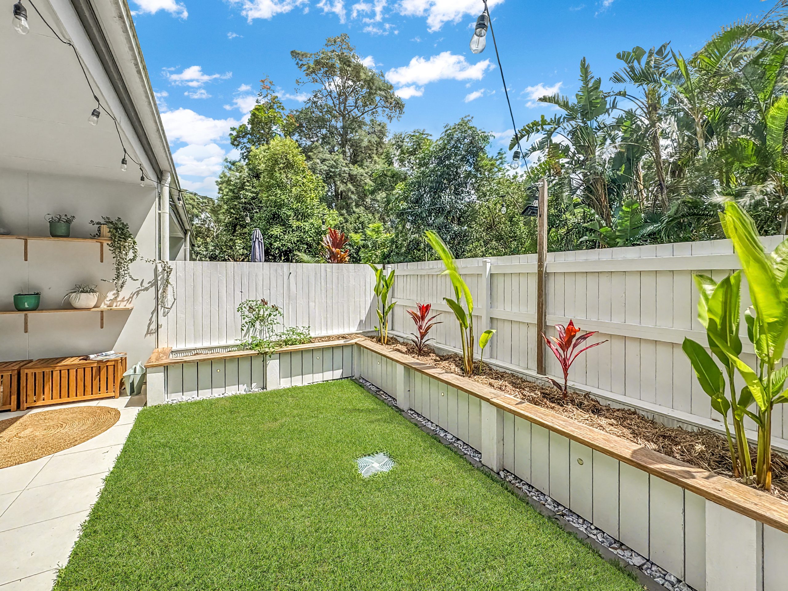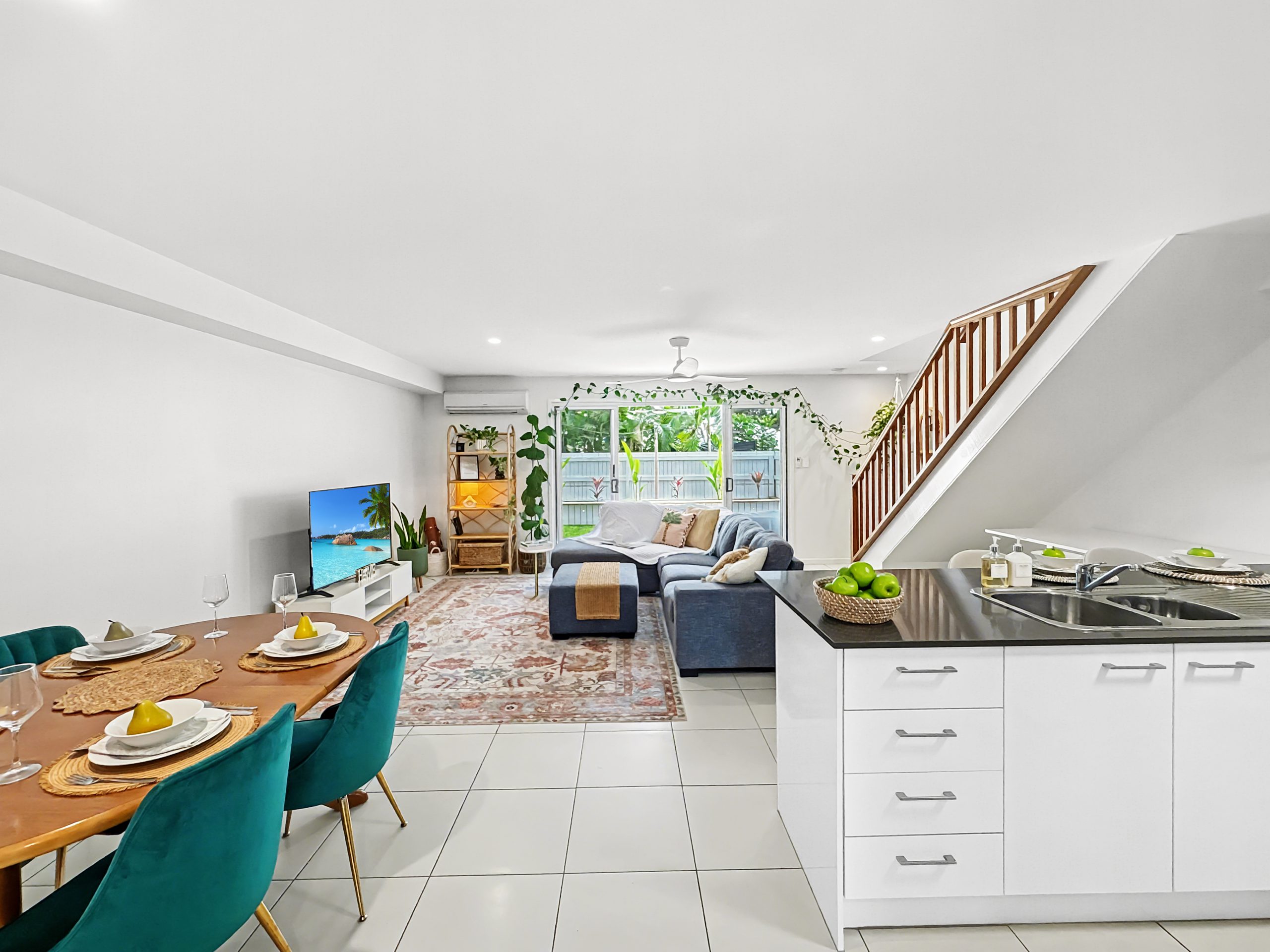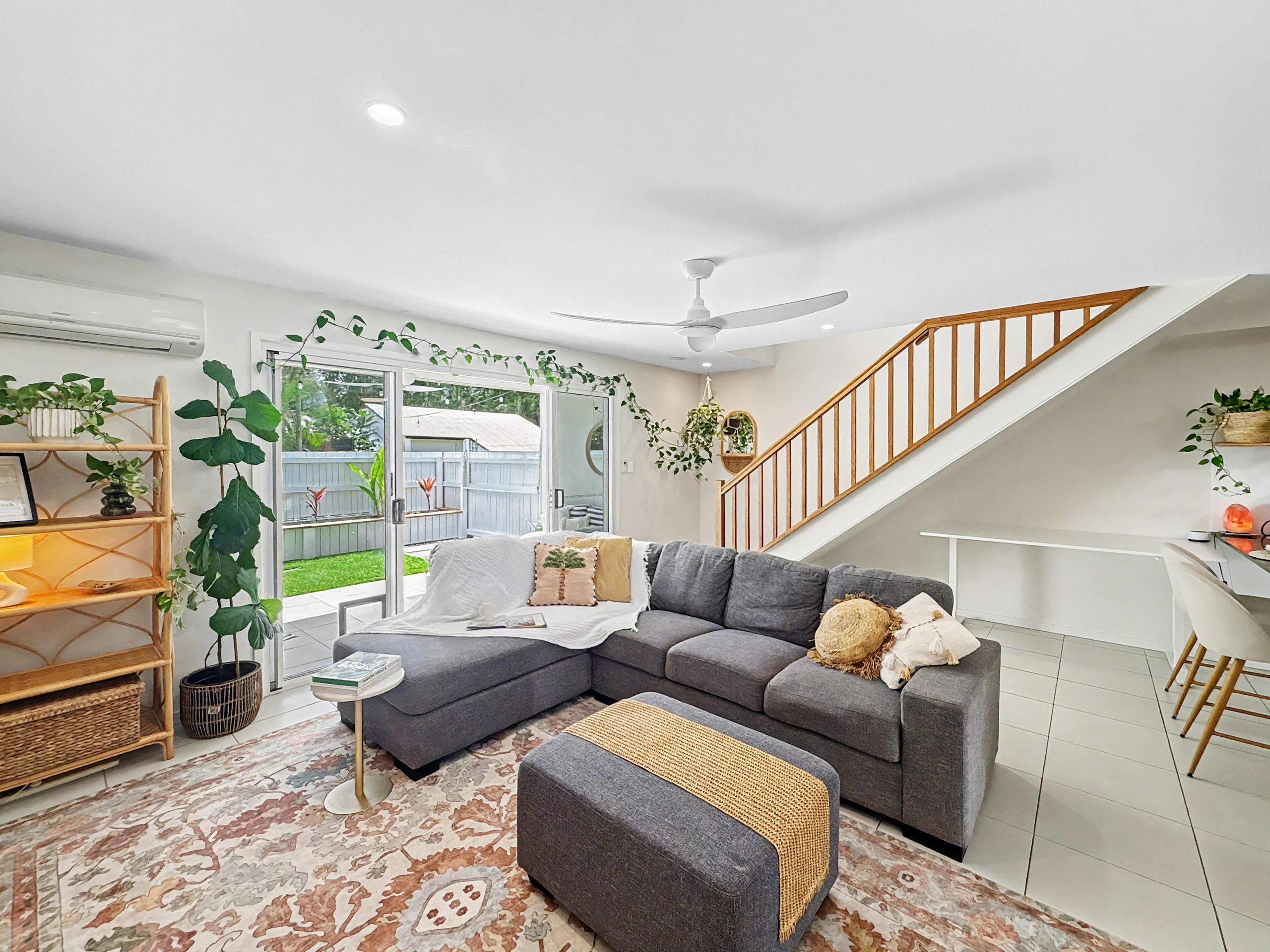 The open plan kitchen features stone benchtops and generous storage, flowing seamlessly into the light-filled living and dining zone. Air conditioning ensures year-round comfort, while sliding doors extend the space outdoors to a tropical landscaped courtyard complete with festoon lighting – an inviting setting for entertaining or unwinding in complete privacy.