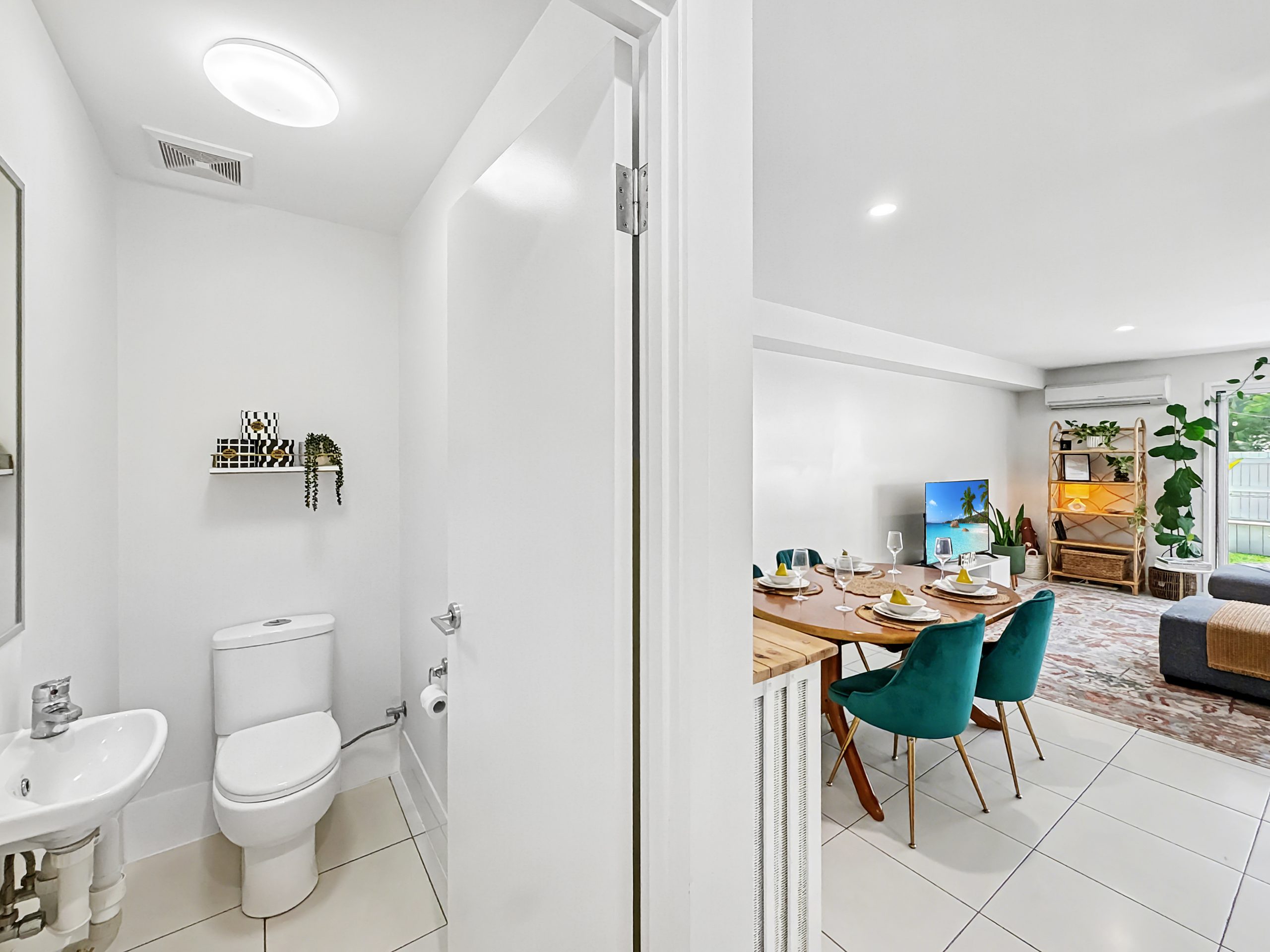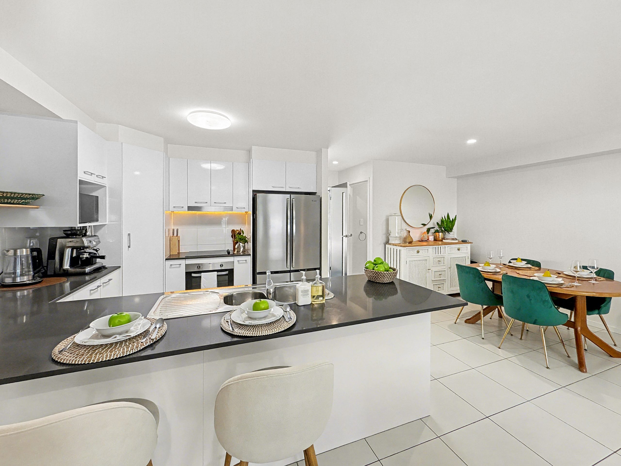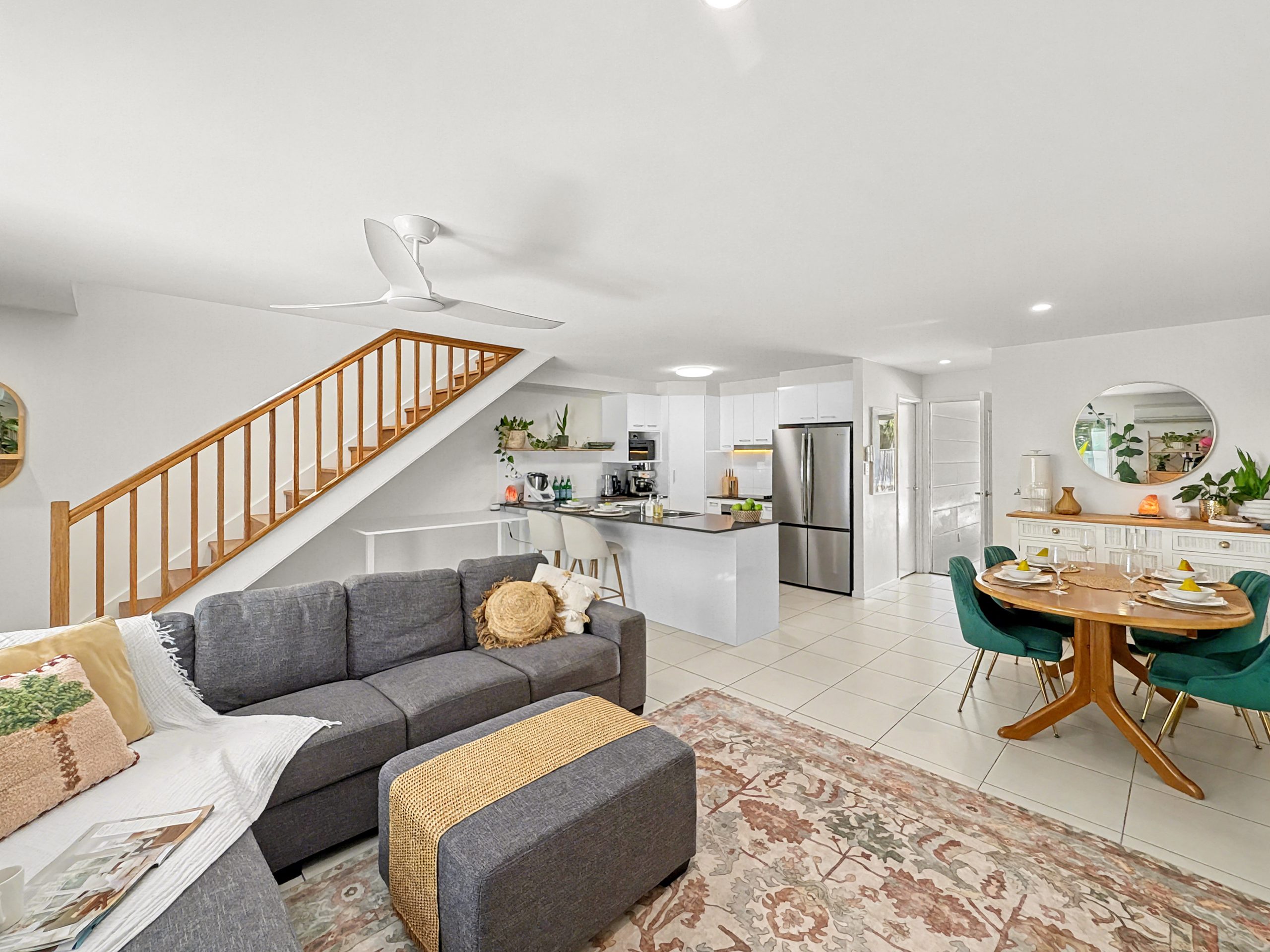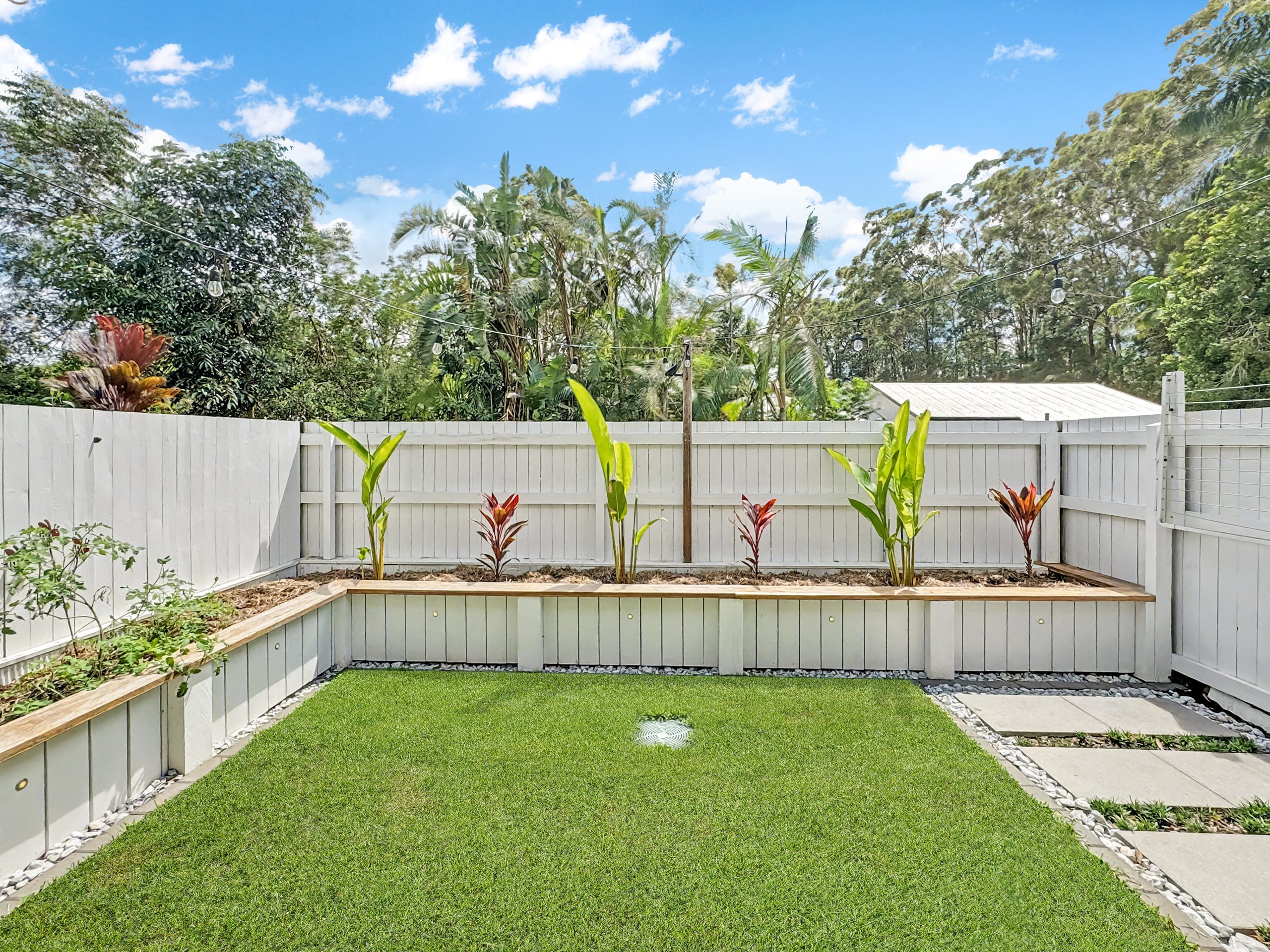 The open plan kitchen features stone benchtops and generous storage, flowing seamlessly into the light-filled living and dining zone. Air conditioning ensures year-round comfort, while sliding doors extend the space outdoors to a tropical landscaped courtyard complete with festoon lighting – an inviting setting for entertaining or unwinding in complete privacy.