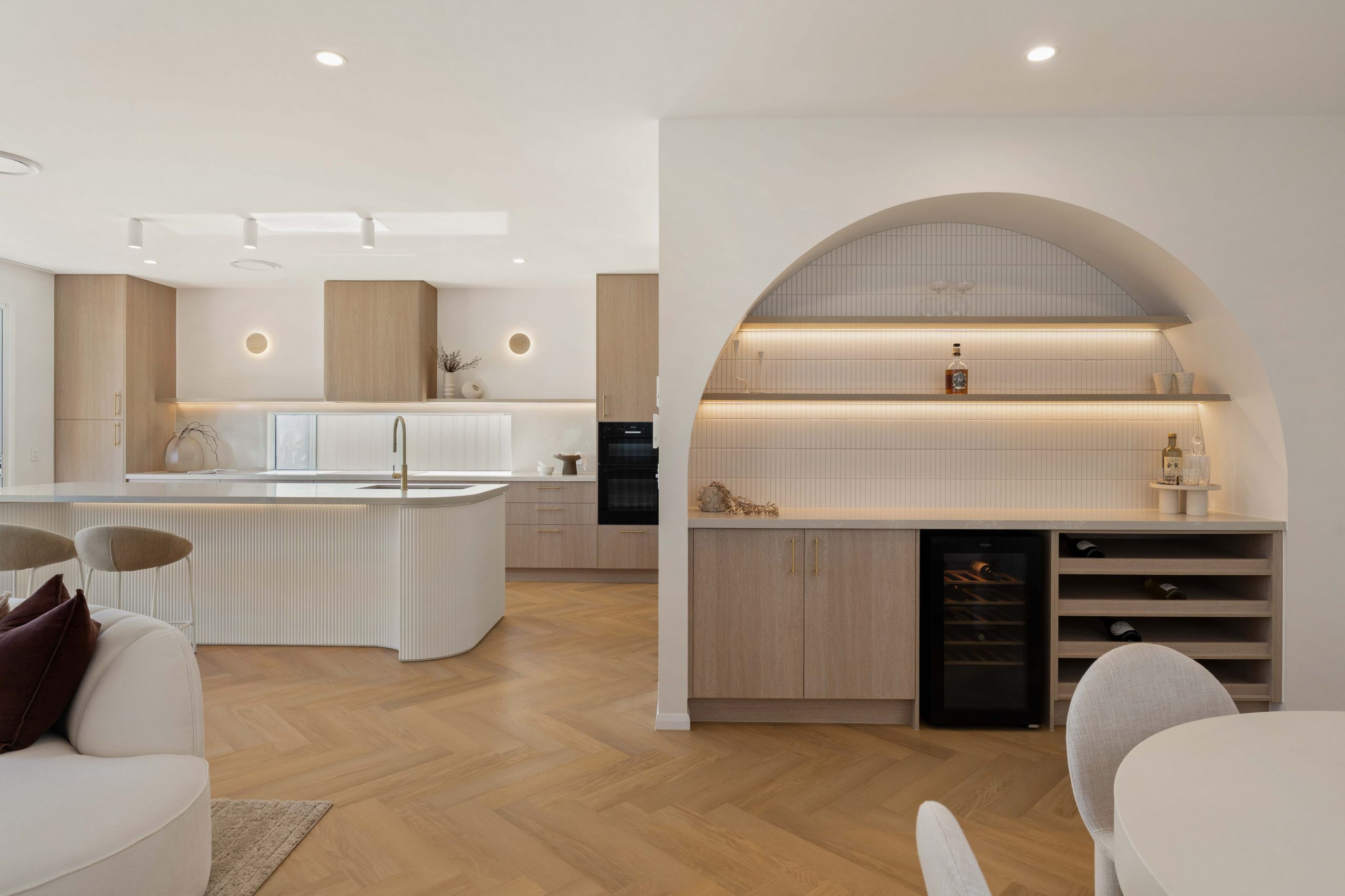 Upstairs and downstairs living zones are enhanced by two built-in bar areas – one with wine fridge and racks – creating flexibility for entertaining on both levels. An electric fireplace with reclaimed brick surround mirrors the exterior façade, adding warmth and cohesion to the design.