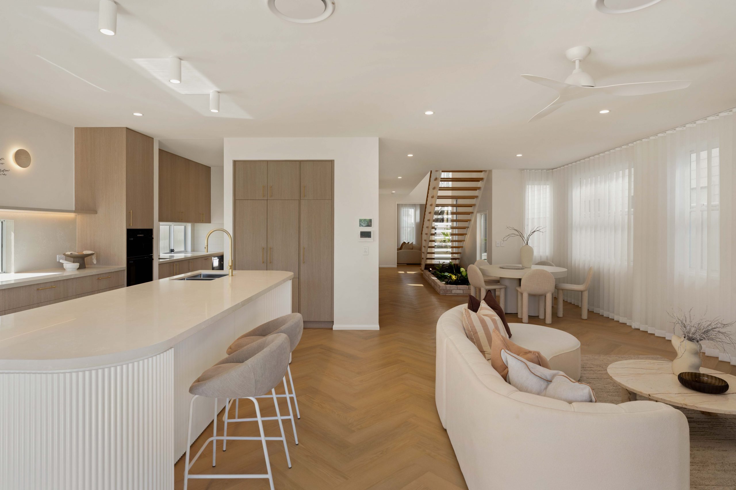 The designer kitchen is a true centrepiece, showcasing fully integrated European appliances, including a French-style double fridge and freezer. A generous butler’s pantry and adjoining mudroom, complete with custom bench seating and ample storage, flow seamlessly enhancing functionality and delivering a refined, cohesive finish.