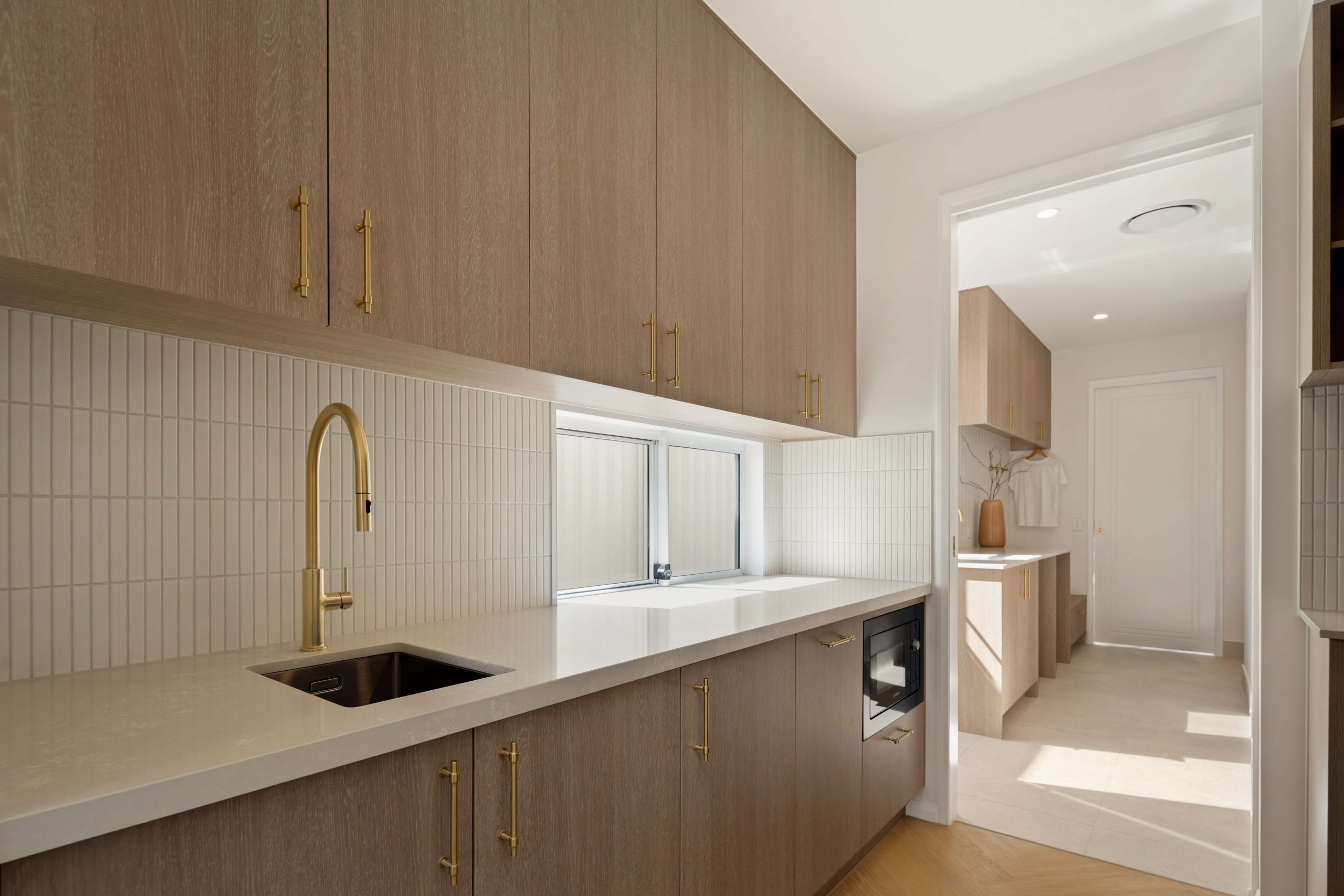 The master suite is pure indulgence, featuring an extra-large walk-in robe, freestanding bath and double shower with dual shower heads. A second freestanding bath services the main bathroom, while all bathrooms include LED mirrors with anti-fog and adjustable lighting, motion-sensor vanity lighting, and premium rectified tiles.