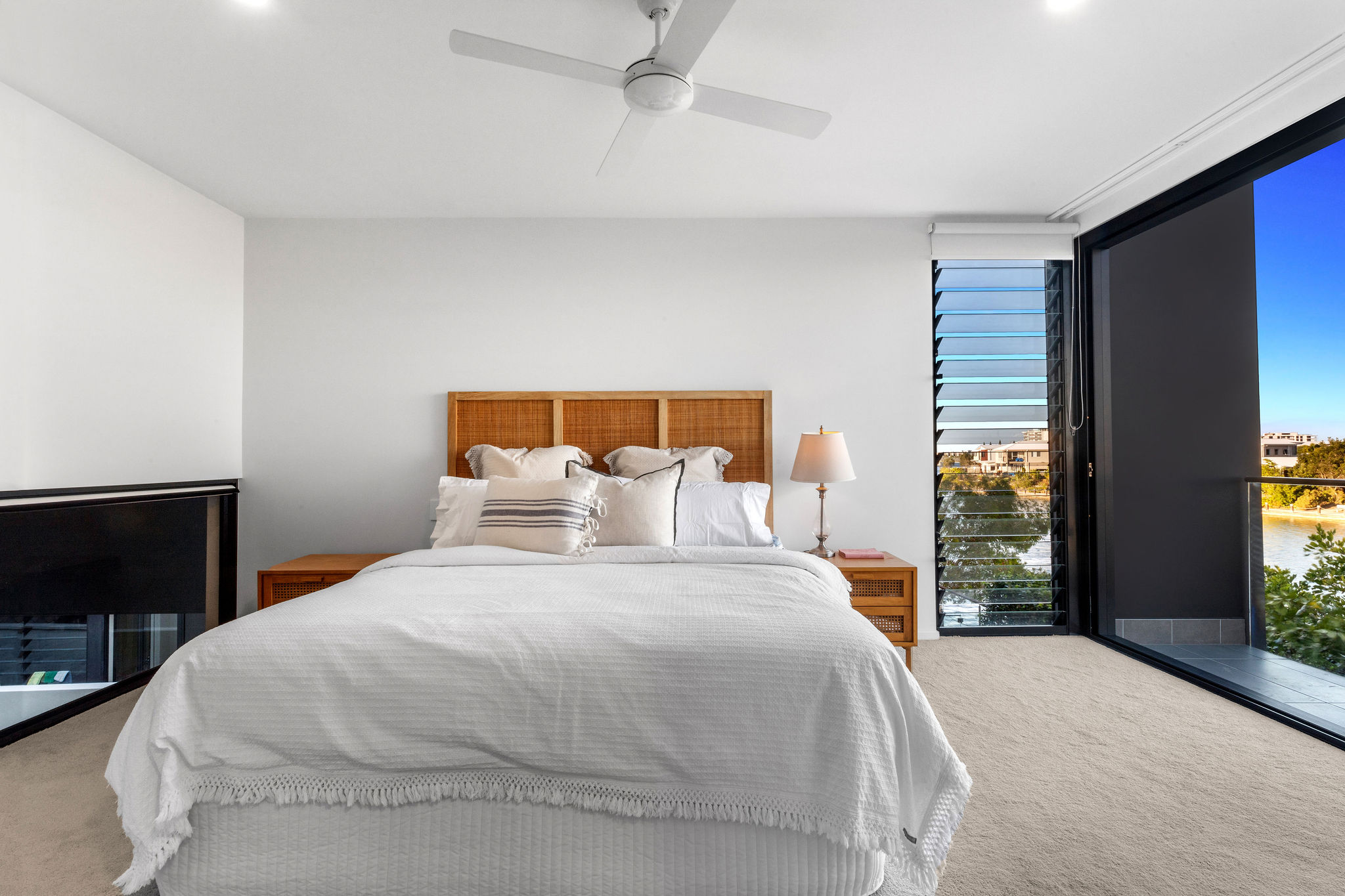 Multiple zones support flexible living. A second lounge upstairs captures natural light and offers separation for families, guests or work-from-home needs. The master suite is a private retreat with water views, balcony accessed through triple stacker doors, cleverly disguised mirrored walk-in robe and a premium ensuite with dual sinks and showerheads, walk-in shower, heat lamp and shower niche. The three additional bedrooms upstairs feature louvres, ceiling fans, mirrored built-in robes with internal cabinetry and quality carpeting.