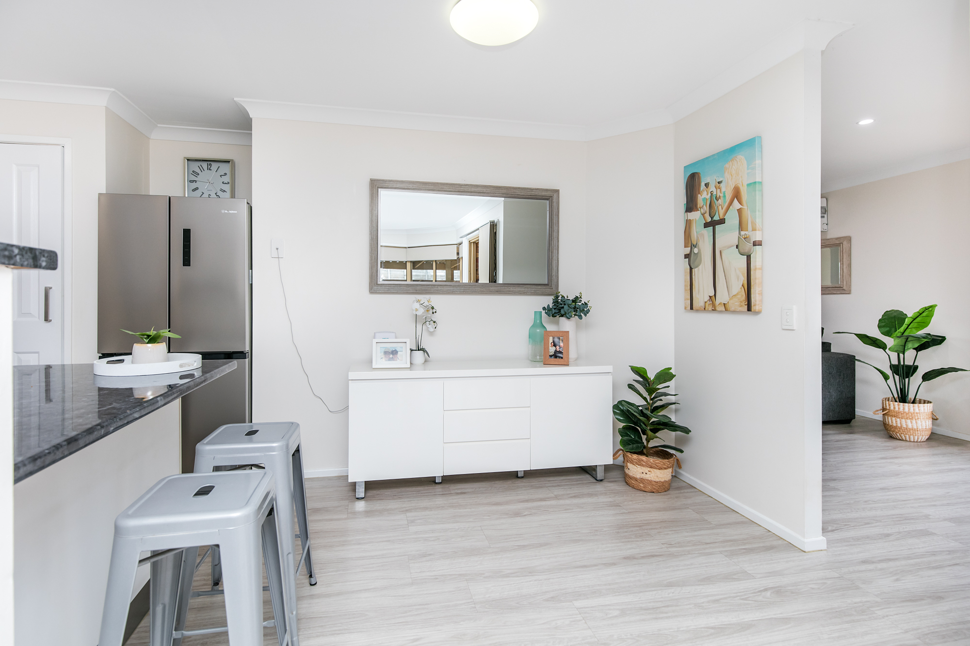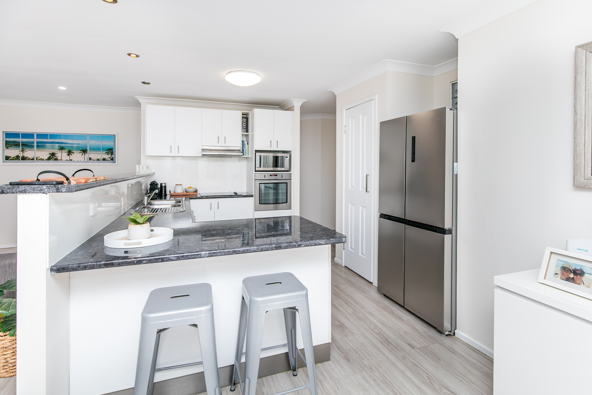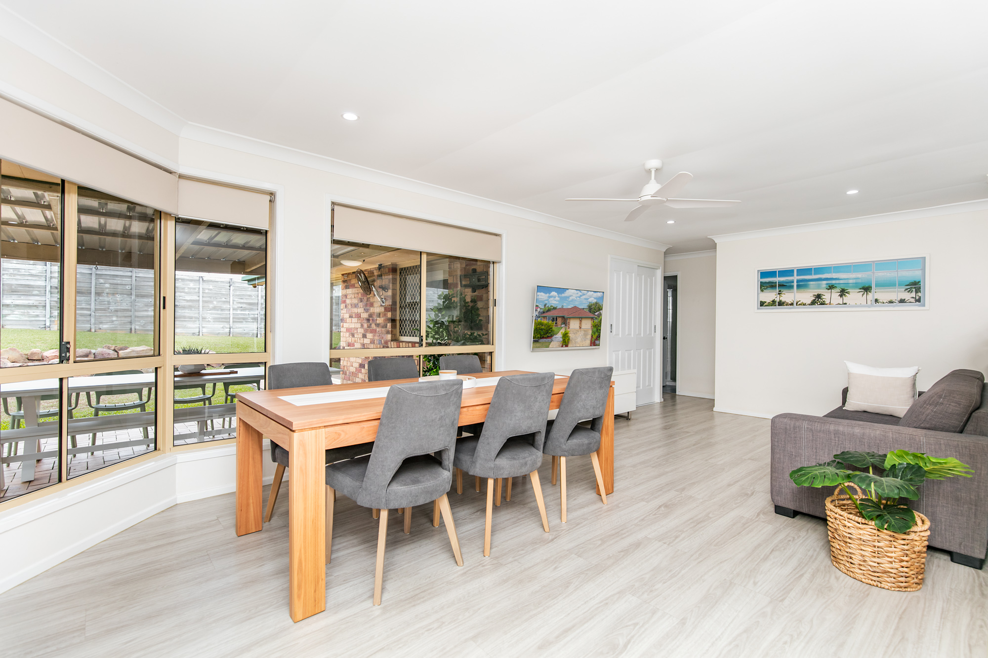 Step inside to find a light-filled interior, where the expansive kitchen, dining, and living areas seamlessly connect. The well-appointed kitchen features a Westinghouse dishwasher, an electric cooktop and oven, and ample cupboard space – perfect for home cooks and entertainers alike. The family room is a cosy retreat, complete with a split-system air conditioner and ceiling fan to ensure year-round comfort.