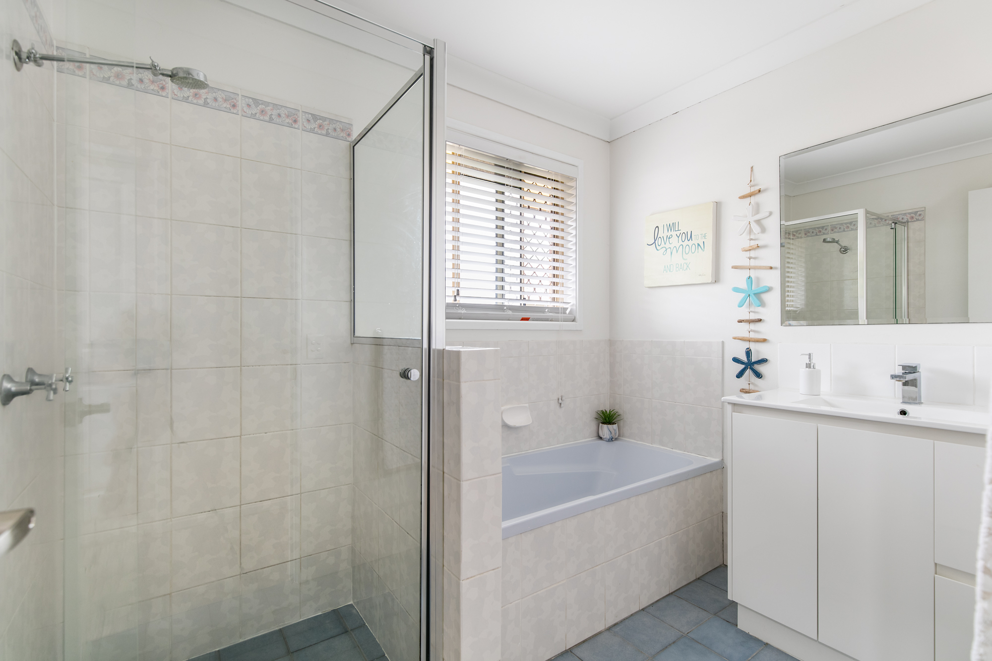 The king-sized master suite is a true sanctuary, boasting a walk-in robe, ensuite, air conditioning, and ceiling fan. Three additional bedrooms all include built-in wardrobes and ceiling fans, providing plenty of space for family members or guests. The main bathroom is thoughtfully designed with a separate bath, shower, and toilet, adding to the home’s functionality.