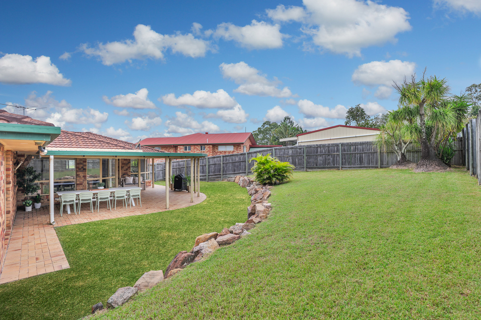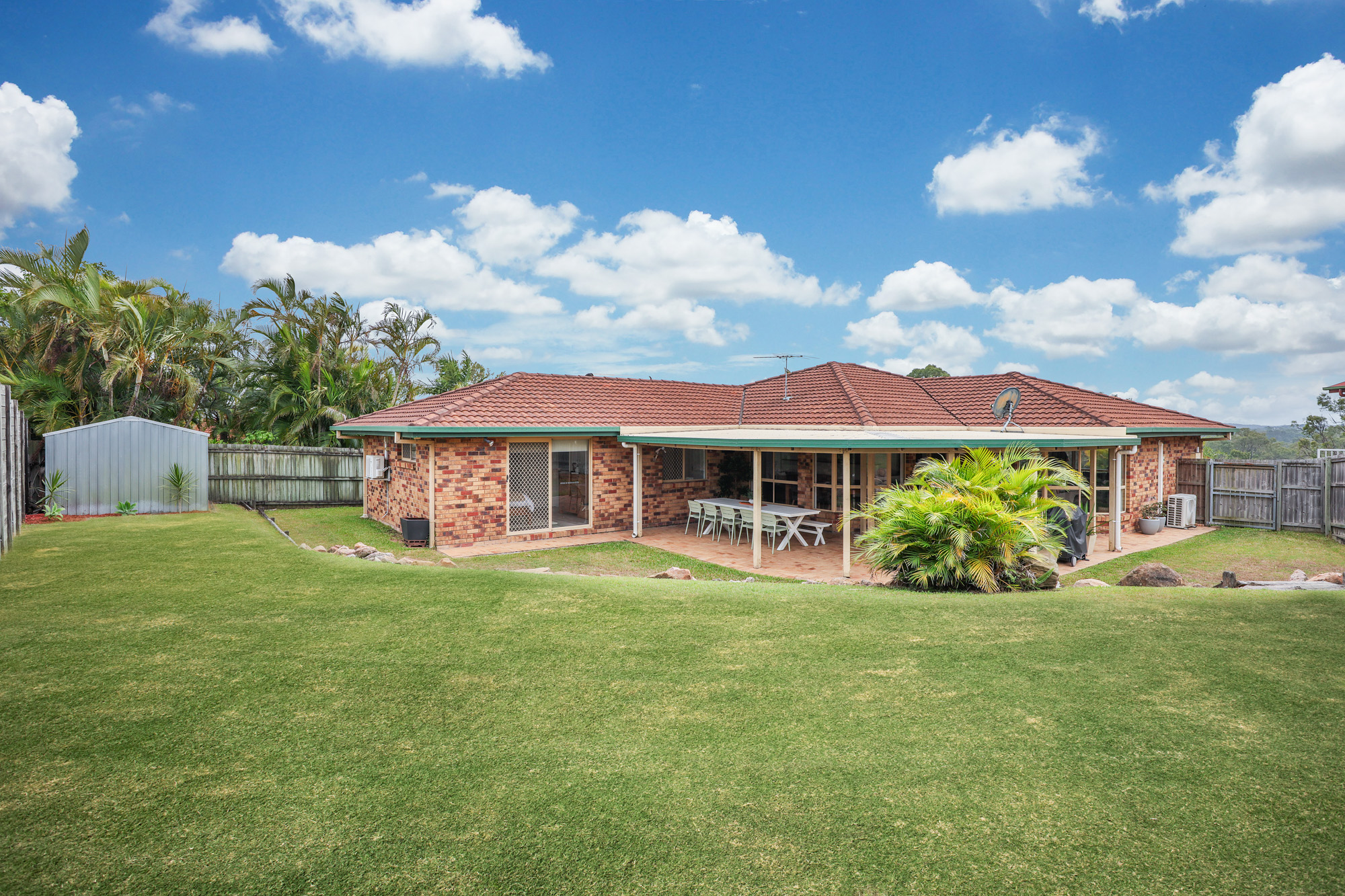 Step outside to discover a large covered outdoor entertaining area that overlooks the spacious backyard – the perfect setting for weekend BBQs or watching the kids play. The fully fenced 726m² block also includes a garden shed, ensuring ample storage for tools and outdoor essentials.