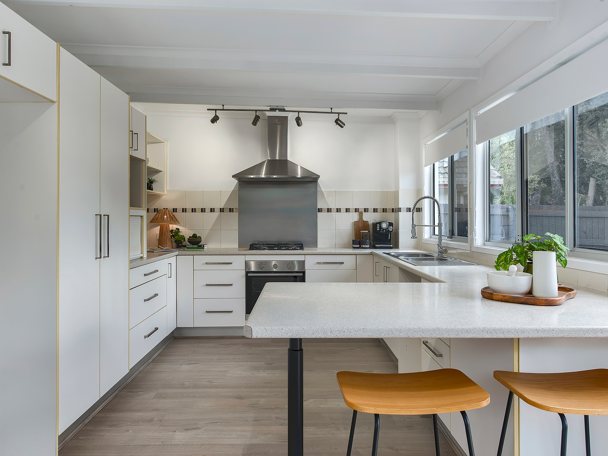 – Well-appointed kitchen with generous storage, gas cooking, breakfast bar seating and appliance nook