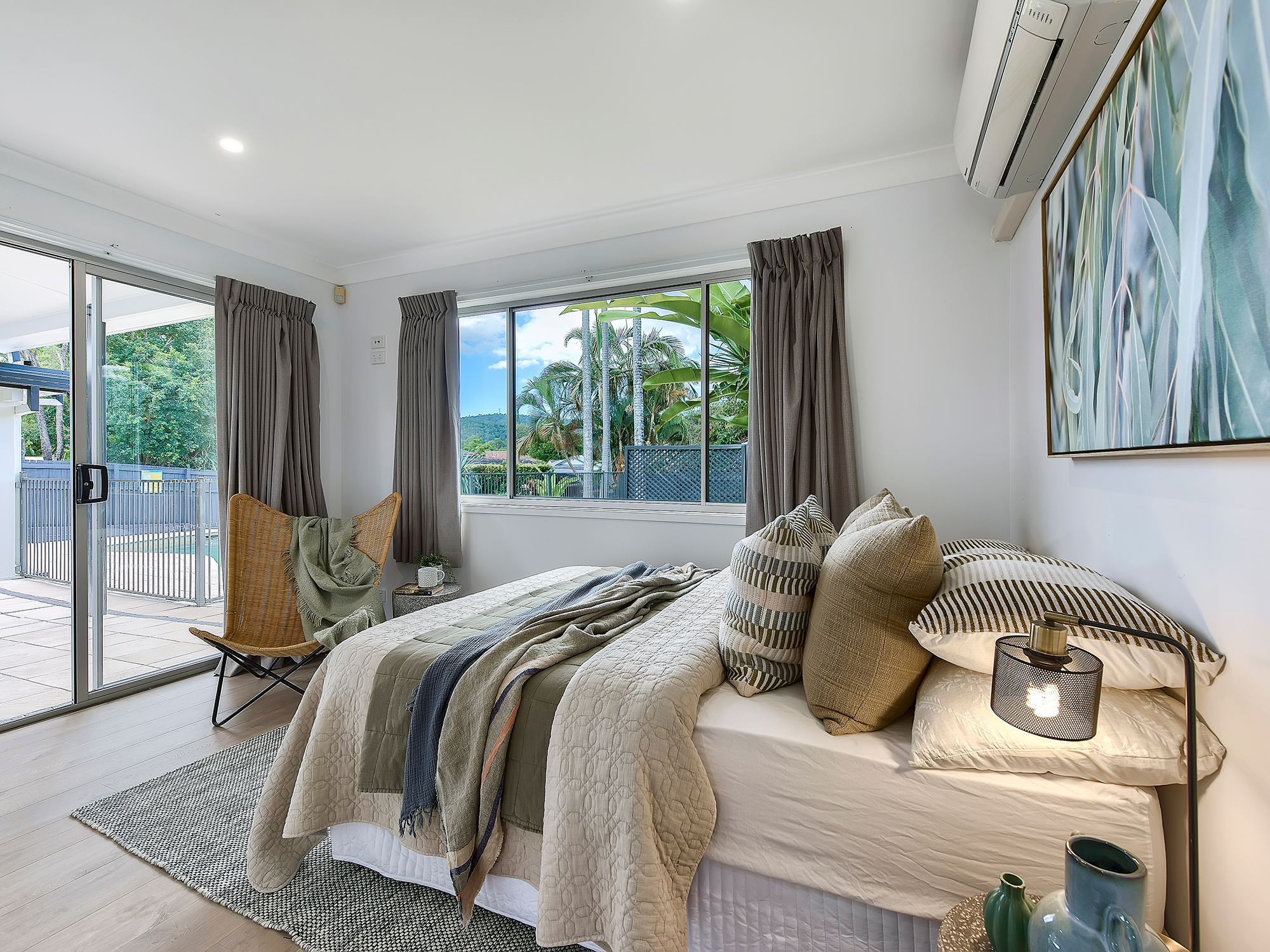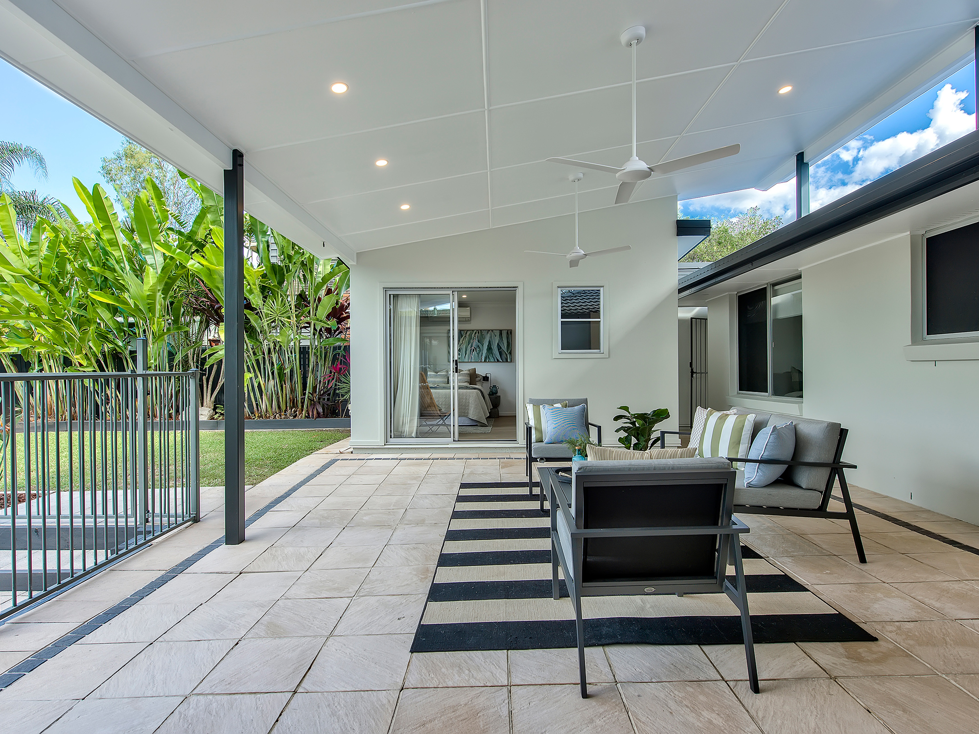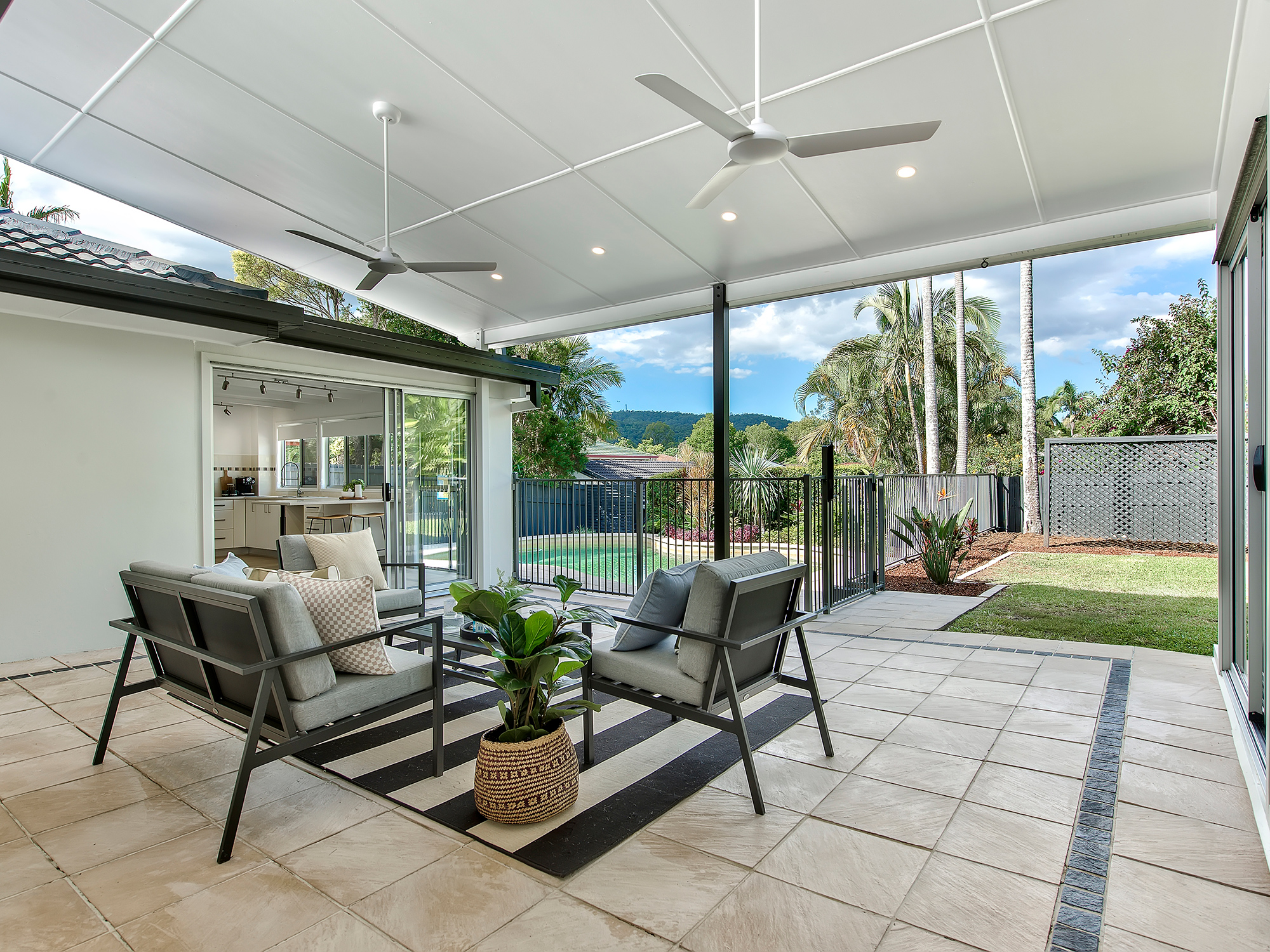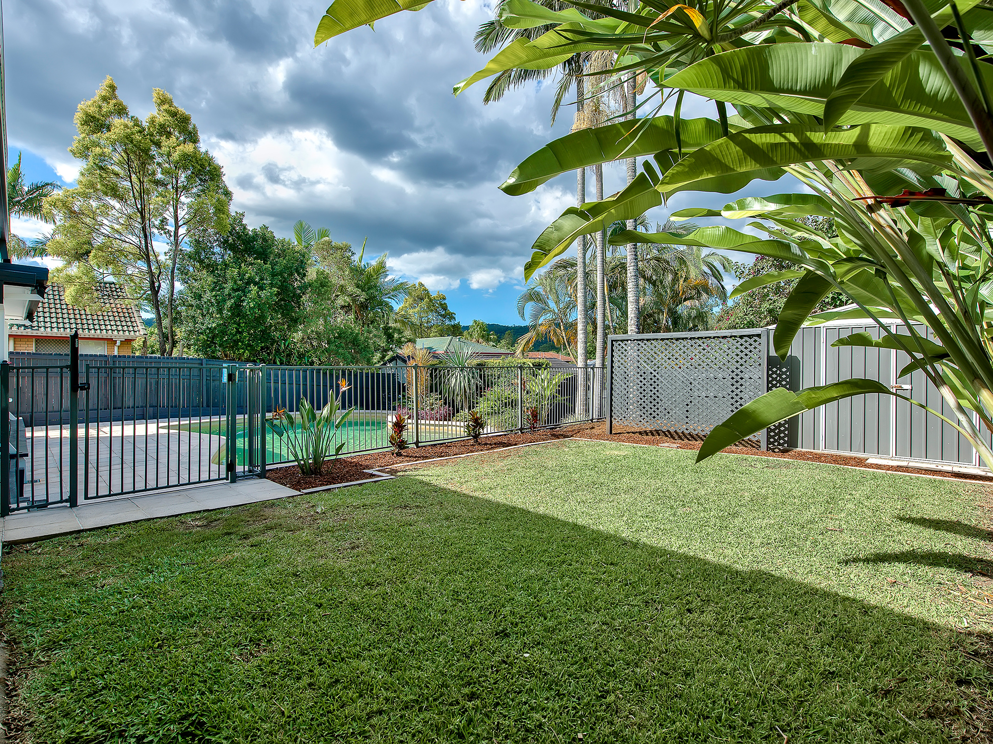 Generous outdoor living provides excellent space to unwind, relax and entertain, centred around a large covered patio with a high vaulted ceiling that enhances light and breezes. Overlooking the sparkling in-ground pool, the setting is framed by tiled poolside lounging and tropical landscaping, while a flat, fenced yard offers additional space for kids and pets.