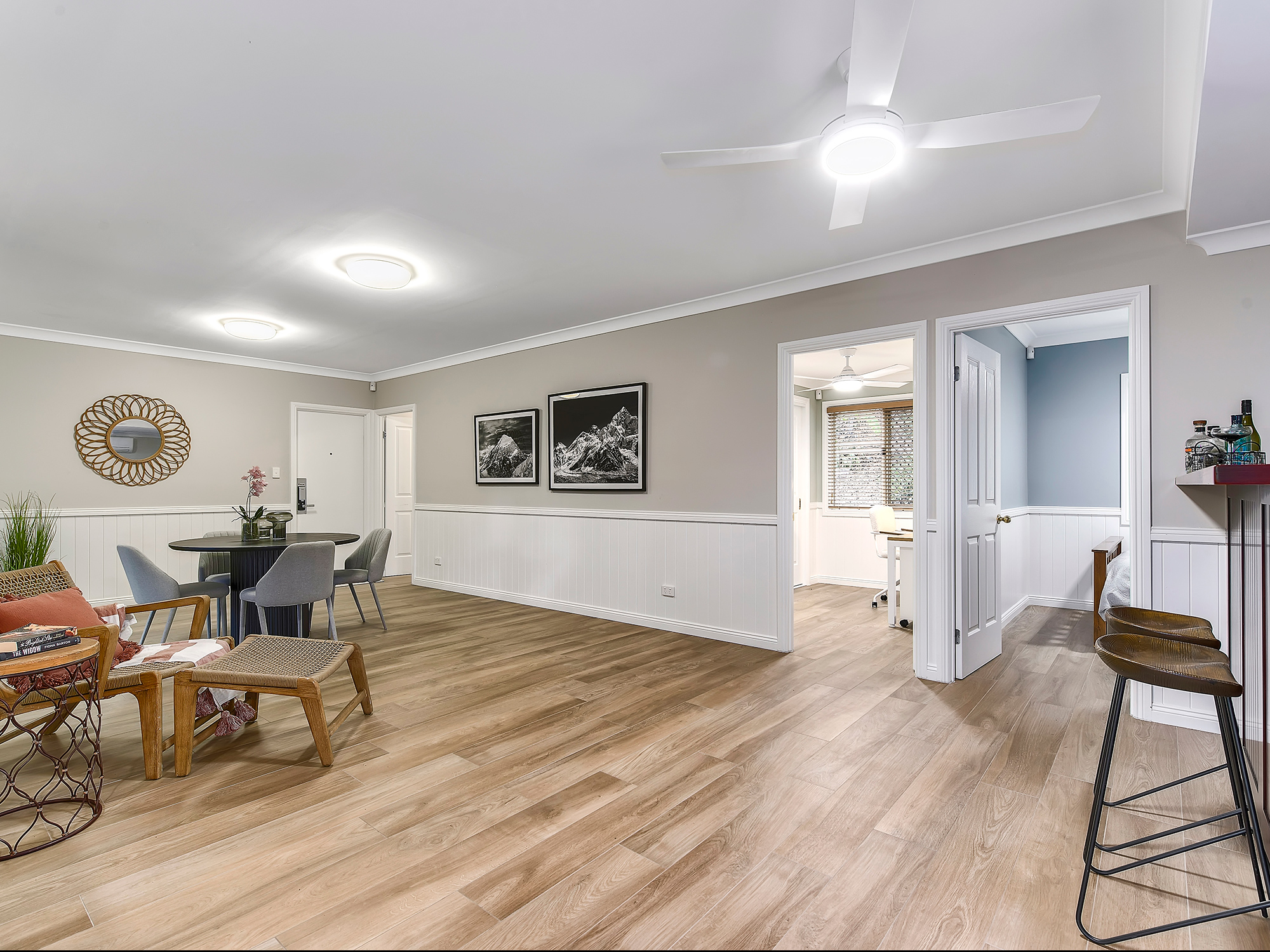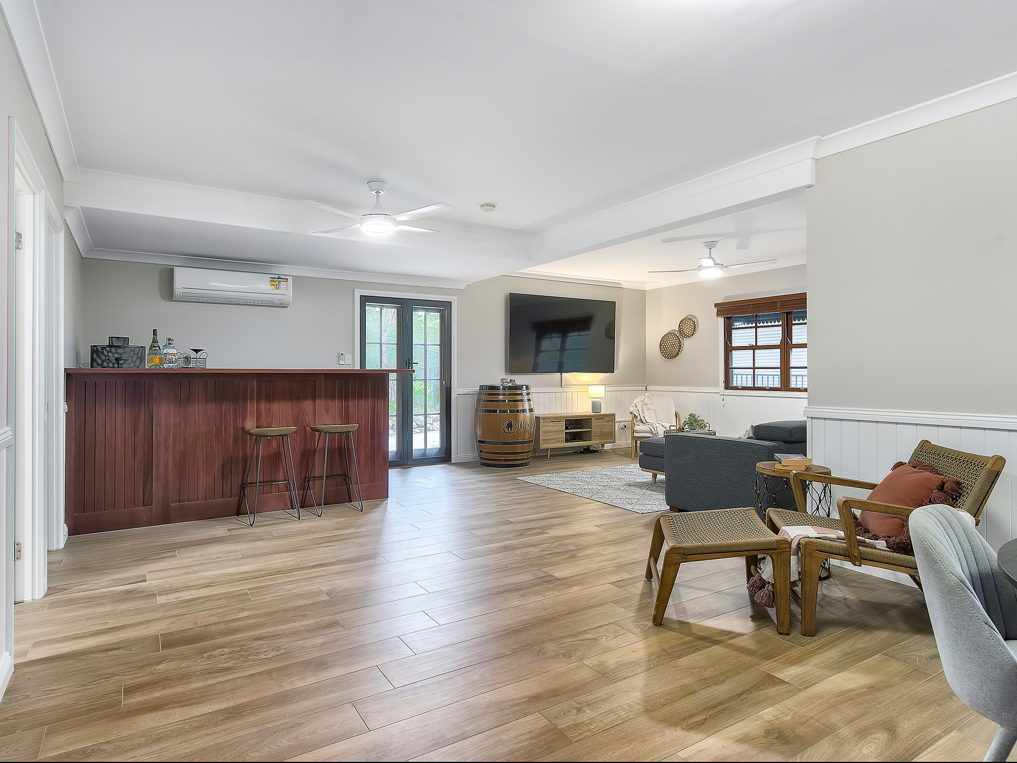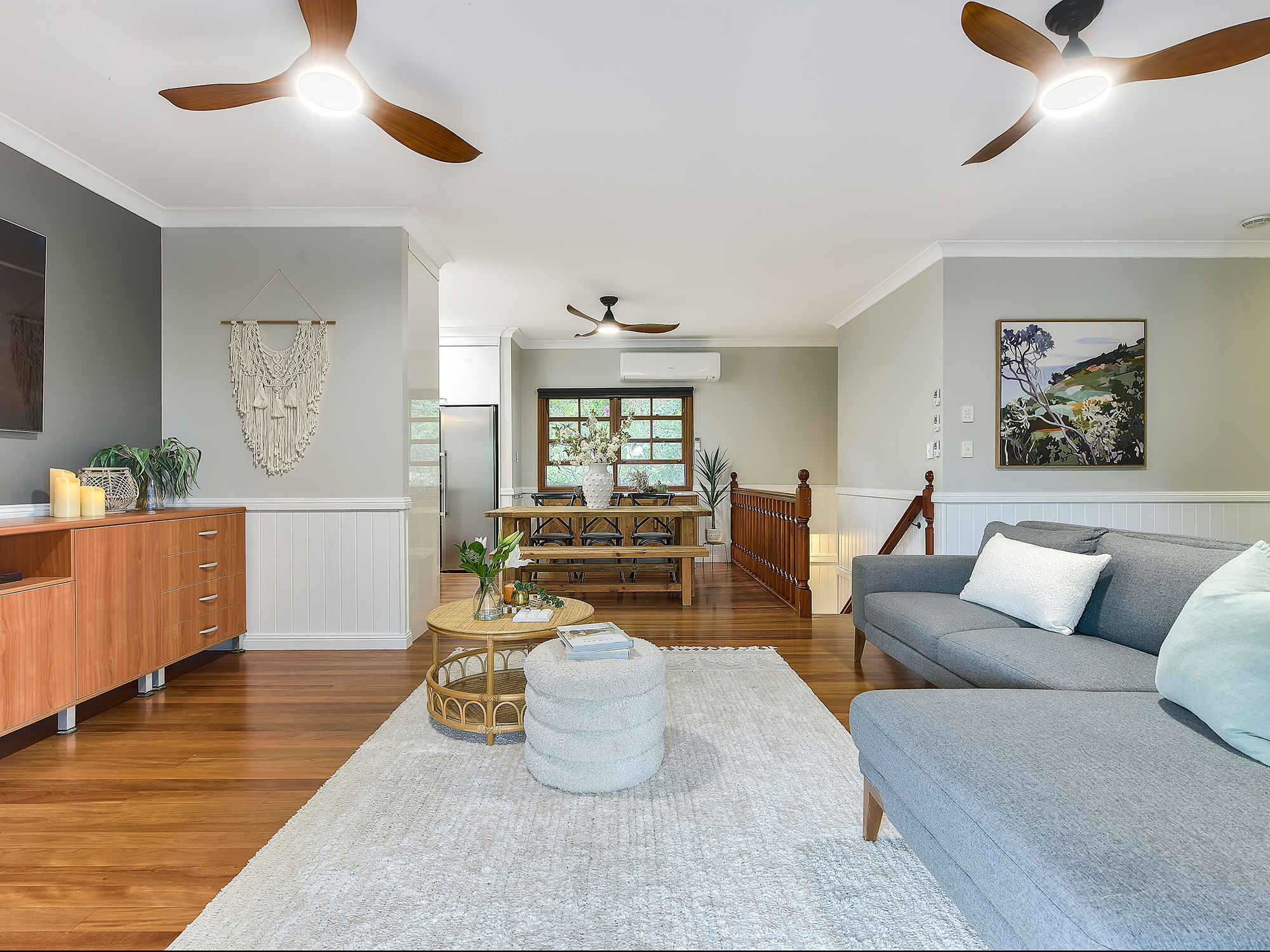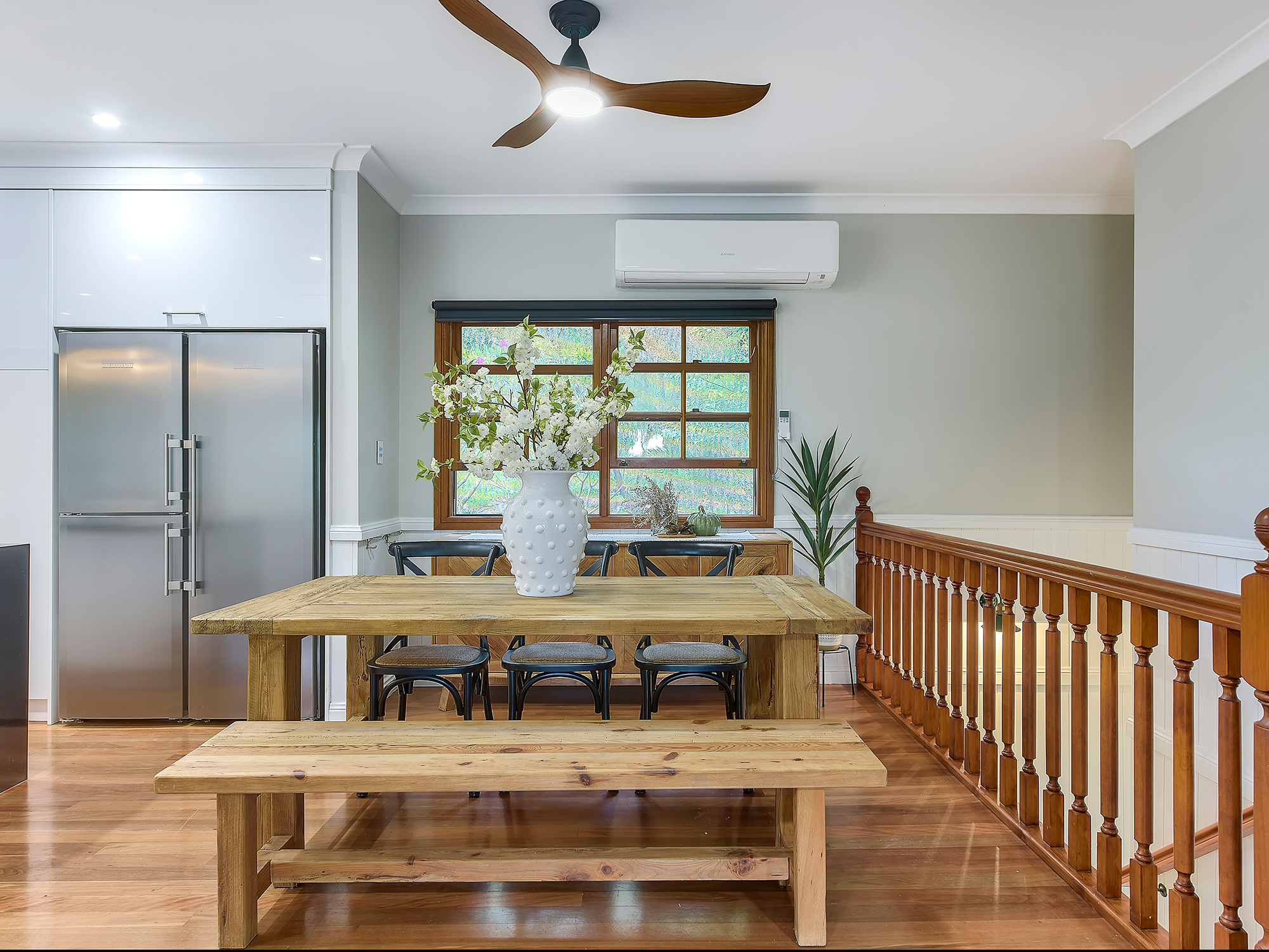 – Open-plan living and dining with wainscoting, air-conditioning and timber floors