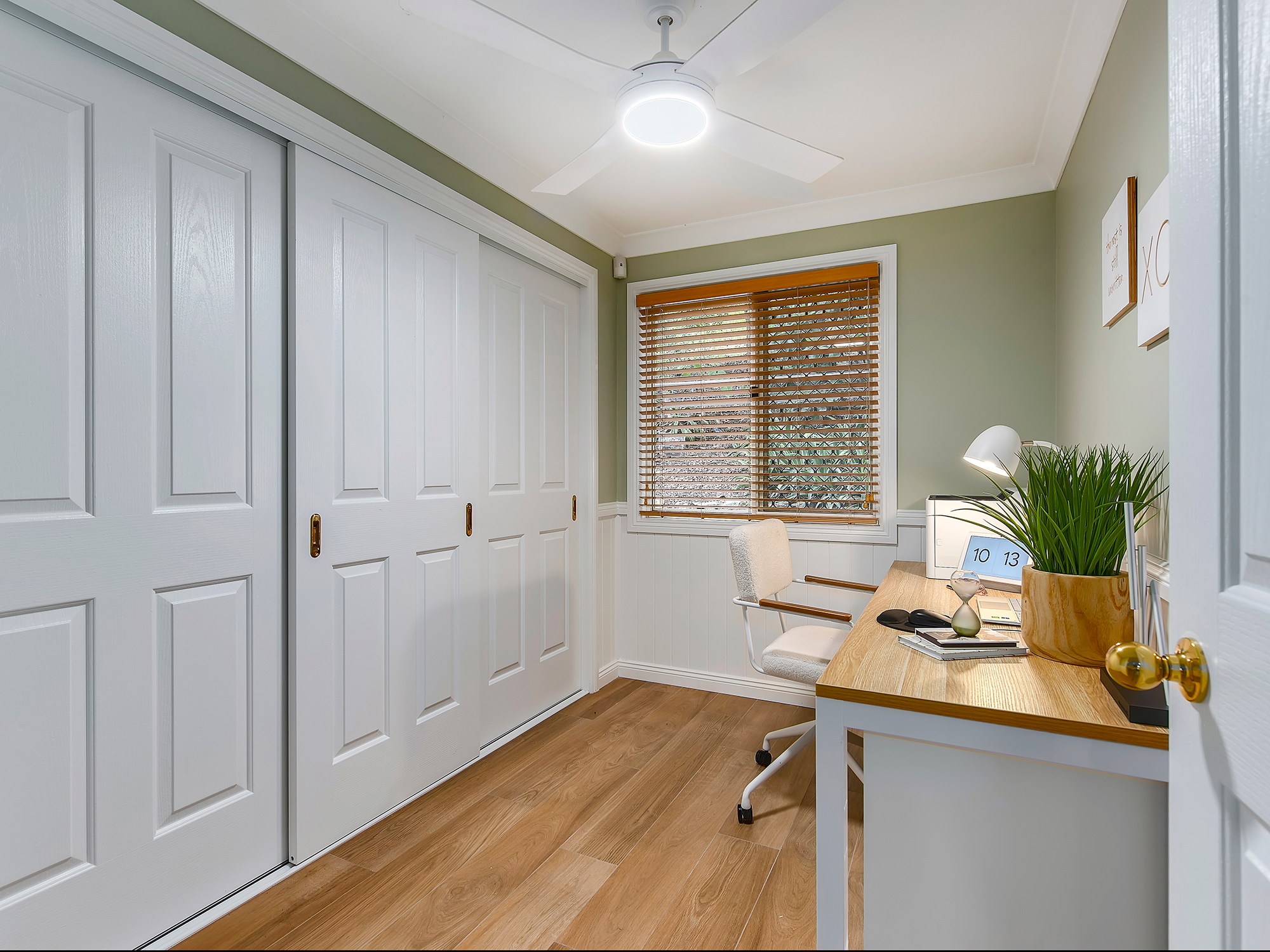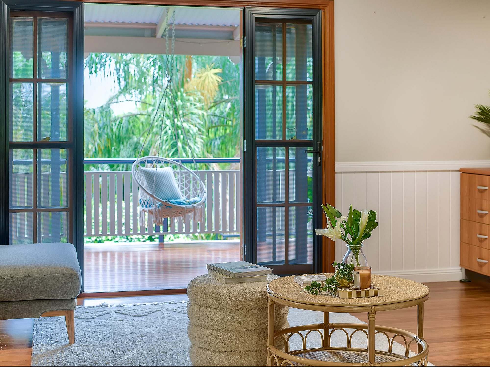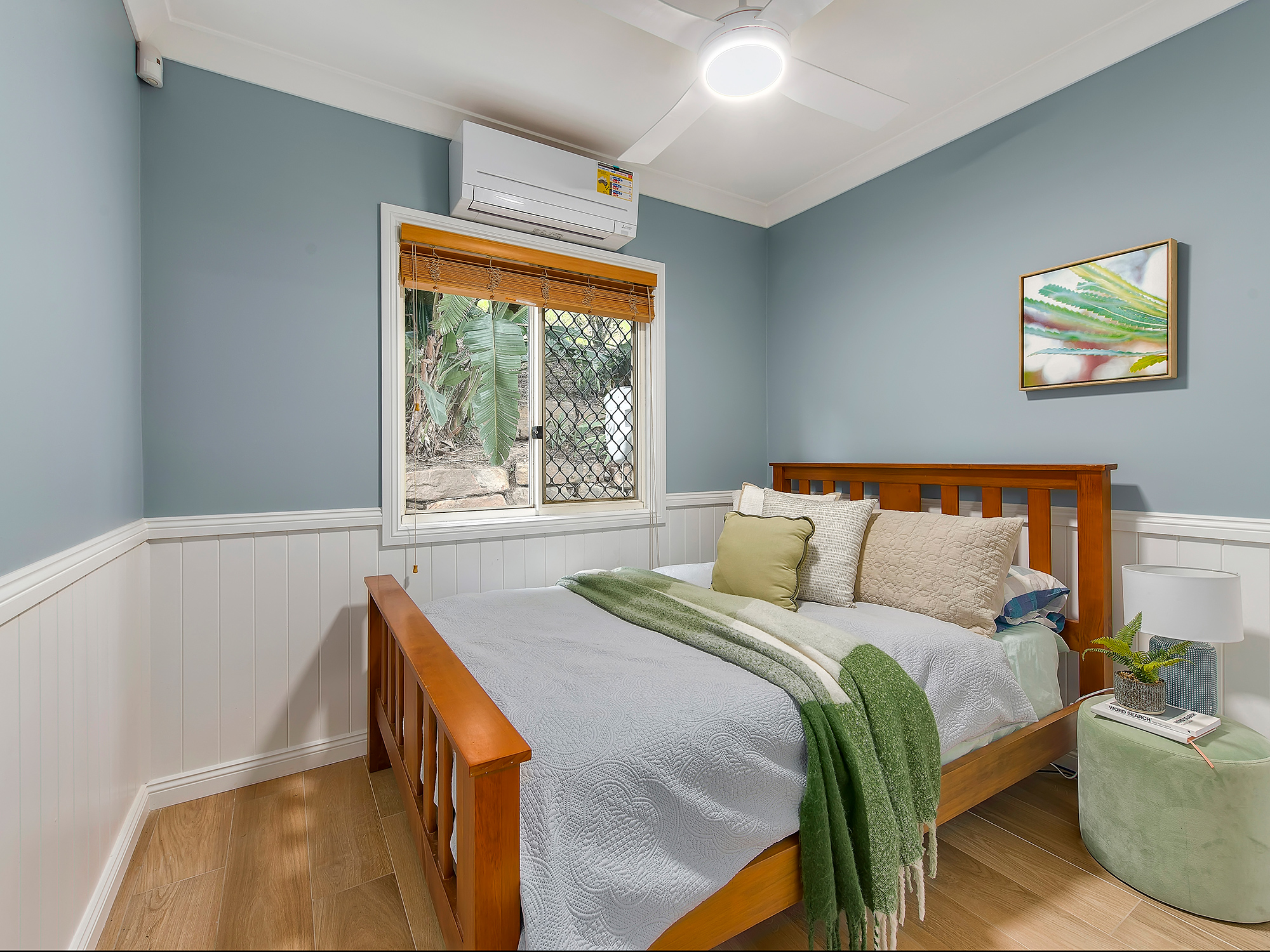 – Open-plan living and dining with wainscoting, air-conditioning and timber floors