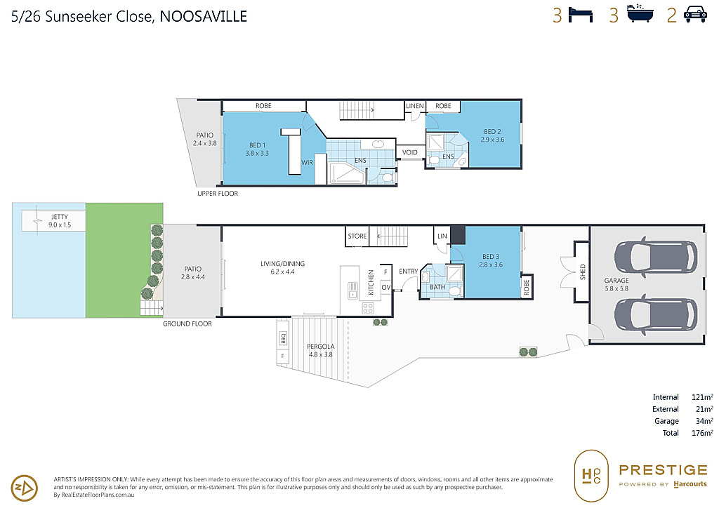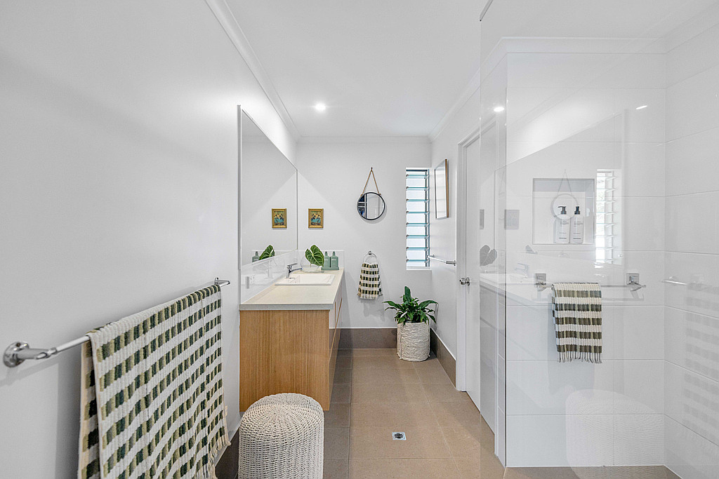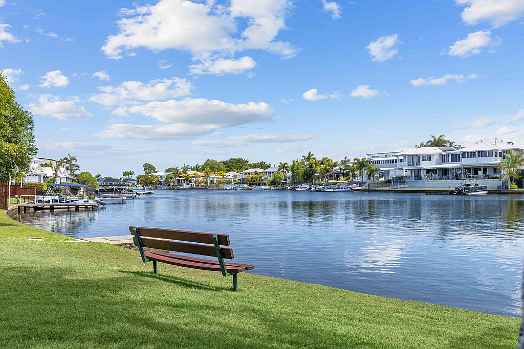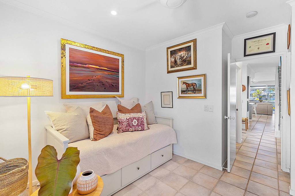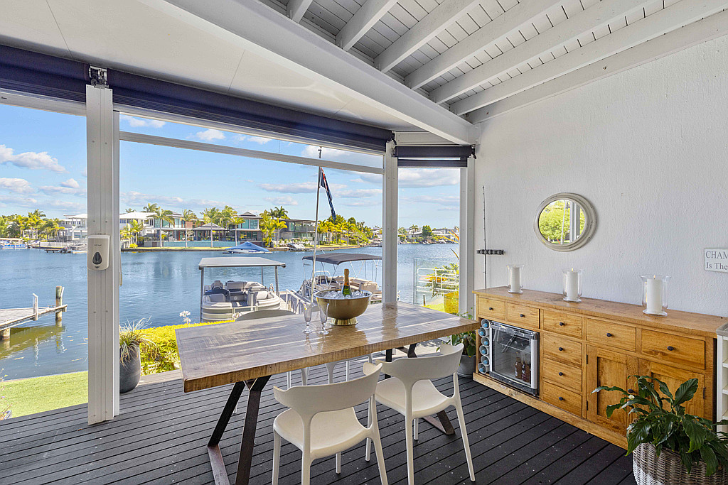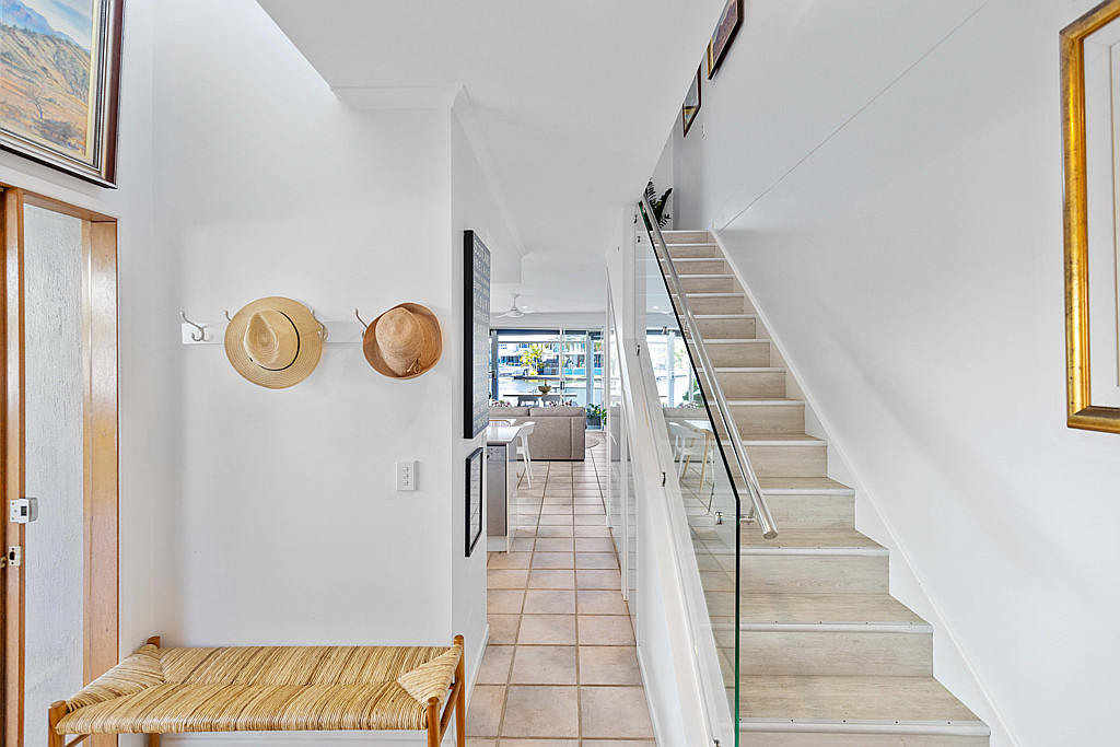 Open and fresh, the water invites you out to the covered entertainers’ deck only meters to the canal. A generously sized kitchen leads to dining and lounge. Sliding doors introduce a private courtyard with motorised louvered rooftop. The ground floor goes on to include a third bedroom or study and laundry room which doubles as a third bathroom or guest powder room.