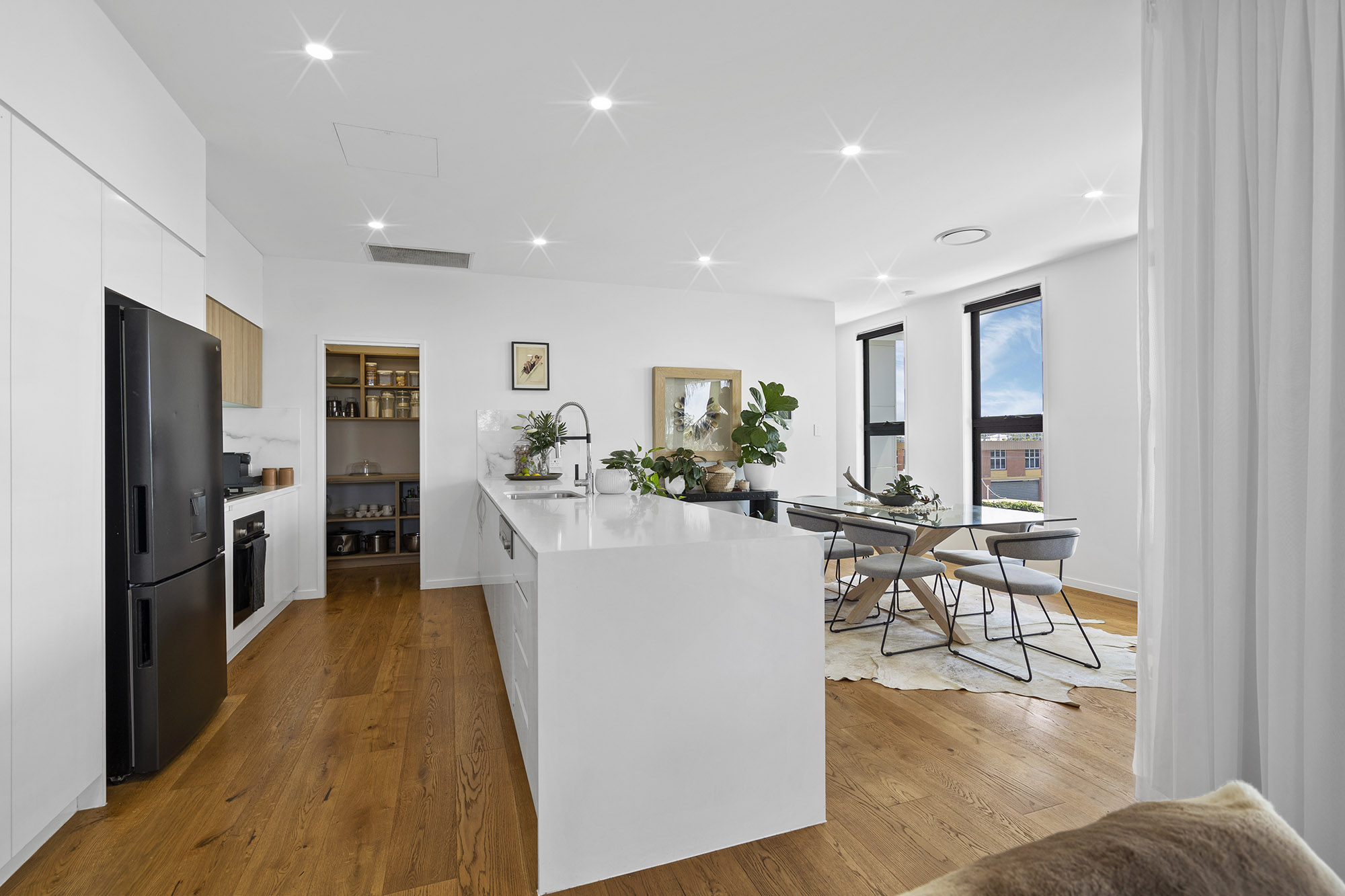 The centerpiece of this townhome is the second level, which boasts a spacious kitchen with an enormous stone waterfall bench top, a butler’s pantry, BOSCH gas stove and oven, and a dishwasher. The dining and living area is perfect for indoor/outdoor entertaining with direct access to the balcony through glass sliding doors. The second level also features a study nook, main bathroom, and two generously sized bedrooms with built-ins. On the third level, you will find the large master bedroom with a huge walk-in robe and ensuite.