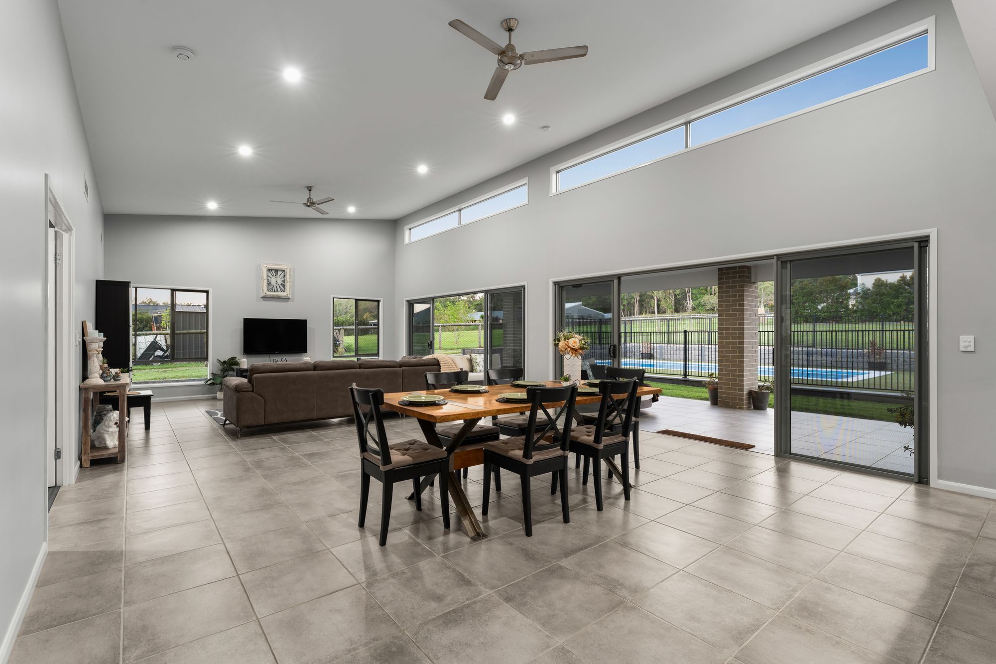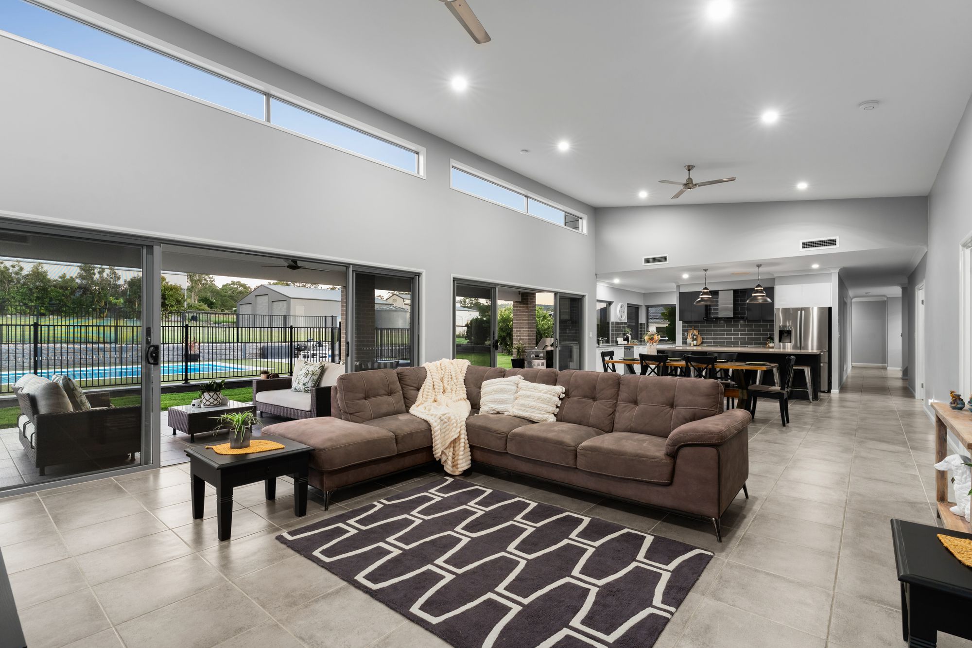 – Expansive open-plan living and dining area with striking raked ceilings, creating a bright and welcoming central hub of the home