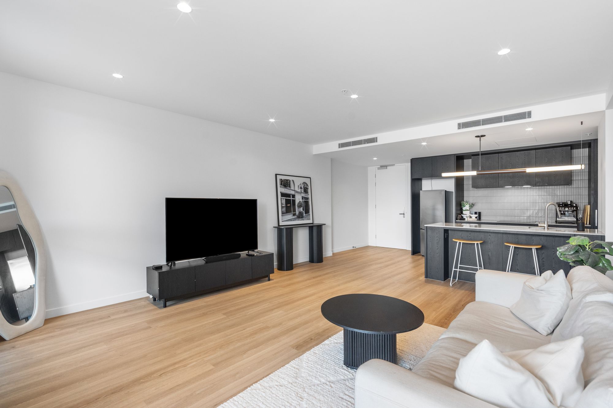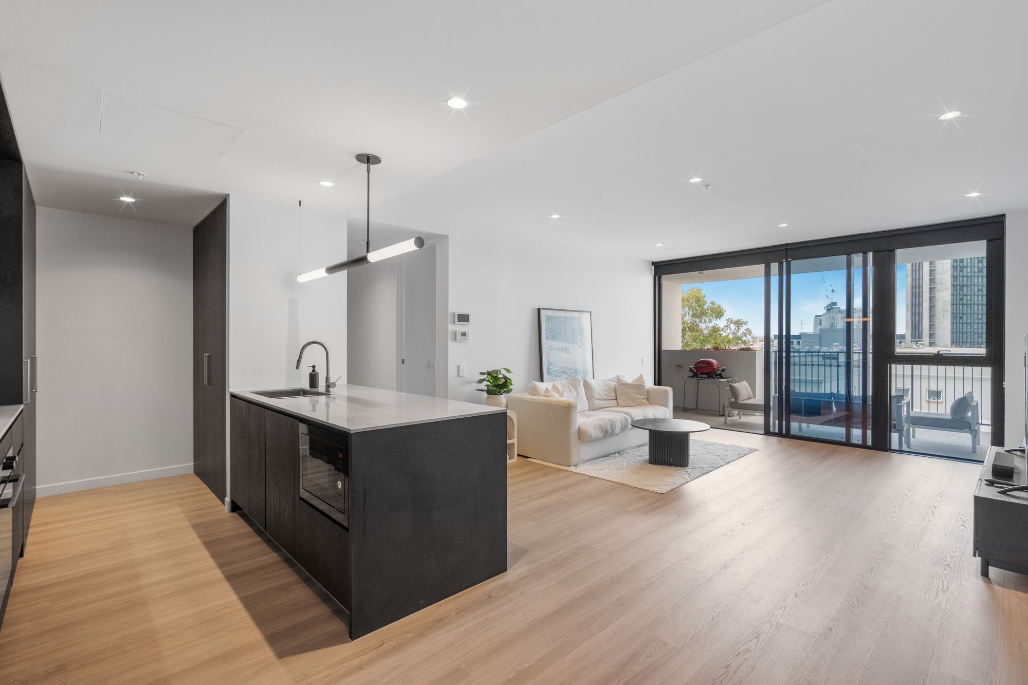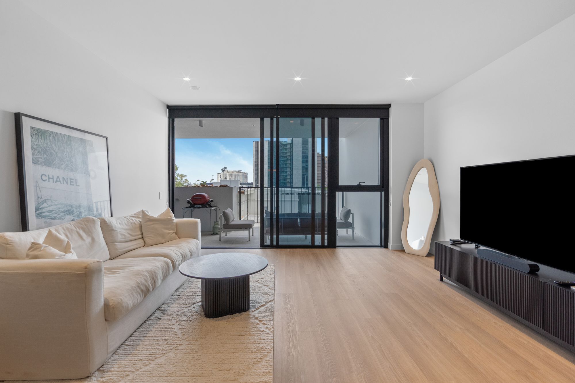 Completed in 2025, this 125m² designer apartment at 502/28 Lissner Street offers the ultimate inner-city sanctuary. The open-plan interior is fully climate-controlled with ducted air conditioning, featuring timber-look flooring and floor-to-ceiling glass that flows onto a massive 18m² private balcony. A chef’s kitchen serves as the home’s centrepiece, boasting stone benchtops, dark cabinetry, and premium appliances. Both bedrooms are generously sized, with the master featuring a private ensuite and built-in robes.