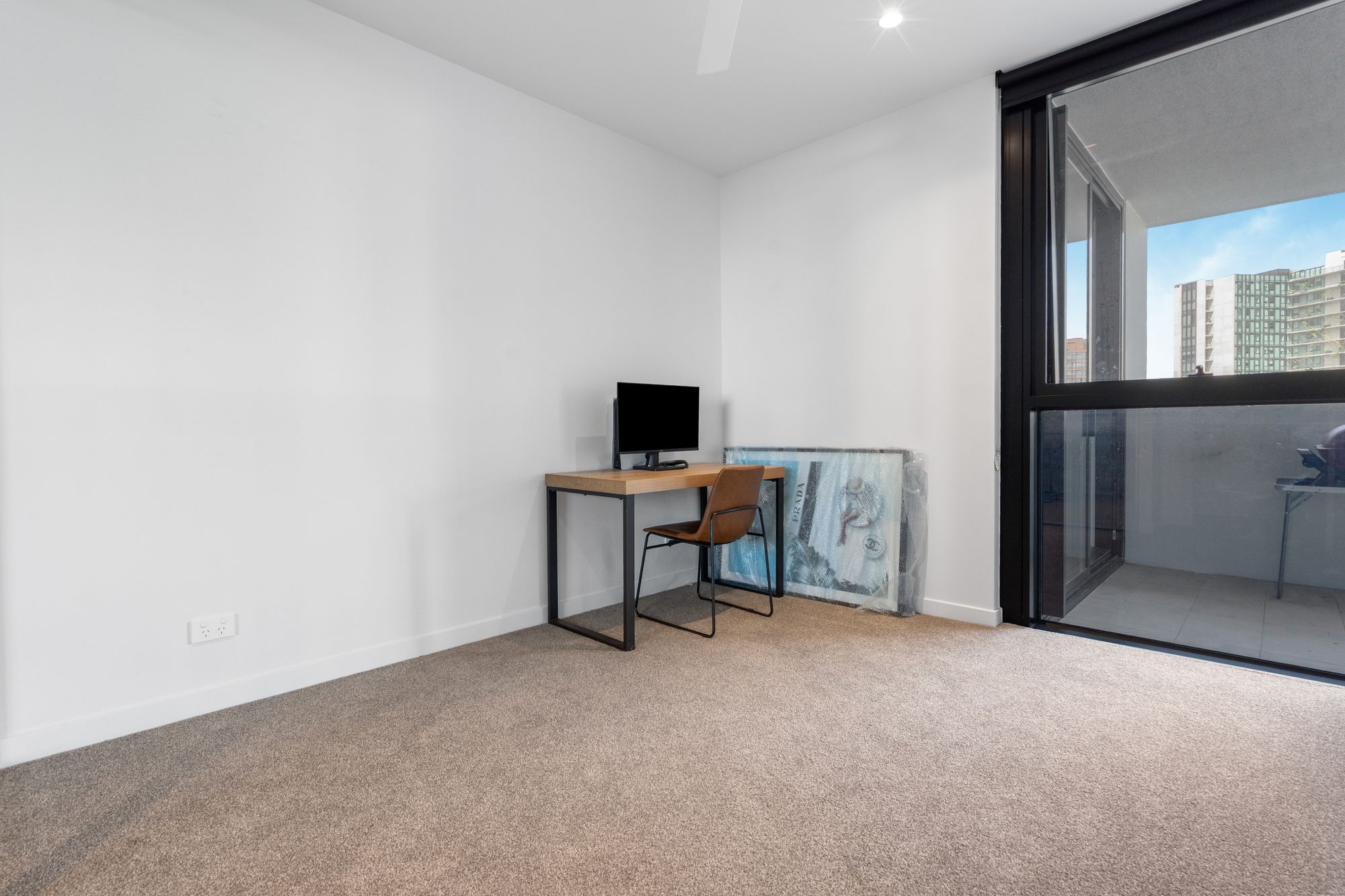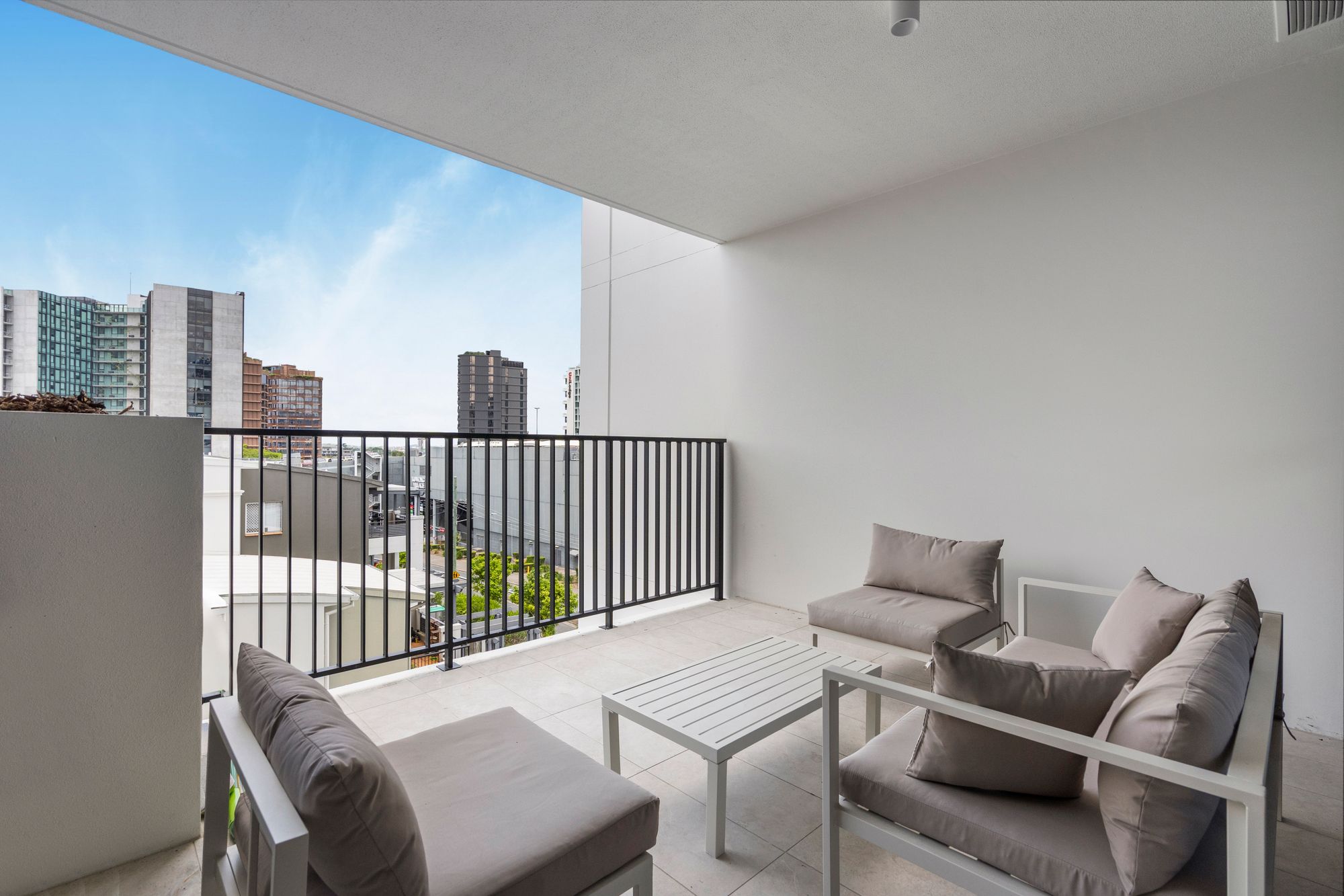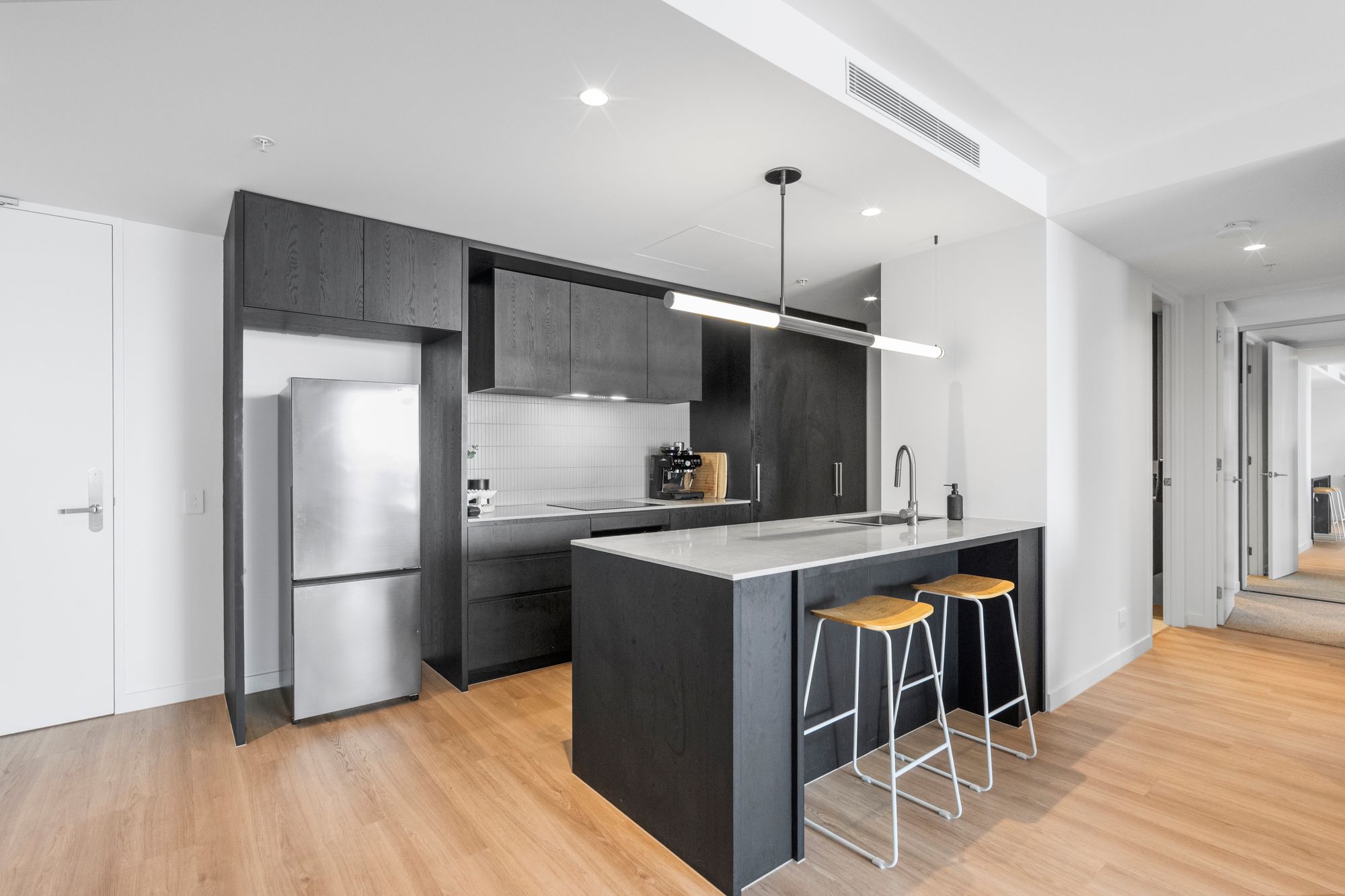 Completed in 2025, this 125m² designer apartment at 502/28 Lissner Street offers the ultimate inner-city sanctuary. The open-plan interior is fully climate-controlled with ducted air conditioning, featuring timber-look flooring and floor-to-ceiling glass that flows onto a massive 18m² private balcony. A chef’s kitchen serves as the home’s centrepiece, boasting stone benchtops, dark cabinetry, and premium appliances. Both bedrooms are generously sized, with the master featuring a private ensuite and built-in robes.