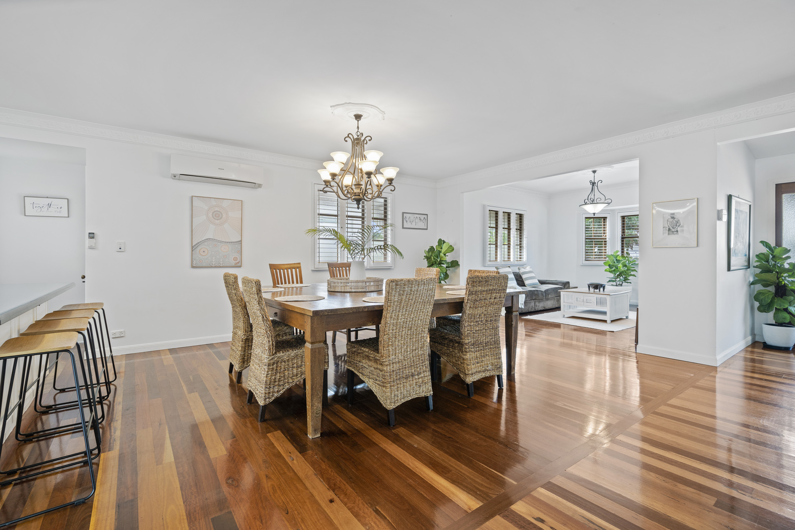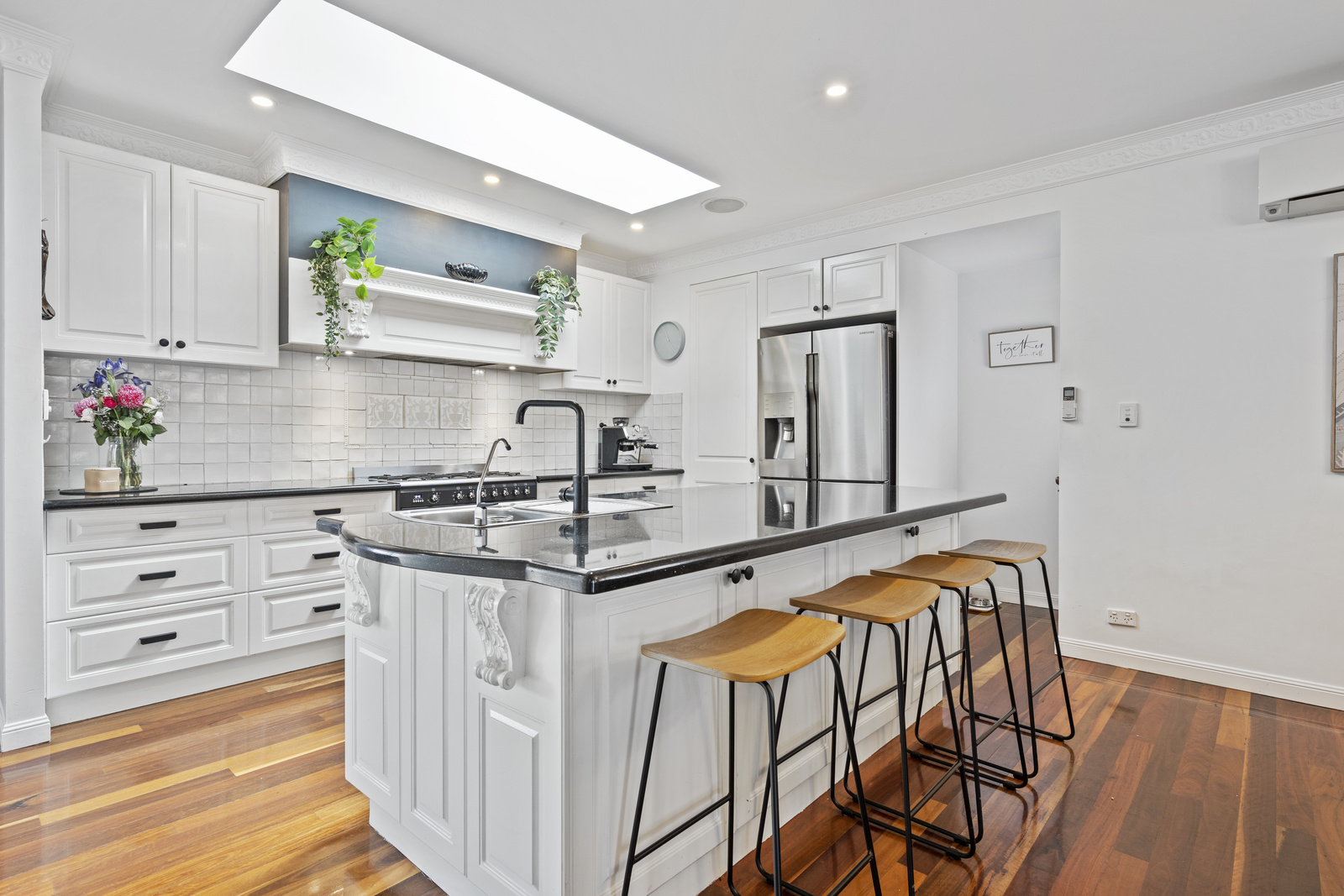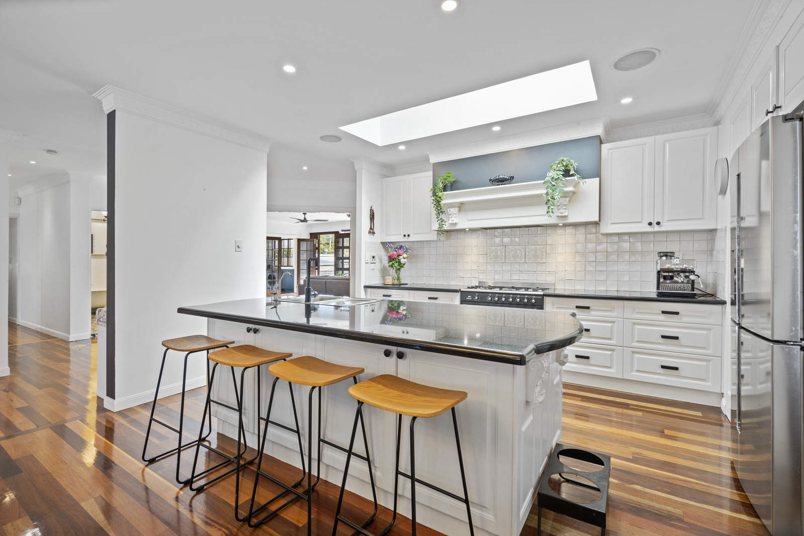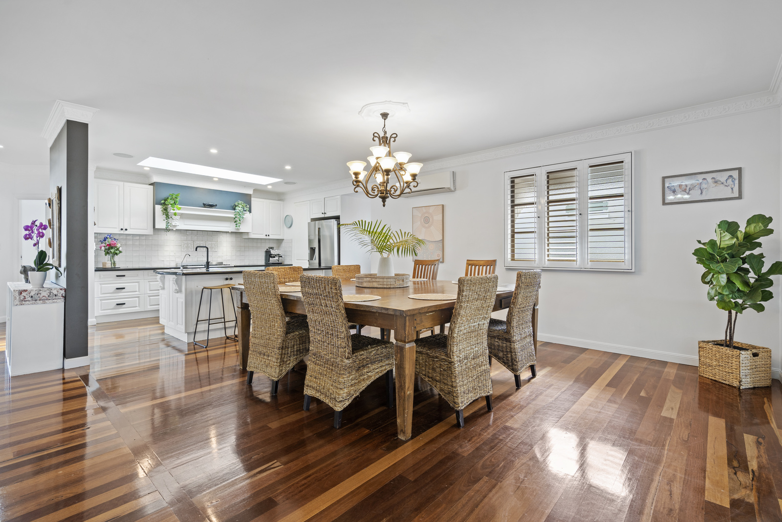 Traditional detailing blends effortlessly with stylish contemporary finishes throughout. Inside, an open-plan design living and dining spaces flow with ease, and the separate lounge providing a cosy space to relax and unwind. Air conditioning keeps the living areas cool through the heat of summer, while the layout encourages effortless indoor-outdoor living.