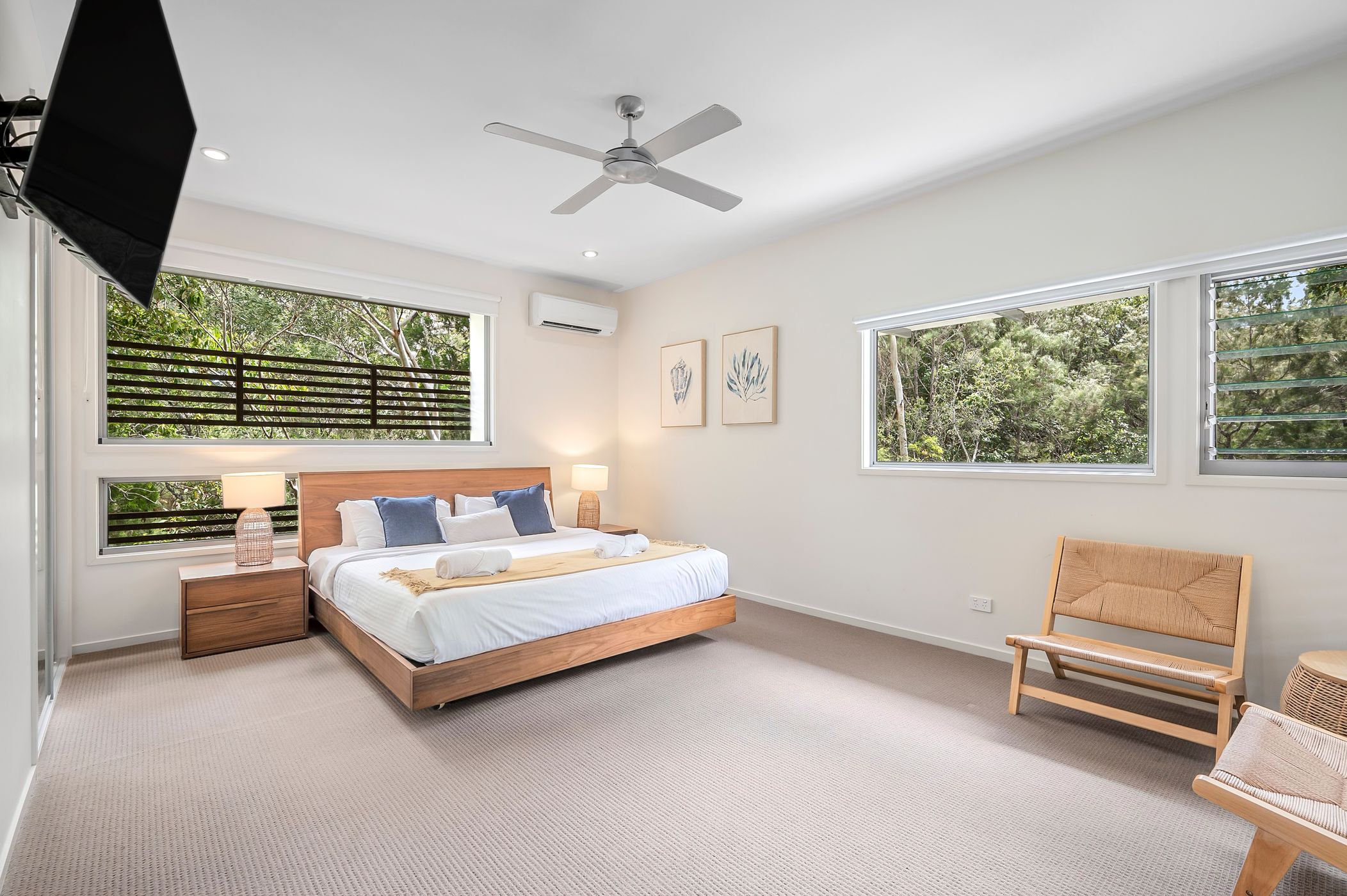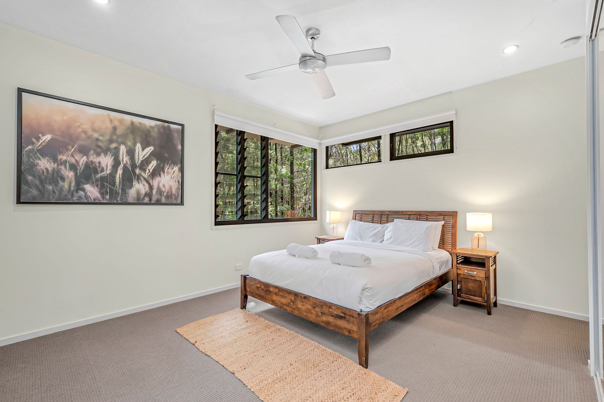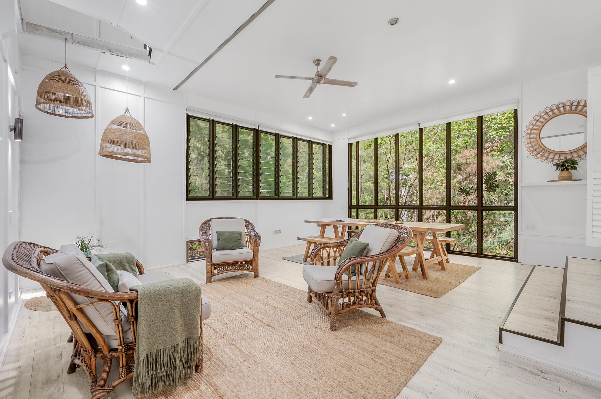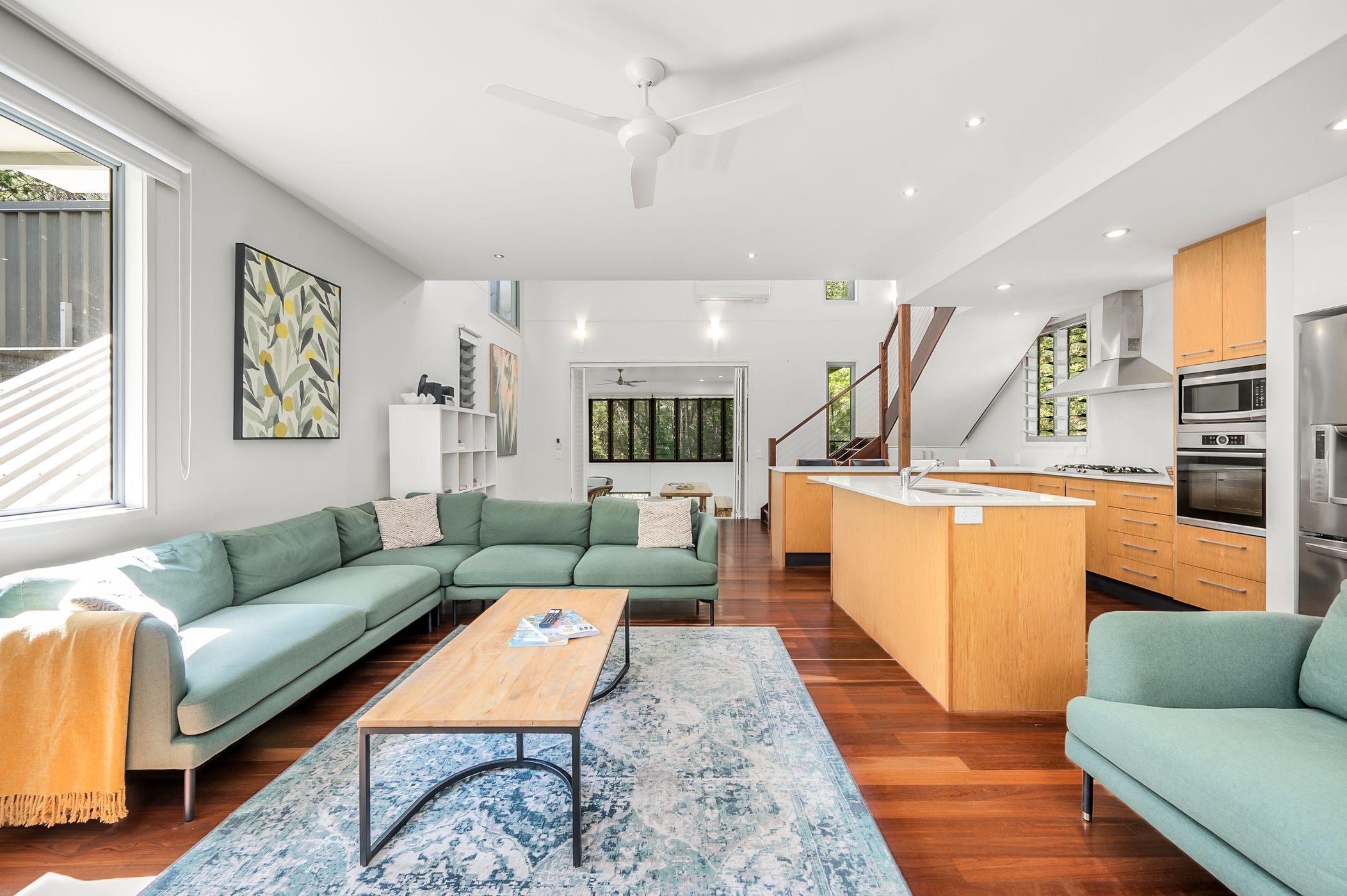 Flow effortlessly to the family area and casual dining, perfect for gatherings or quiet moments with a good book. High ceilings and screened louvres promote natural ventilation and allow you to savour the tranquil sounds of nature. Each bedroom is thoughtfully designed with built-in robes, ceiling fans, and privacy-enhancing external screens that provide a seamless connection to the lush bush surrounds.