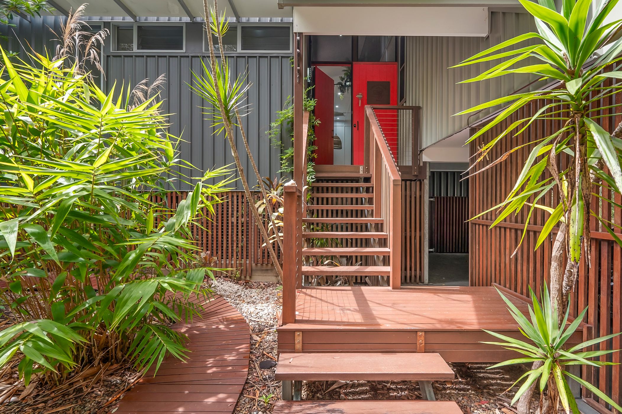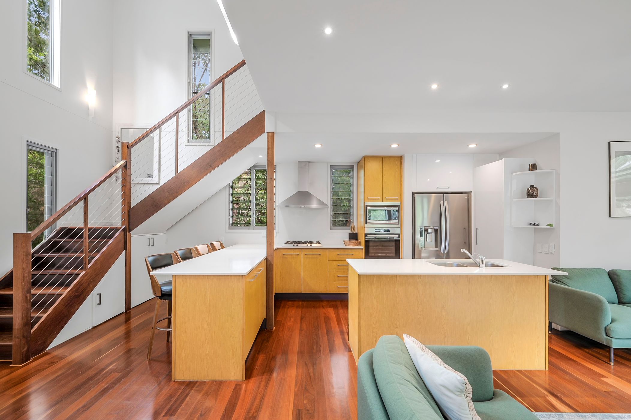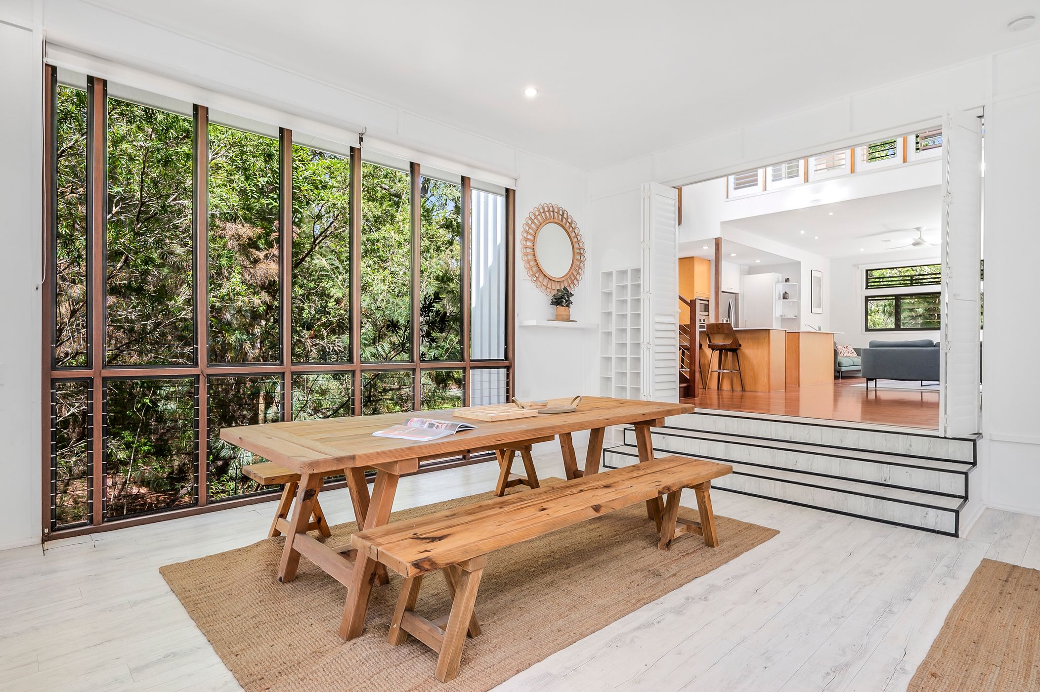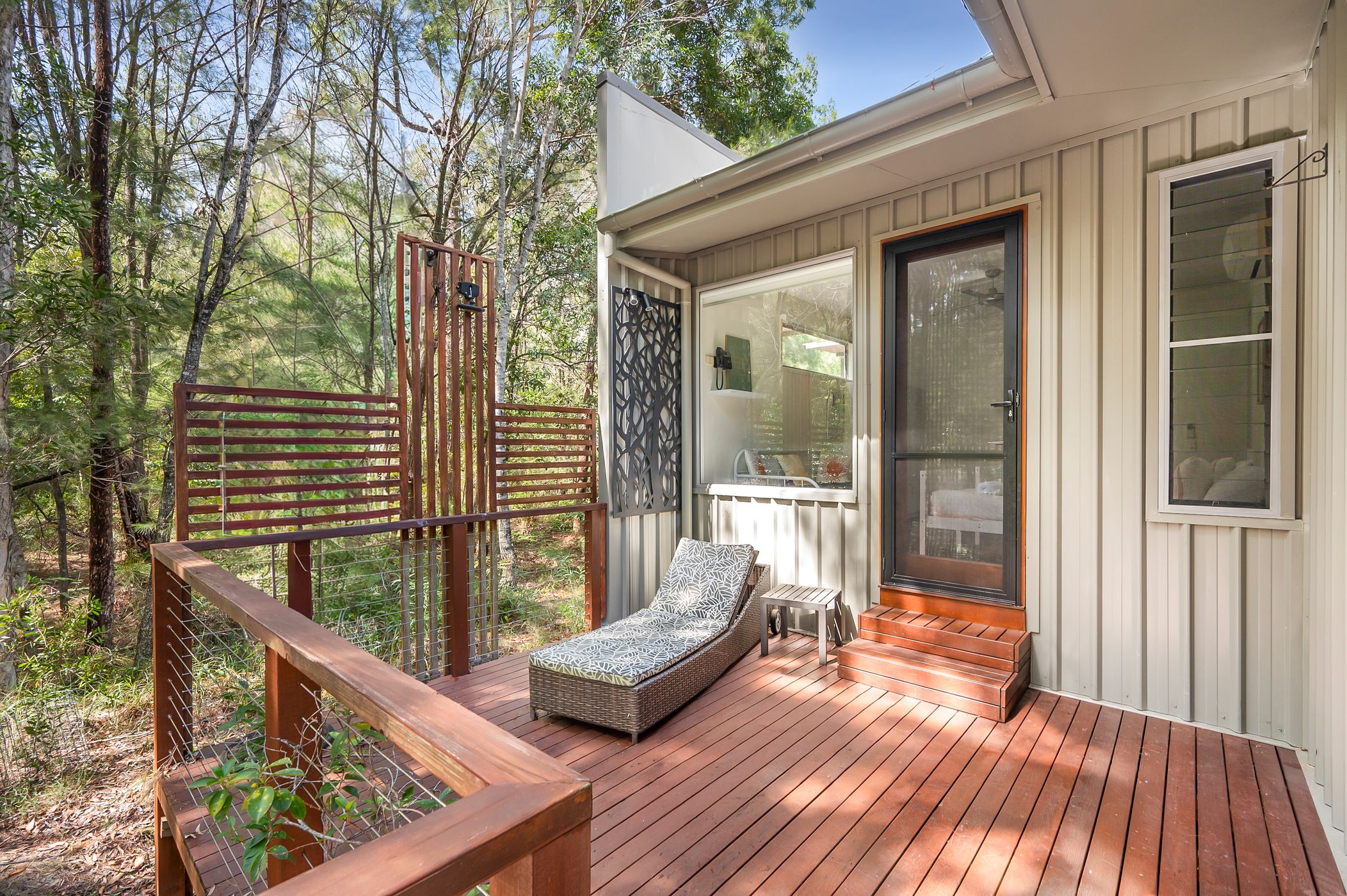 Flow effortlessly to the family area and casual dining, perfect for gatherings or quiet moments with a good book. High ceilings and screened louvres promote natural ventilation and allow you to savour the tranquil sounds of nature. Each bedroom is thoughtfully designed with built-in robes, ceiling fans, and privacy-enhancing external screens that provide a seamless connection to the lush bush surrounds.