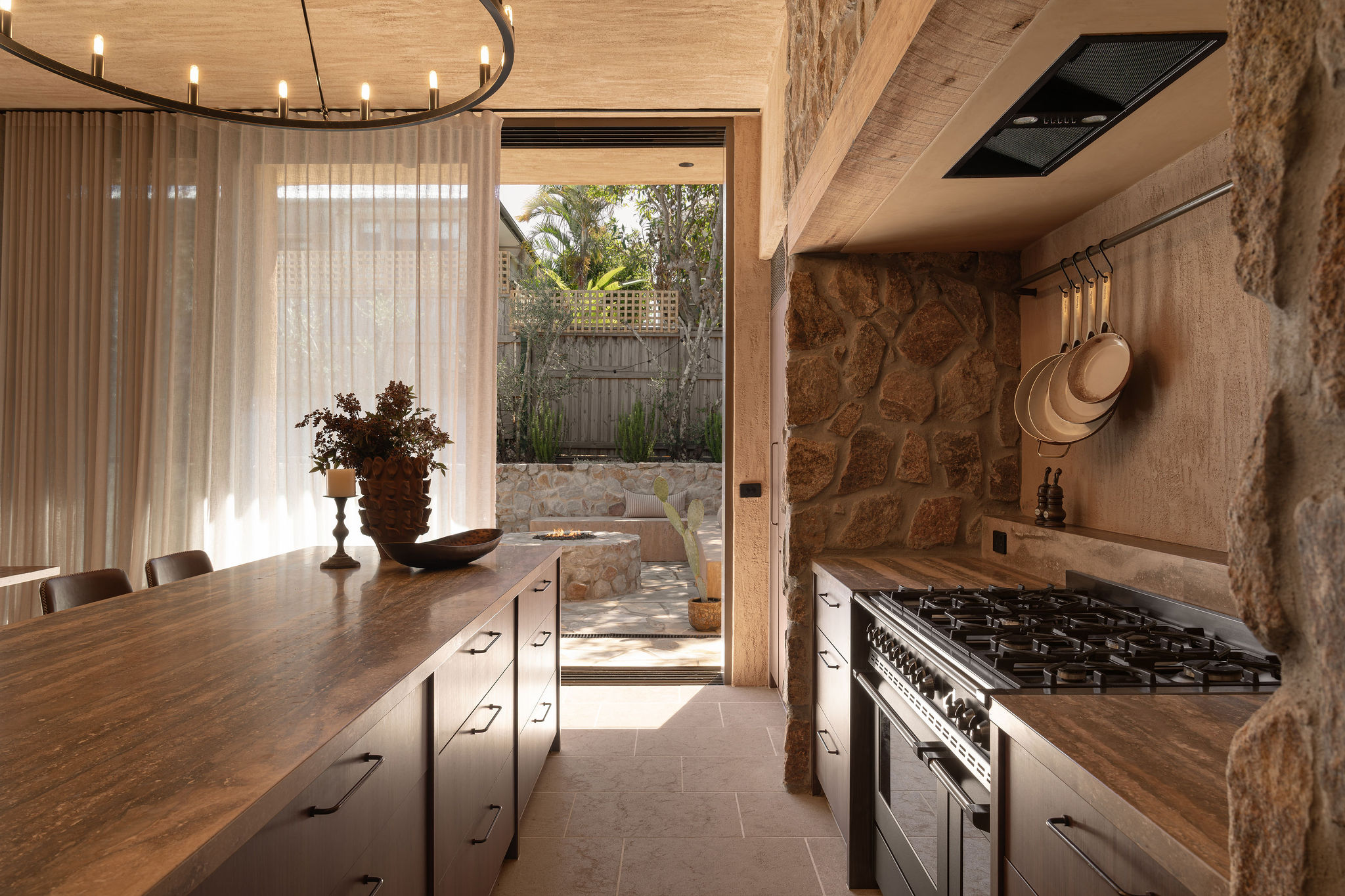 At the top of stairs reveals the ease of a single level home. A contemporary interpretation of a Mediterranean villa in the heart of Sunshine Beach: travertine stone benchtops, custom joinery with aged brass detailing, and a generous island bench designed as much for sharing communal meals as for everyday cooking. Every surface feels special, from the tactile hardware to the way the lighting pools softly over worktops and dining settings. While an intimate fireplace setting offers pause for slow evenings and long conversations.