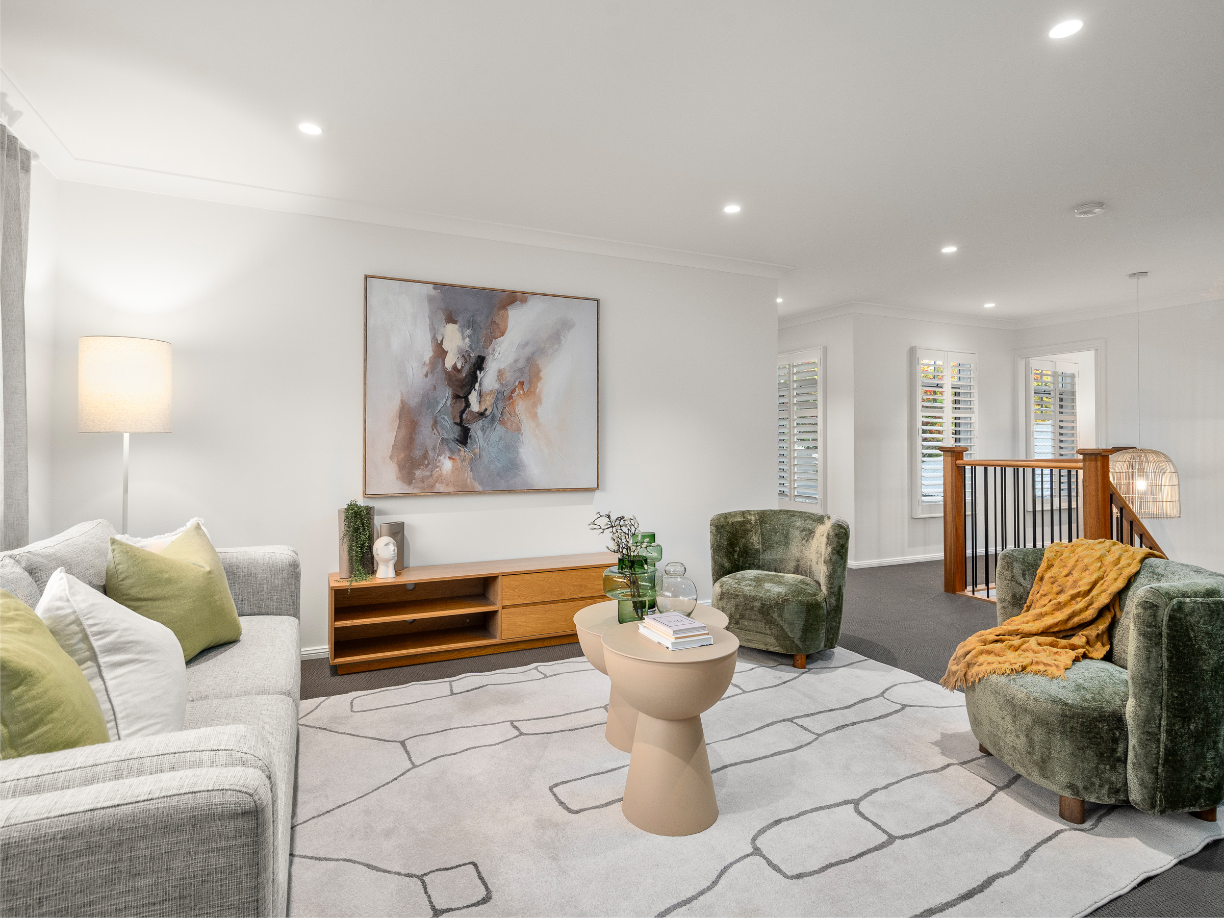 – Upstairs living area with feature timber staircase