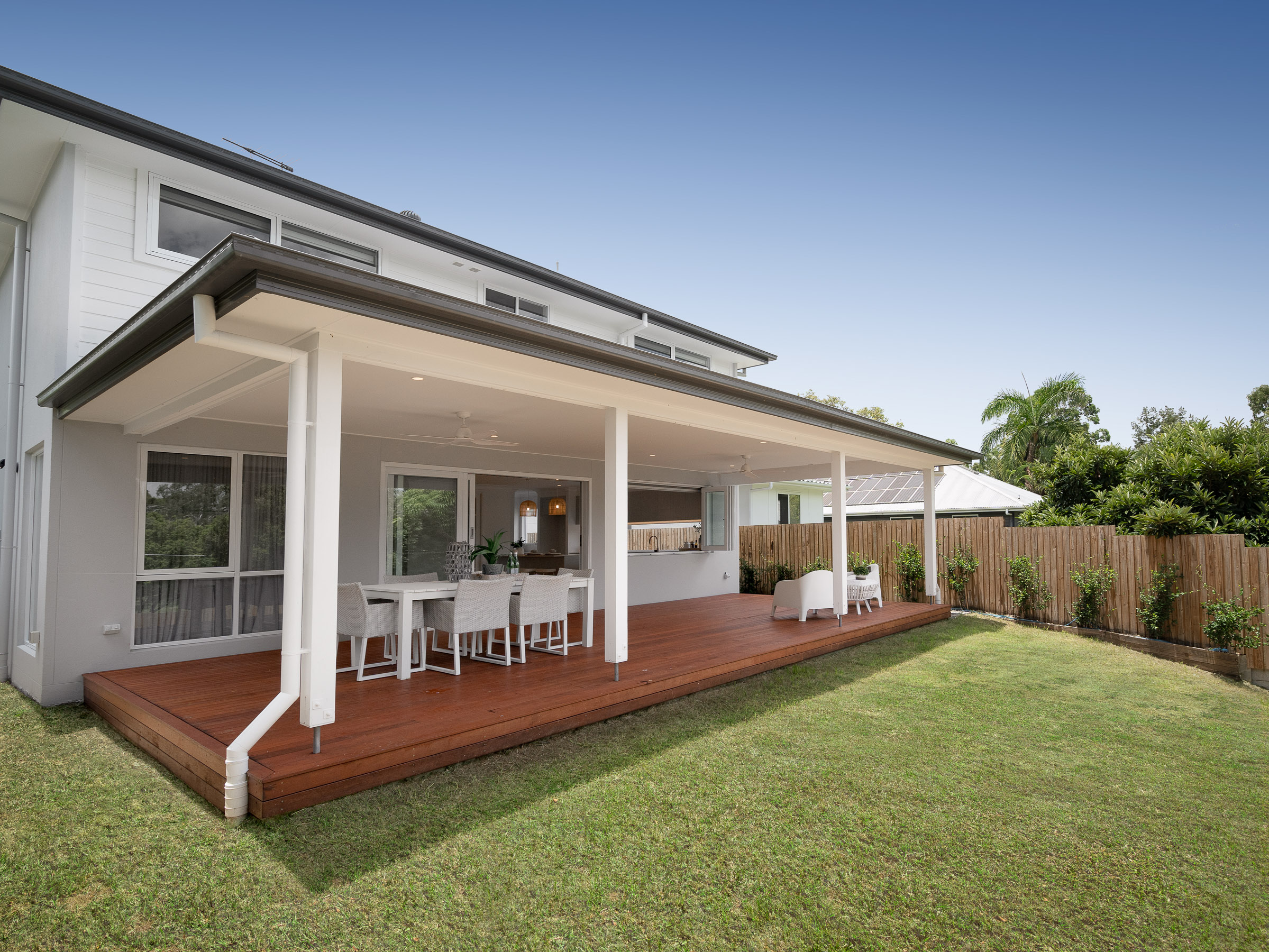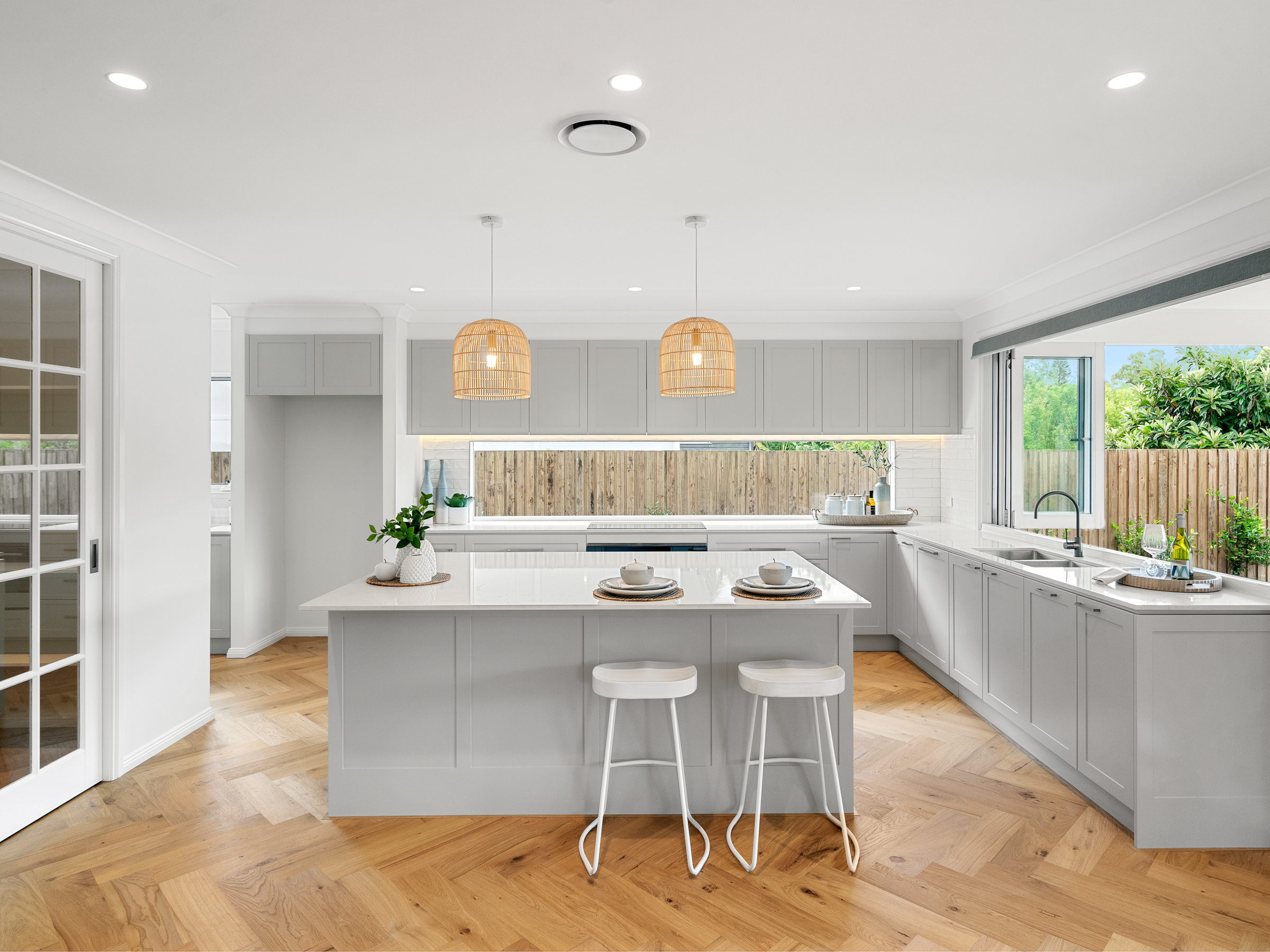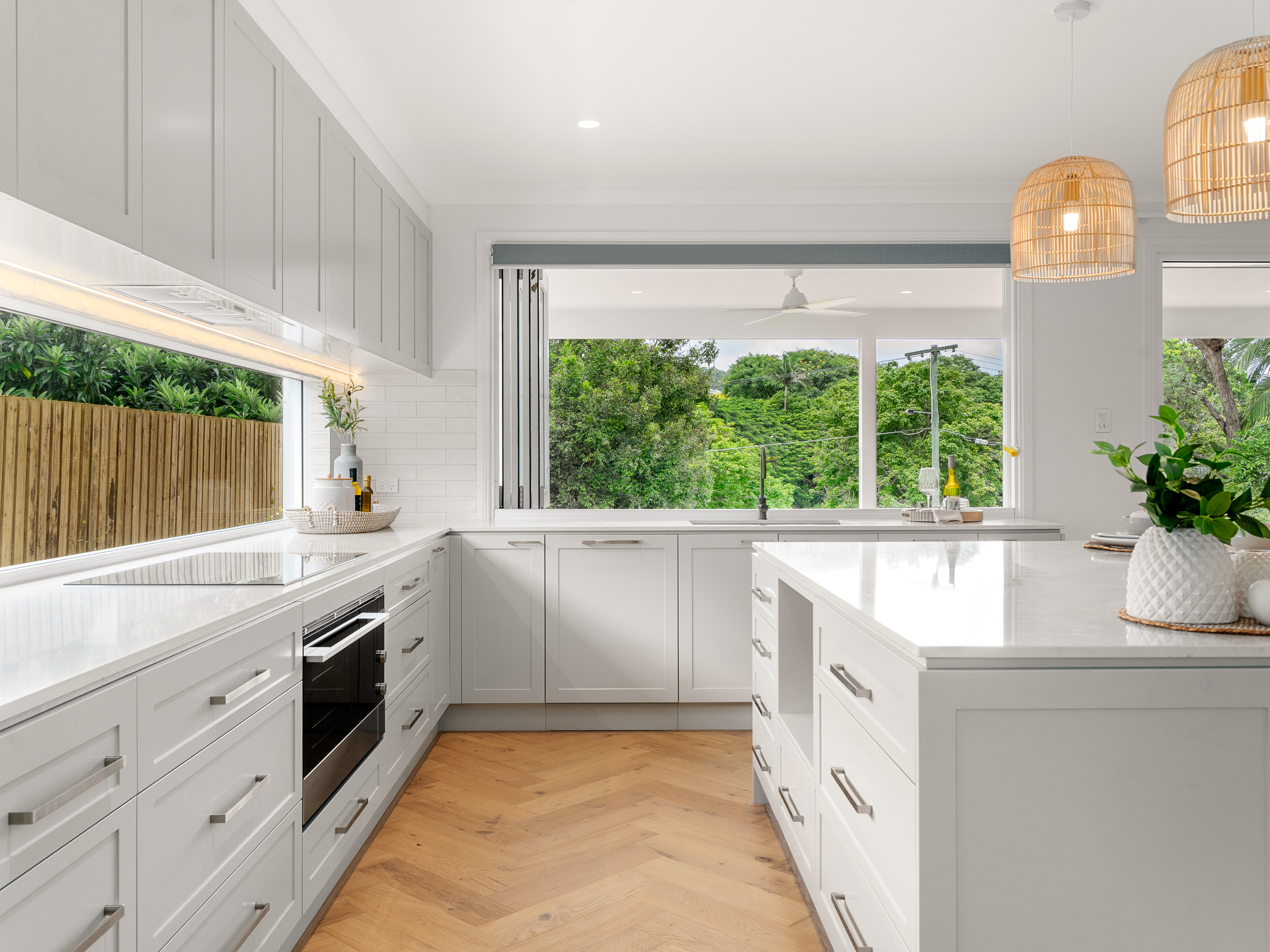 The interior style of the home embraces the elegant Coastal Hampton’s aesthetic, creating a serene and sophisticated atmosphere. The kitchen is a chef’s dream, equipped with Fisher & Paykel appliances, including a 900mm oven, induction cooktop, an integrated dishwasher, and an extra dishwasher included in the butler’s pantry. Complementing these high-end features are a spacious walk-in-pantry & huge island benchtop providing both functionality and style. Bi-fold windows open up to the gorgeous back deck offering the perfect setting for outdoor entertaining.