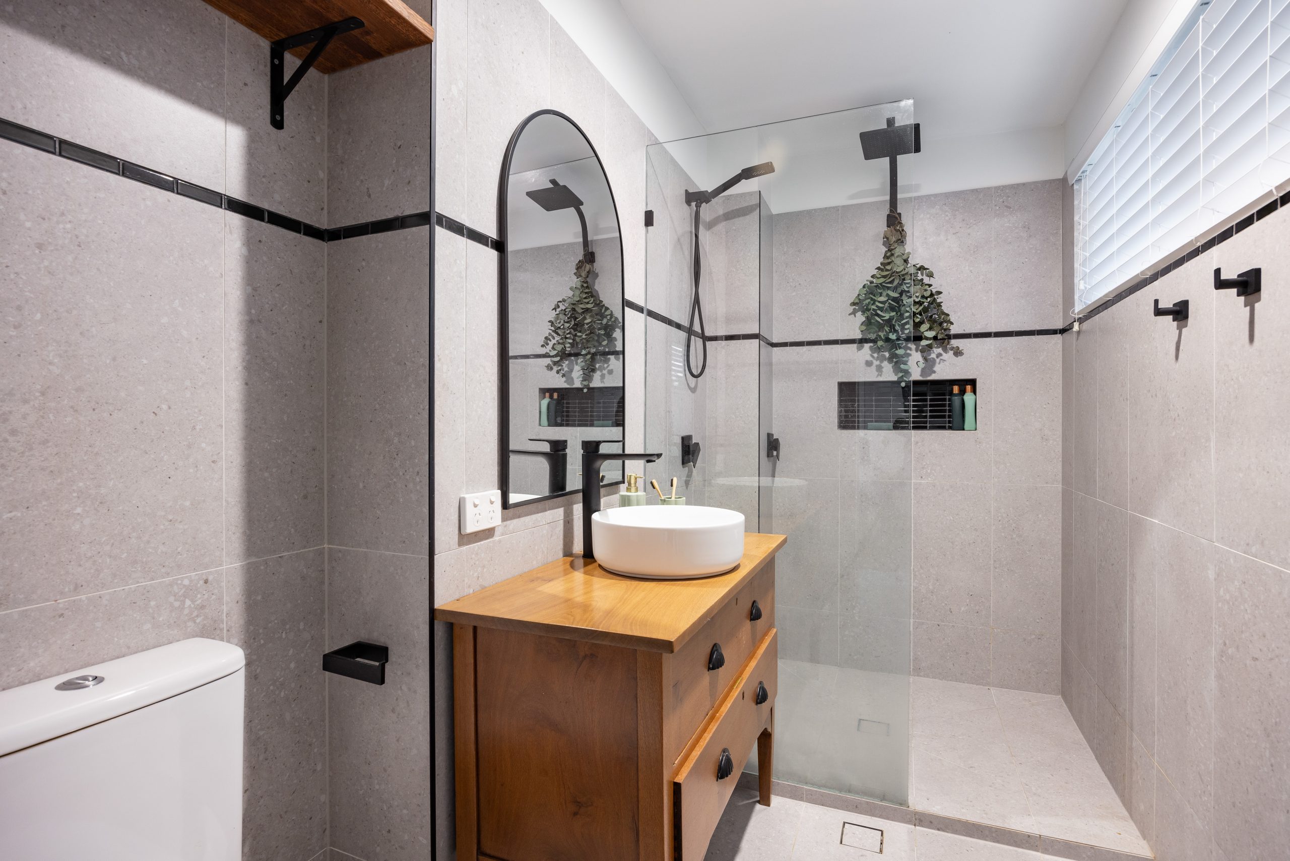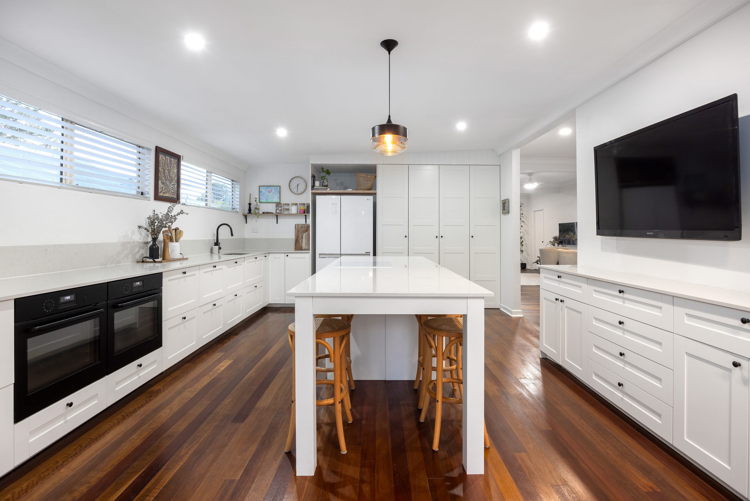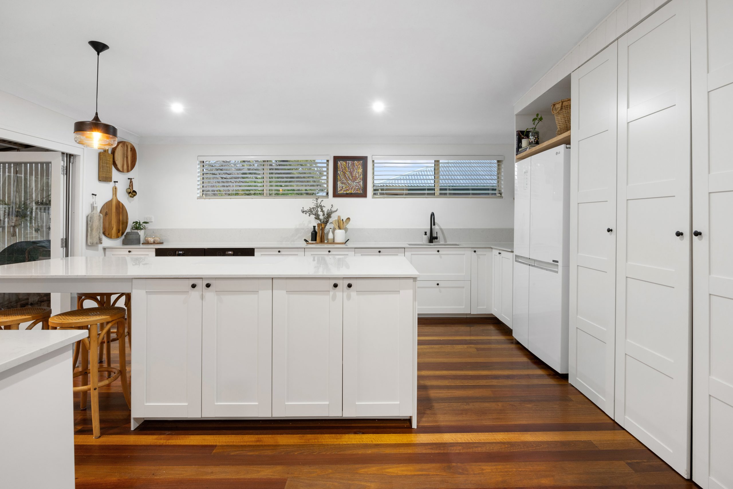 The well-designed floor plan offers expansive and inviting living spaces throughout. High ceilings not only enhance the aesthetic appeal but also invite refreshing breezes throughout the open layout. The integration of living, kitchen, and dining areas ensures effortless connectivity and a lively atmosphere, both indoors and outdoors. An airconditioned central lounge and dining area serve as one of the home’s focal points, flanked by four bedrooms and two bathrooms. The master bedroom features a walk in robe, fan and a new well-appointed ensuite, while the remaining bedrooms offer built-in robes and a couple with fans, serviced by a well-appointed family bathroom with separate bath and shower. The light-filled, custom-built kitchen overlooks both the internal and external living spaces, designed for culinary enthusiasts with a large central stone island bench with one end designed for a breakfast bar style seating, ample cupboards and a large walk in style pantry with a great selection of draws and shelves and another sink as well.