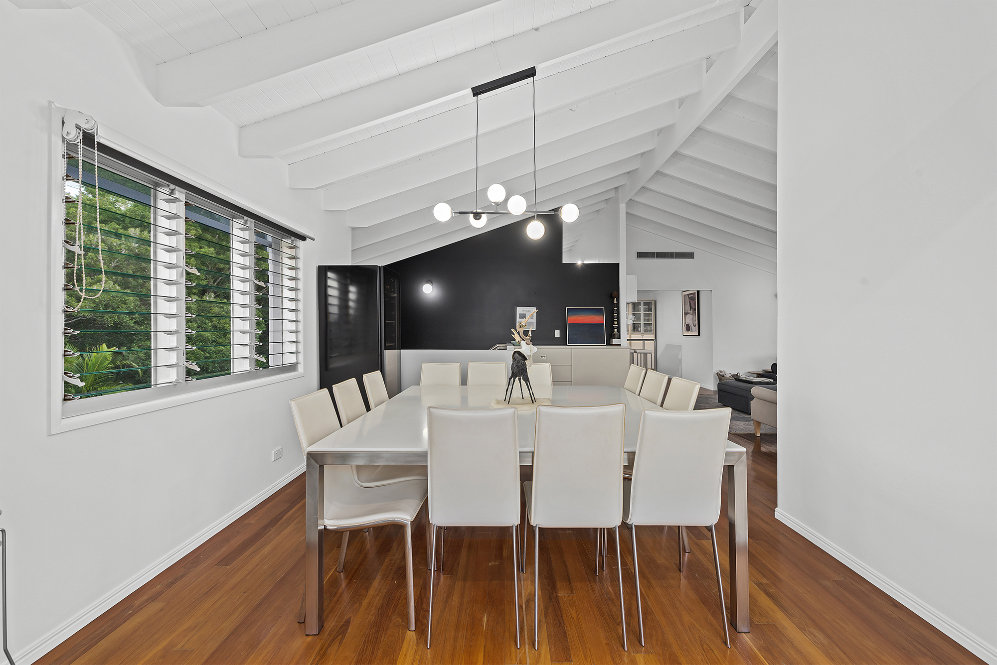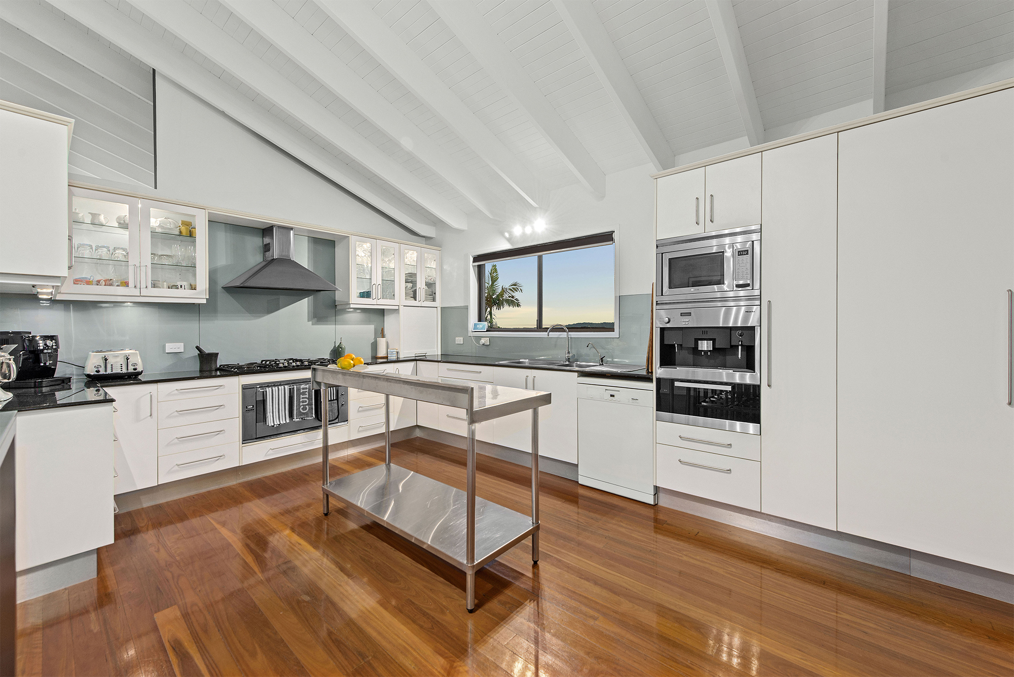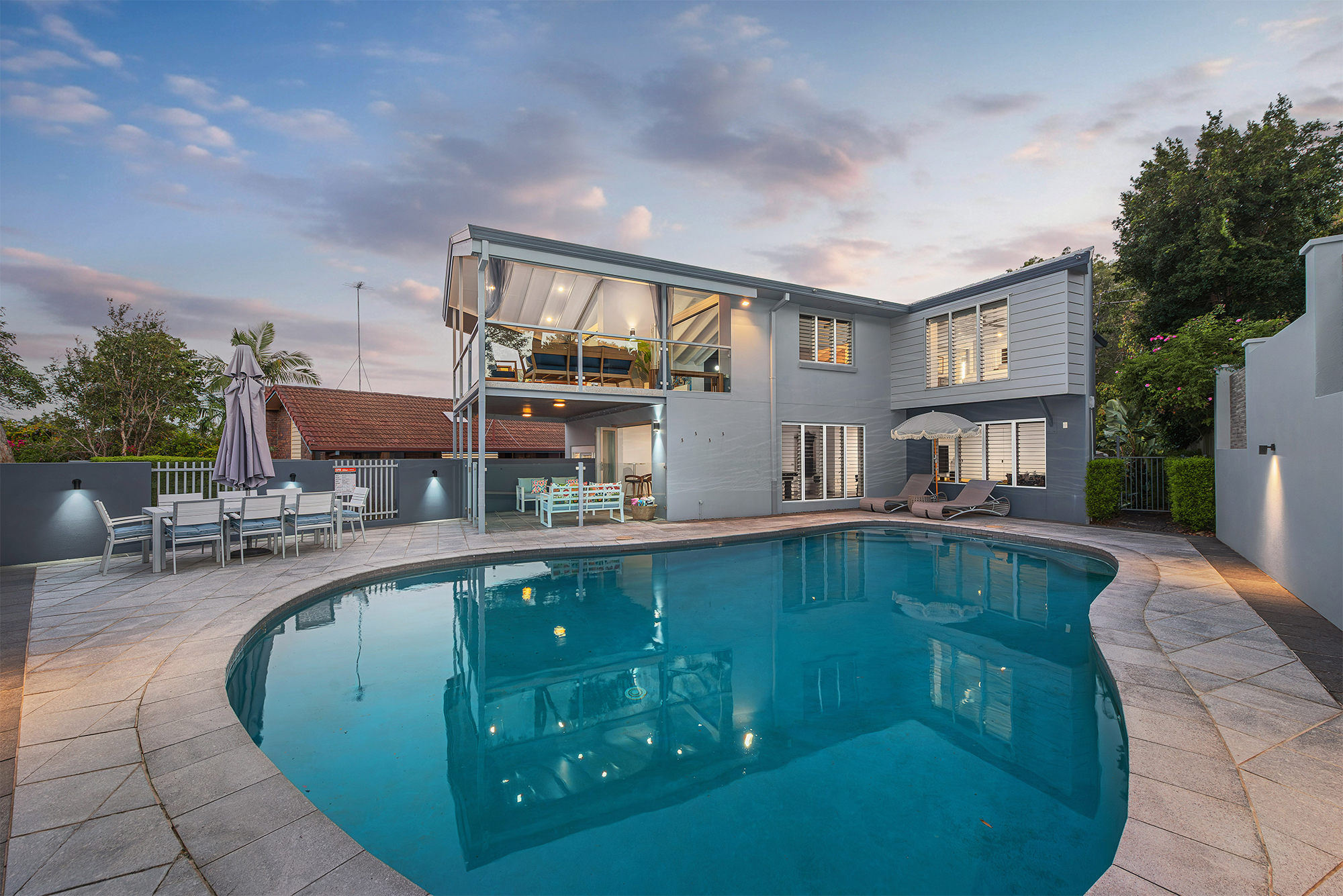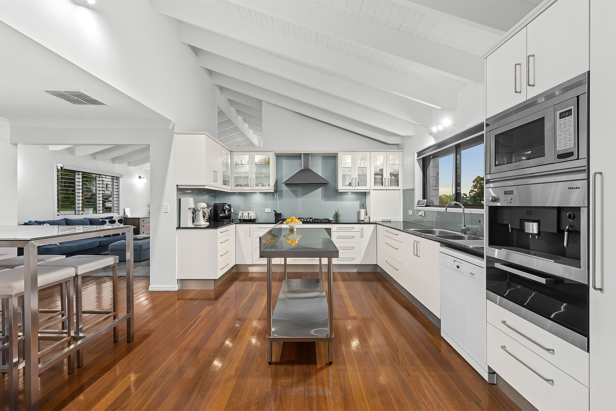 The upper level is devoted to relaxed living and entertaining, with polished timber floors, raked ceilings and a light-filled open plan lounge and dining area flowing seamlessly to a covered alfresco balcony. From here enjoy easterly treetop outlooks, views to the reserve at the rear and the inviting pool below. The kitchen is both beautiful and brilliantly appointed with a gas cooktop, multiple ovens, exceptional storage and adjacent casual meals area.