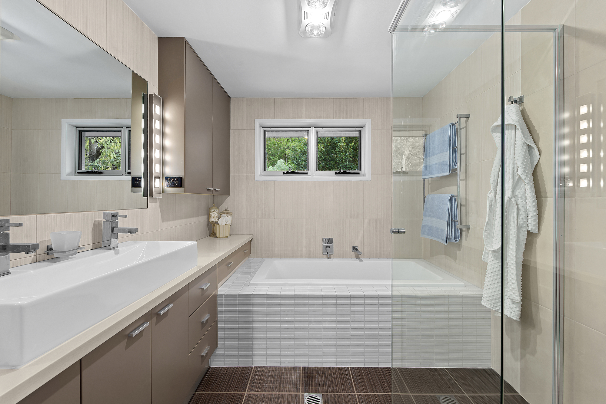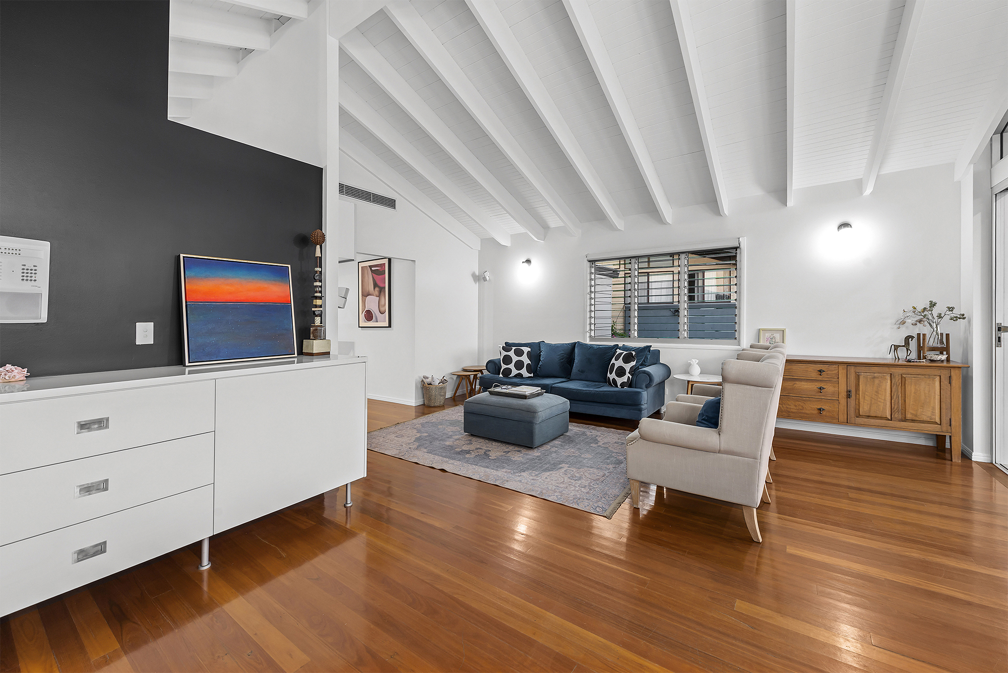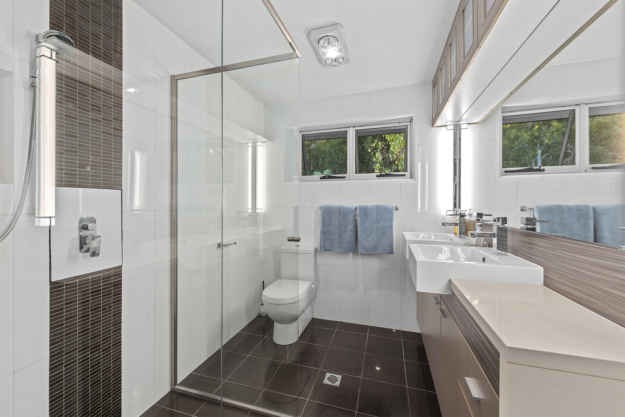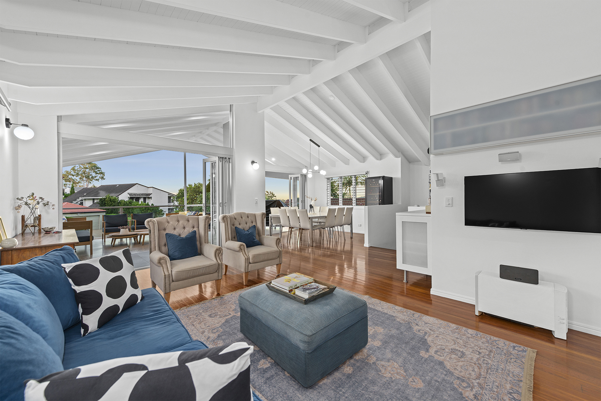 The upper level is devoted to relaxed living and entertaining, with polished timber floors, raked ceilings and a light-filled open plan lounge and dining area flowing seamlessly to a covered alfresco balcony. From here enjoy easterly treetop outlooks, views to the reserve at the rear and the inviting pool below. The kitchen is both beautiful and brilliantly appointed with a gas cooktop, multiple ovens, exceptional storage and adjacent casual meals area.