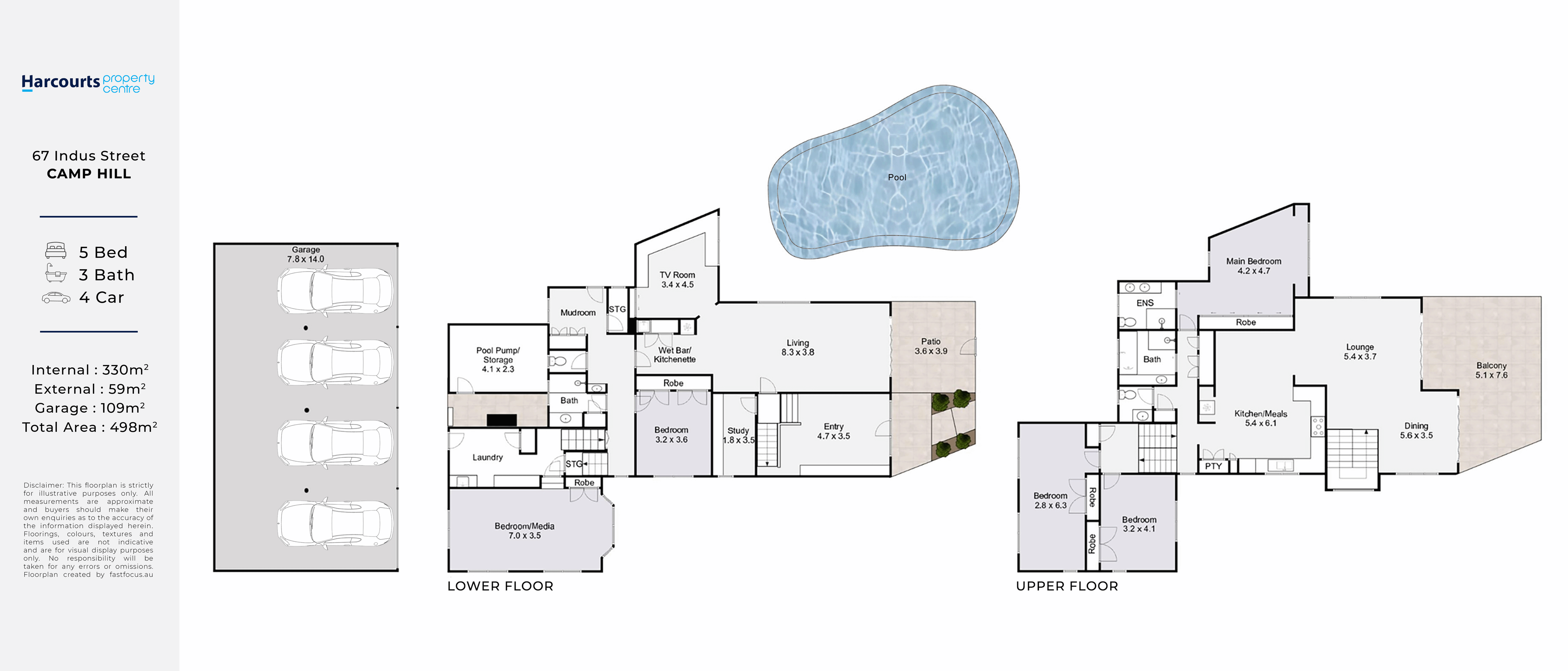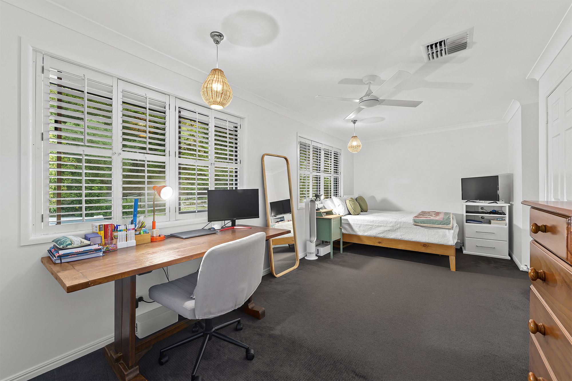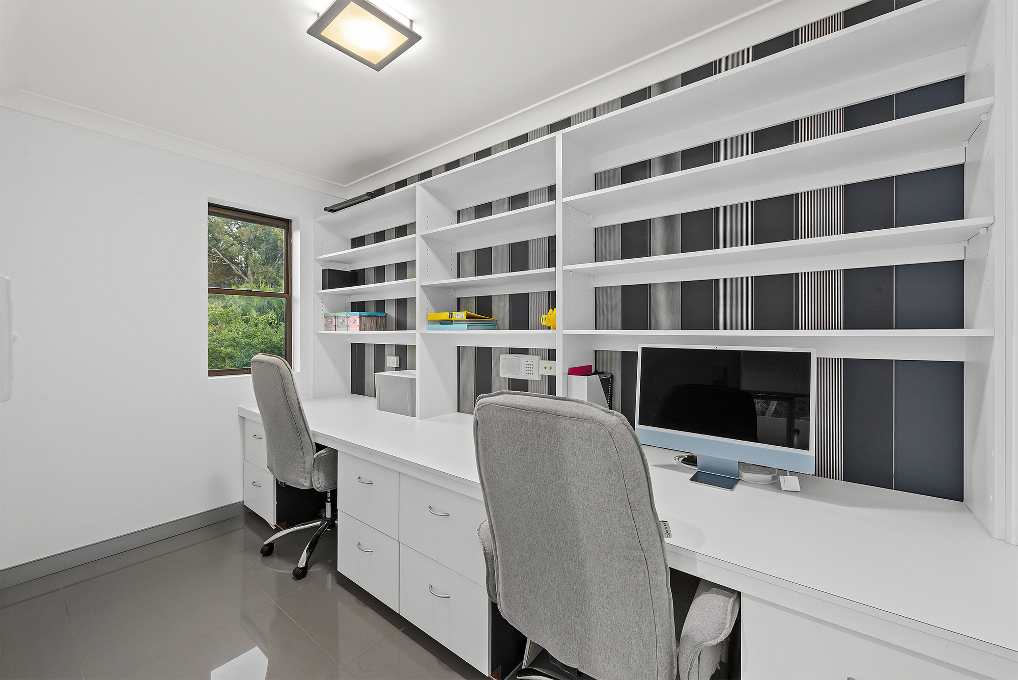 Five spacious bedrooms (one ideal for a media room) are complemented by three luxe bathrooms and a powder room, including a luxurious master retreat with luxe dual vanity ensuite. Downstairs, a huge living room with separate TV room and well-appointed wet bar/kitchenette provides versatility for entertaining or dual living and the fully fitted study with two workstations adds further appeal.