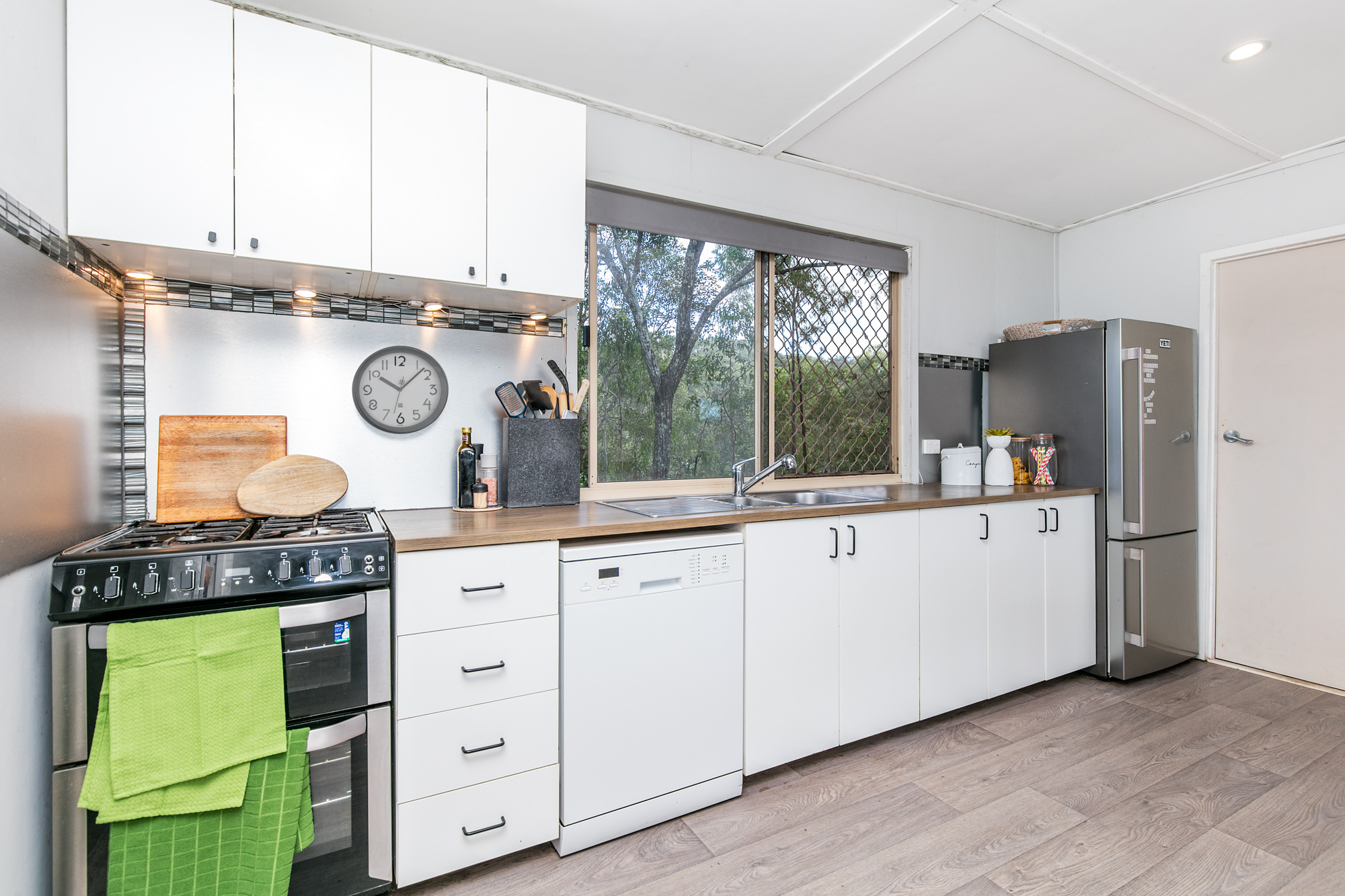 • Modern kitchen with gas cooktop and oven, timber-look benchtops, and ample storage