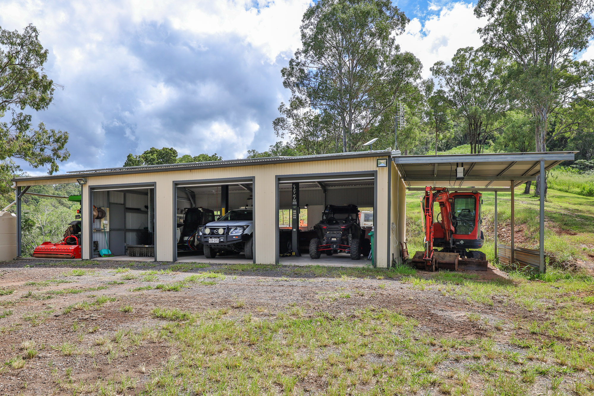 • Large 3-bay solar powered shed with dual carports (approx. 13m x 6.5m)
