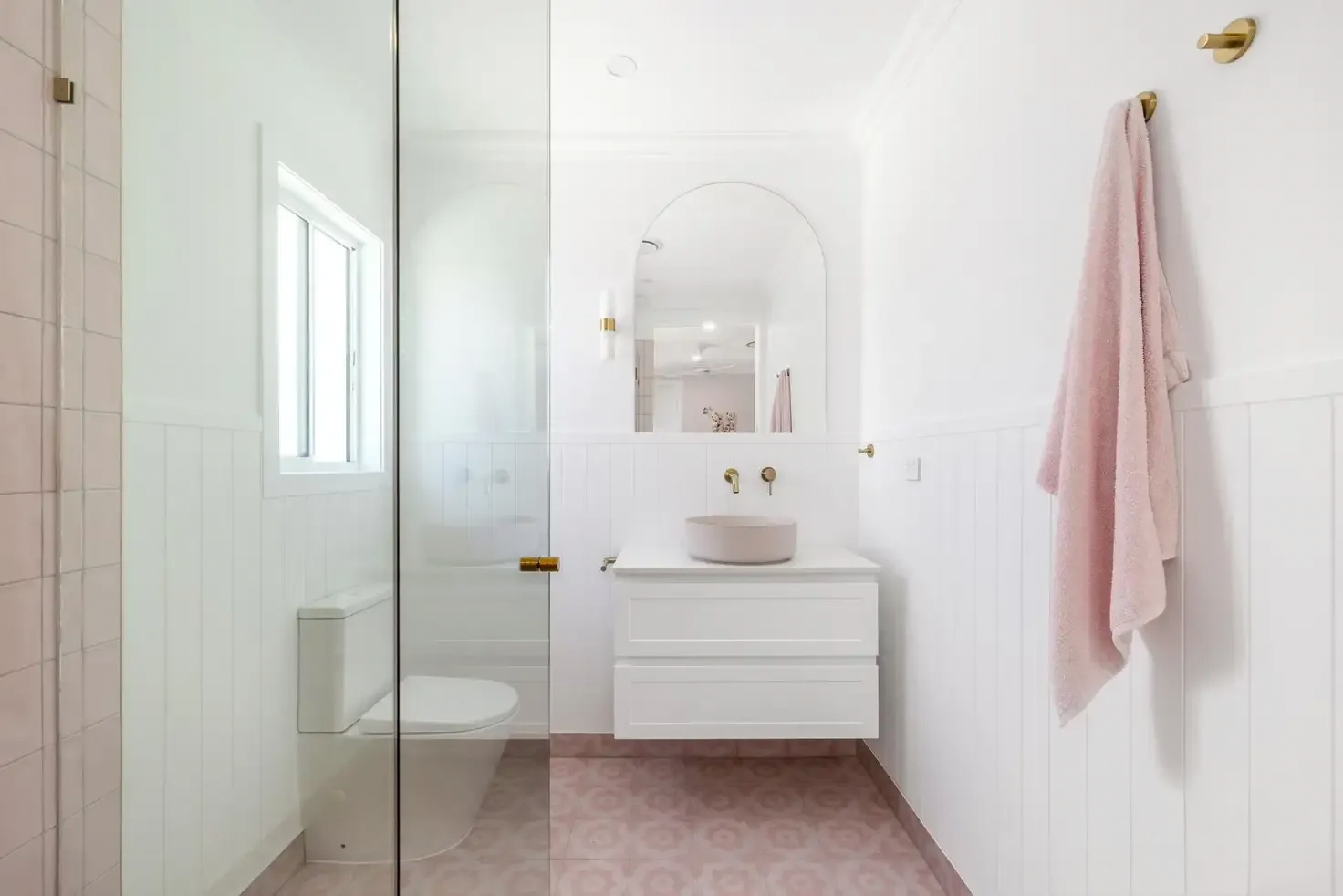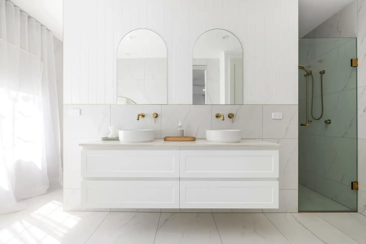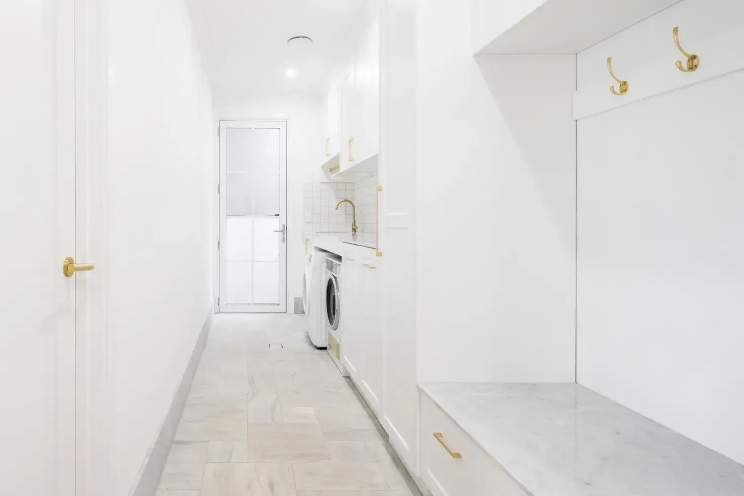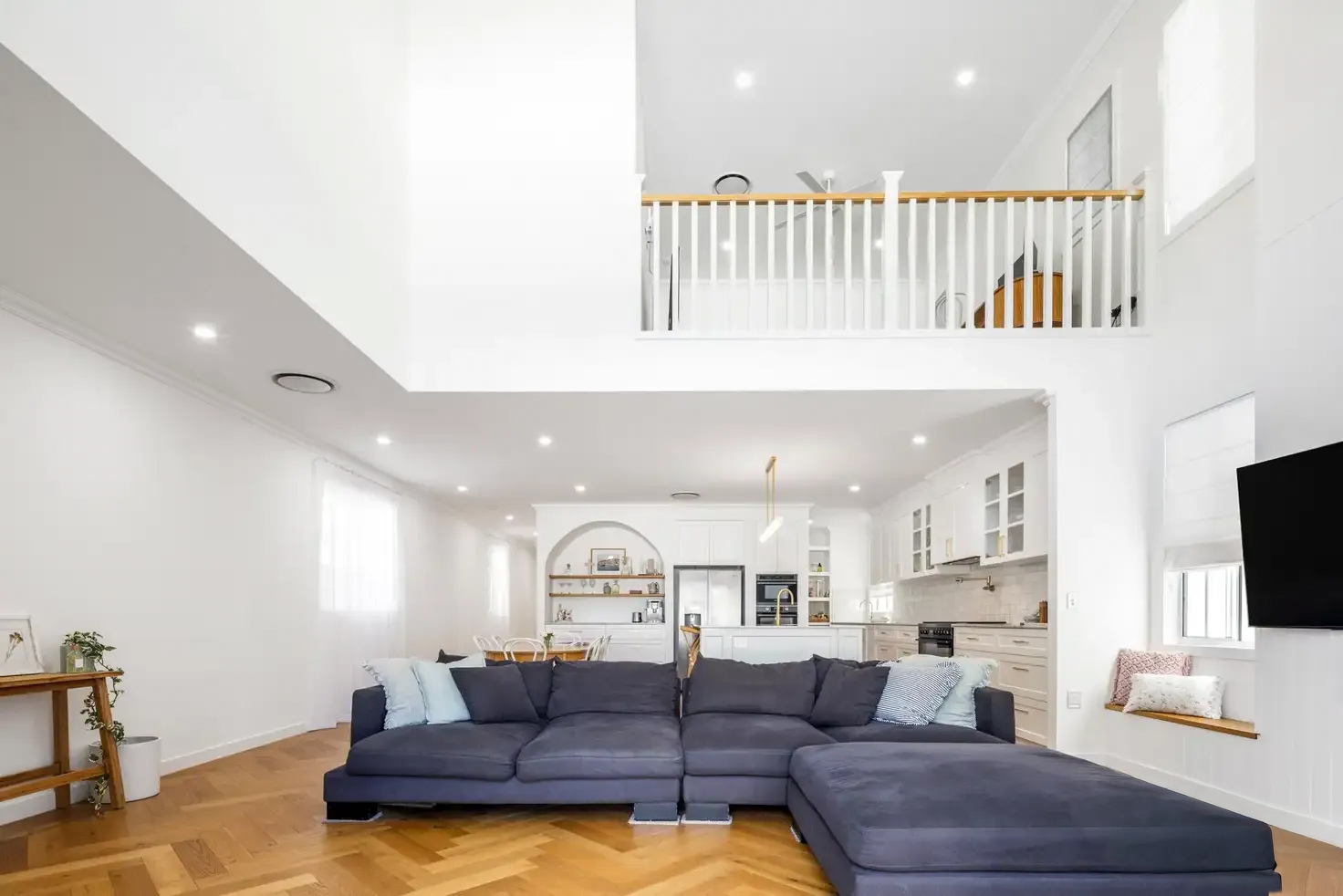 Inspired by timeless Hamptons style with resort-inspired elements, the home unfolds across a flowing layout that seamlessly blends indoor and outdoor living. Herringbone oak floors, stone finishes, wall panelling and brushed brass accents complement a soft, contemporary palette beneath 2.7-metre ceilings and a striking 5.5-metre void, creating an immediate sense of space and sophistication.