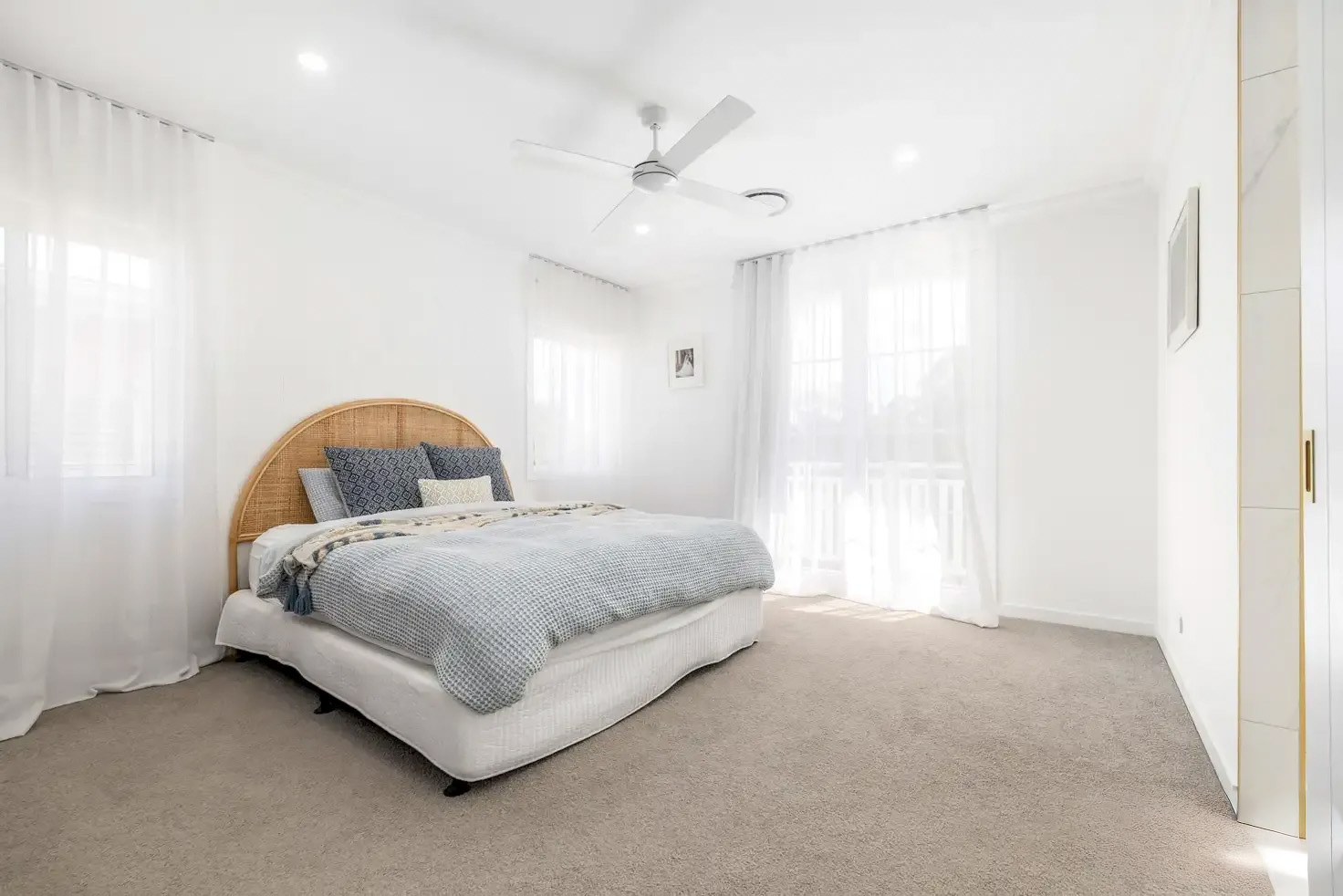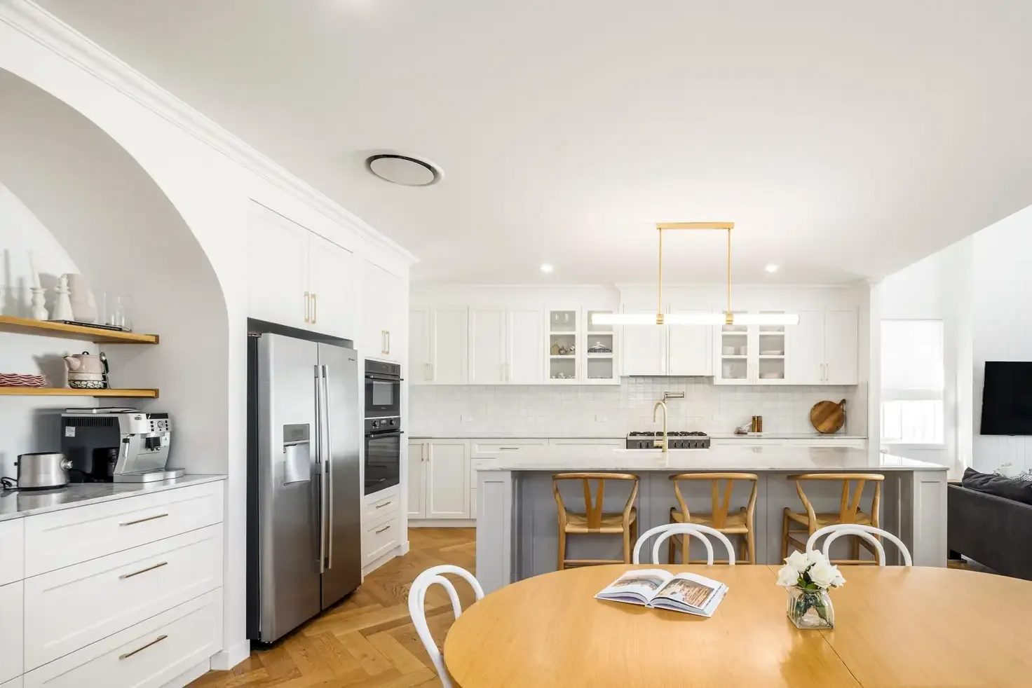 The open-plan living and dining areas centre around a gourmet kitchen designed for everyday living and effortless entertaining, featuring an oversized island bench, bar/coffee station, butler’s pantry, shaker cabinetry and premium Westinghouse appliances, including double ovens and dishwashers.