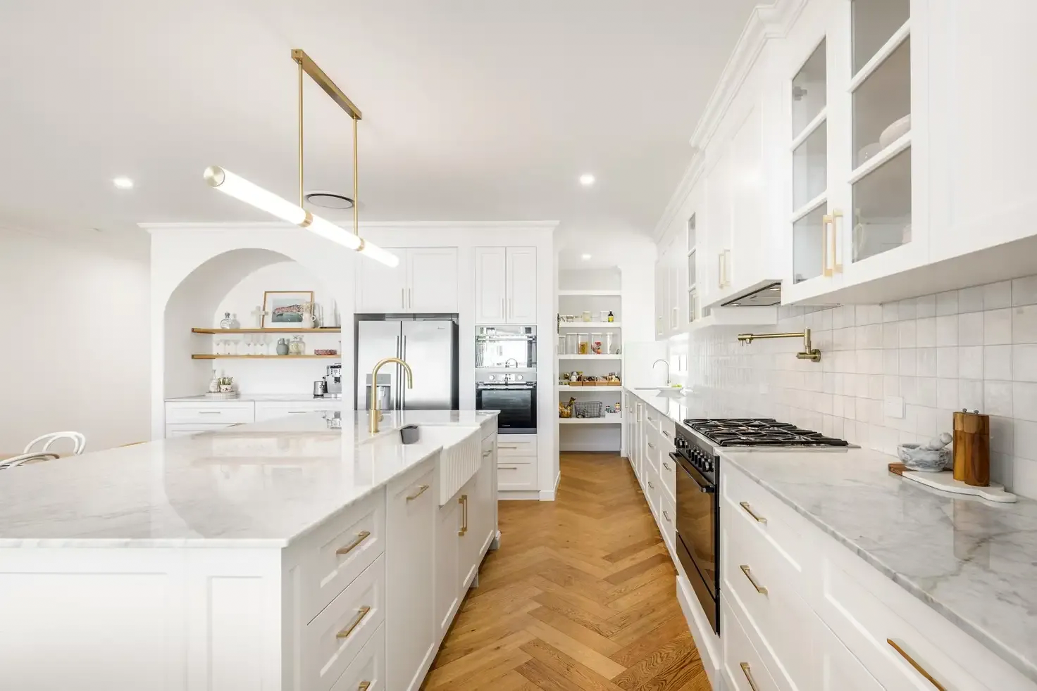 – Herringbone oak flooring, stone benchtops, ABI Interiors tapware