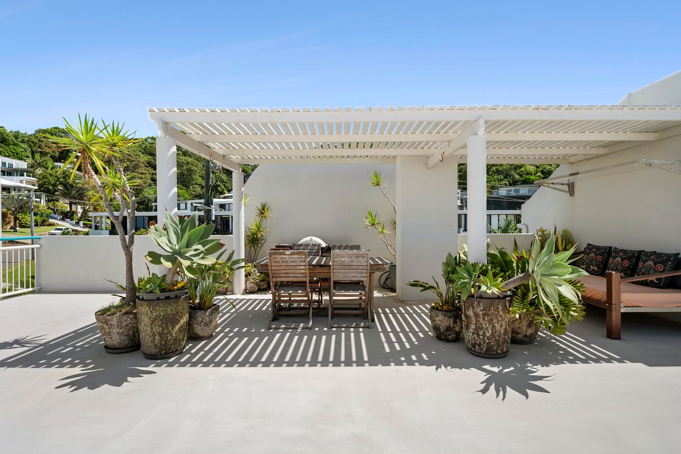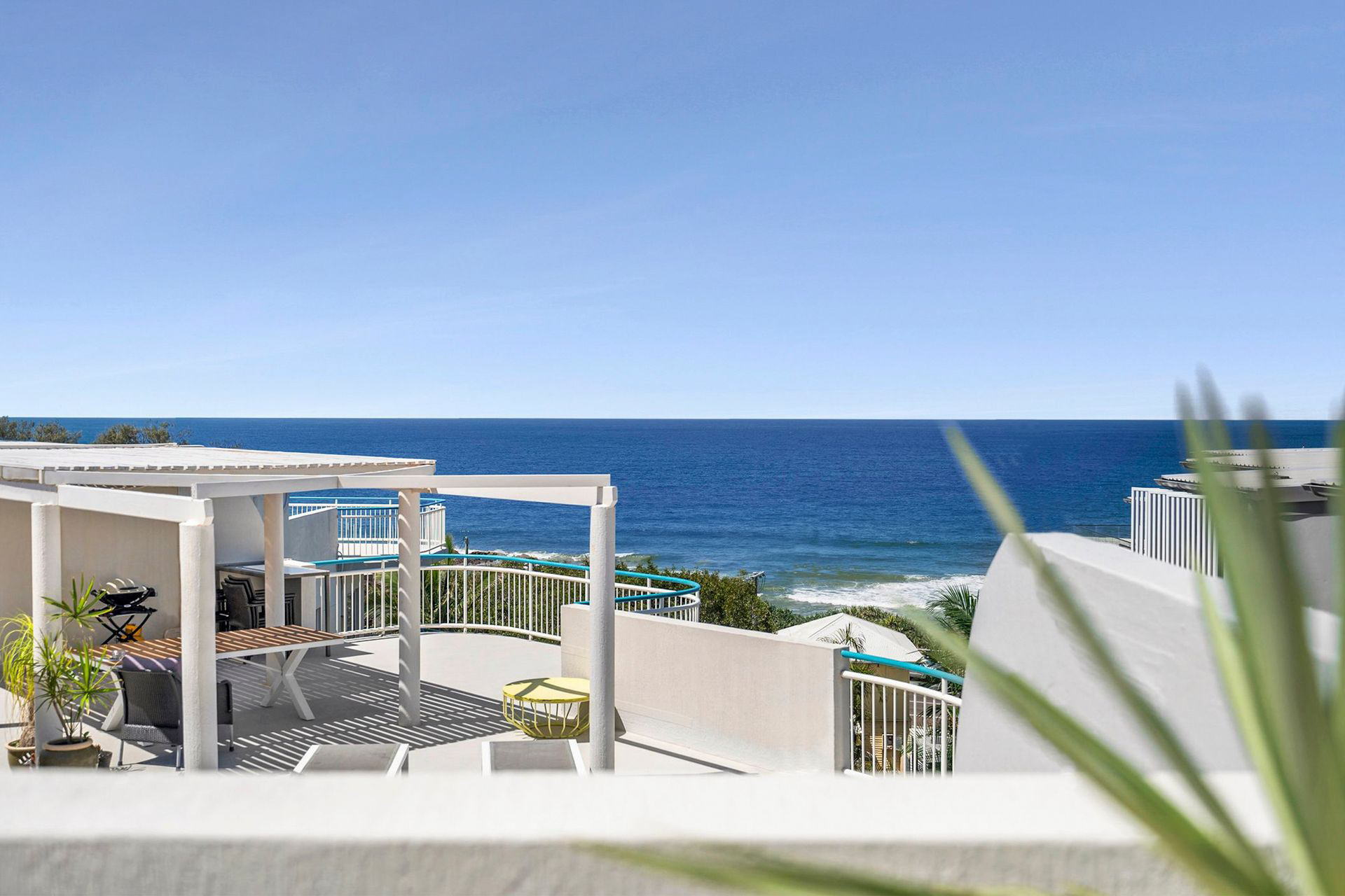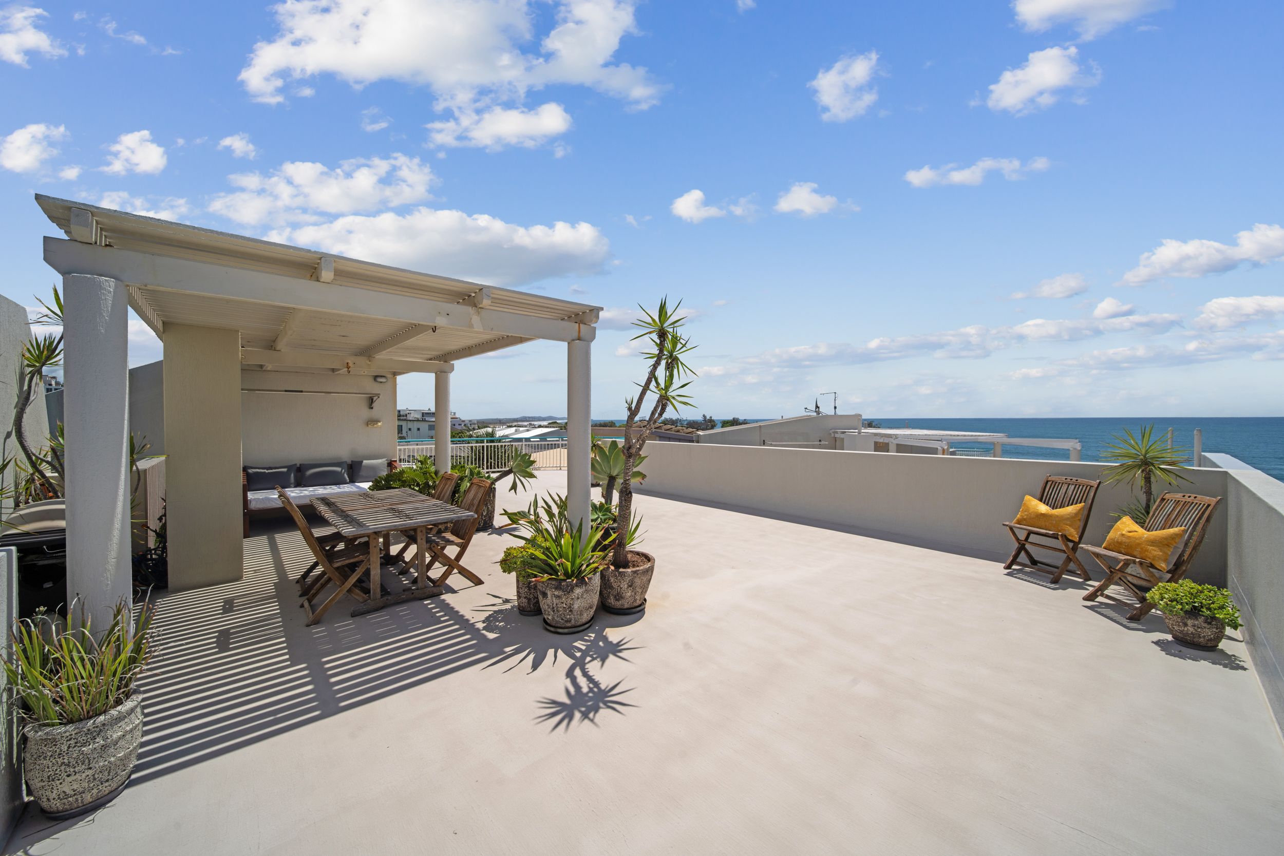 The standout feature? A huge private rooftop terrace with sweeping 180-degree views of the ocean and coastline – the ultimate spot for alfresco dining, hosting friends, or simply relaxing in the sun while soaking up the Mediterranean-style atmosphere.