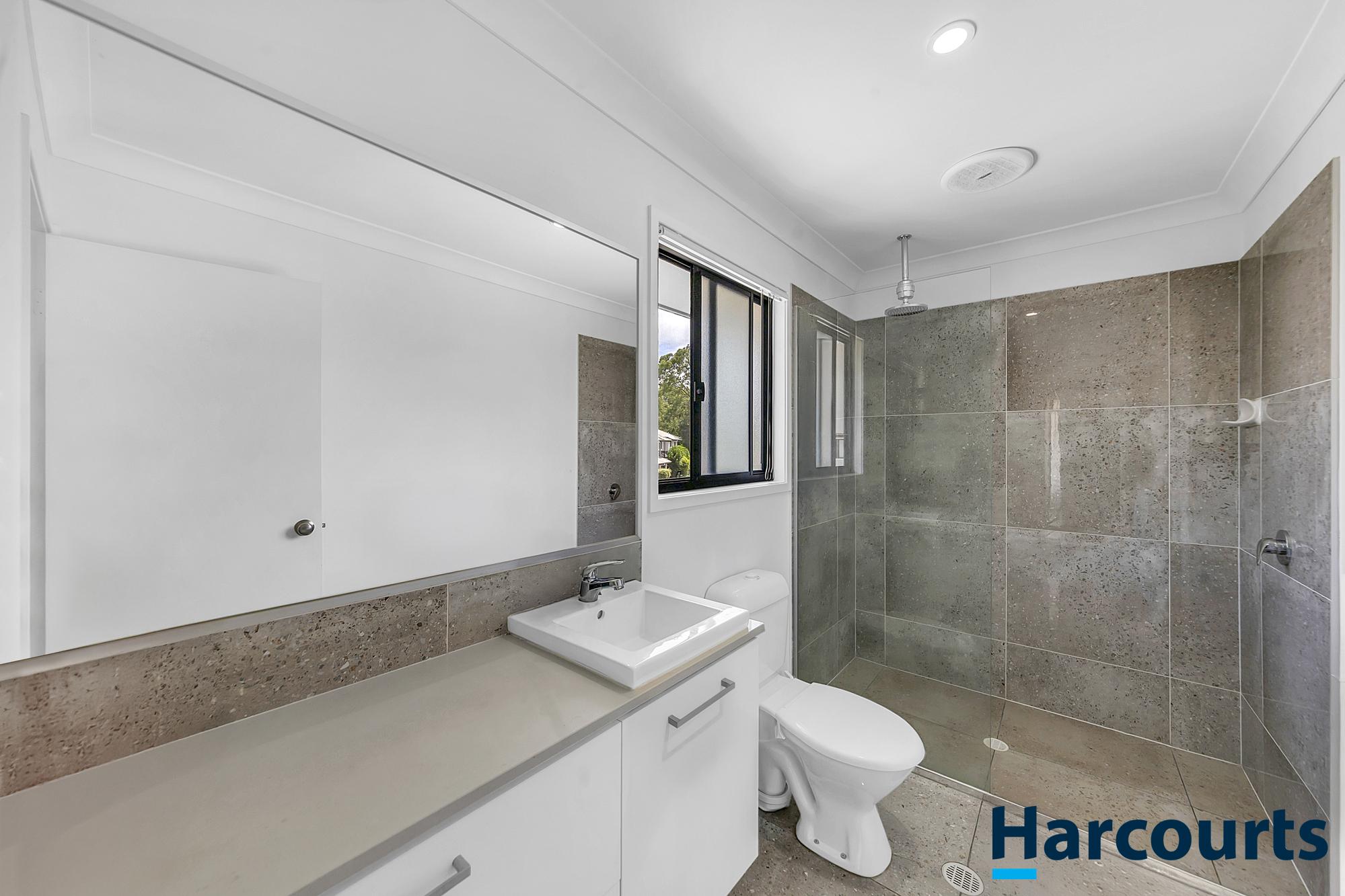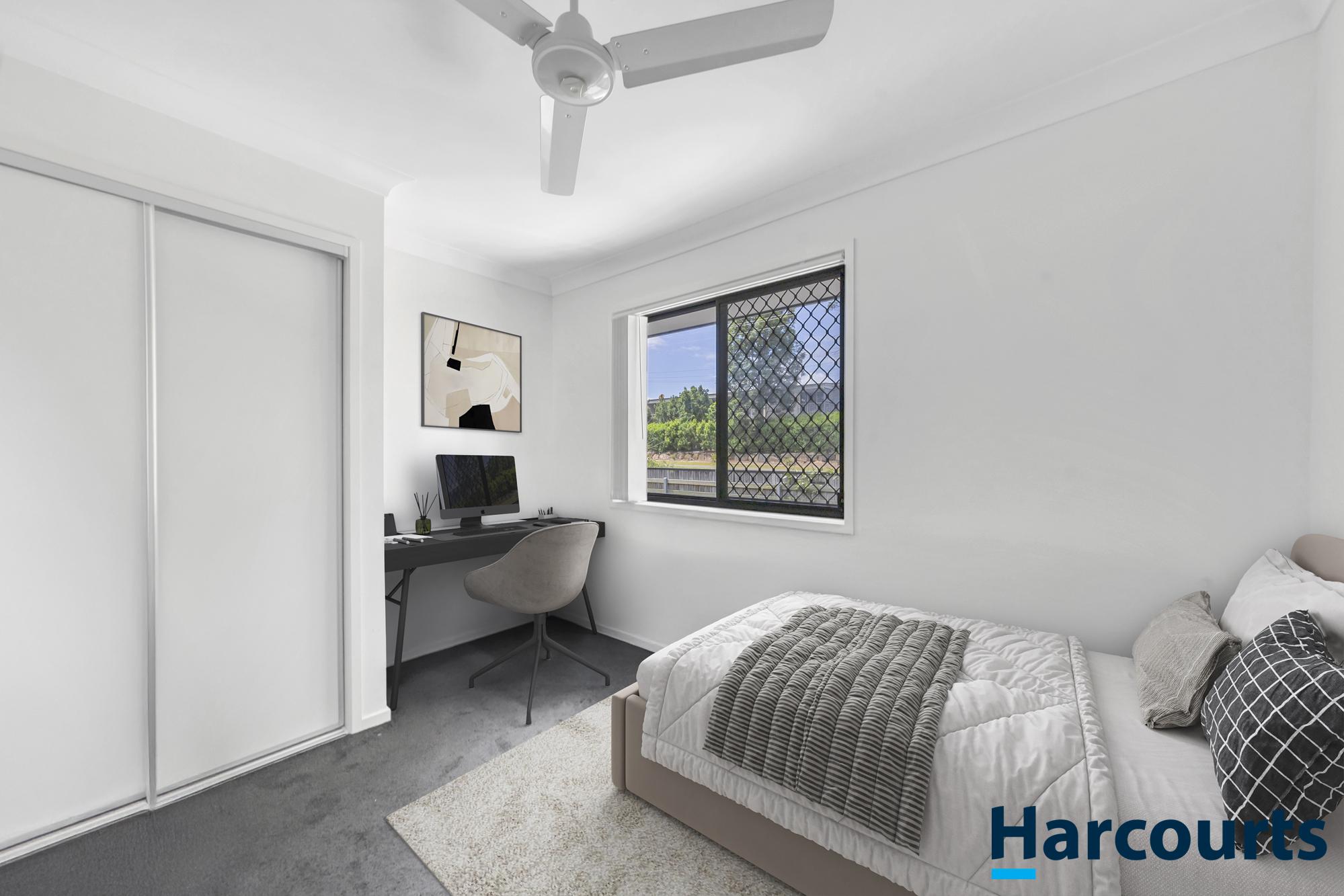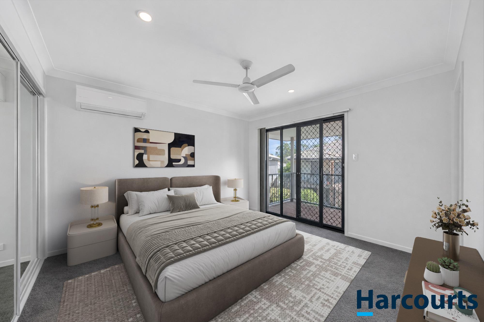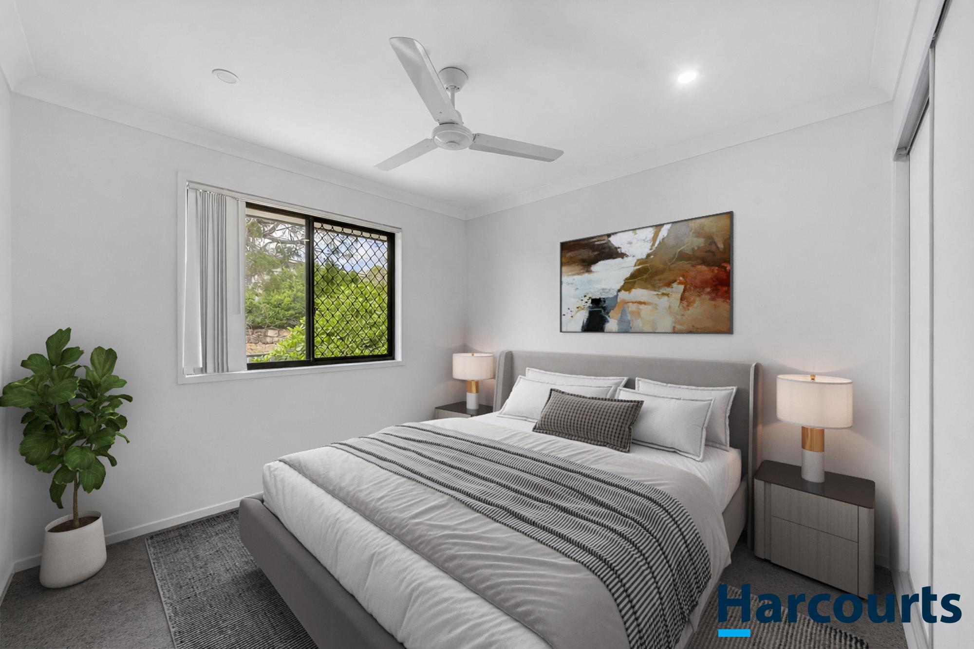 Two additional bedrooms on the upper level also feature carpet, ceiling fans, and built-in wardrobes, providing comfortable spaces for family or guests. A separate main bathroom with contemporary finishes serves these rooms.