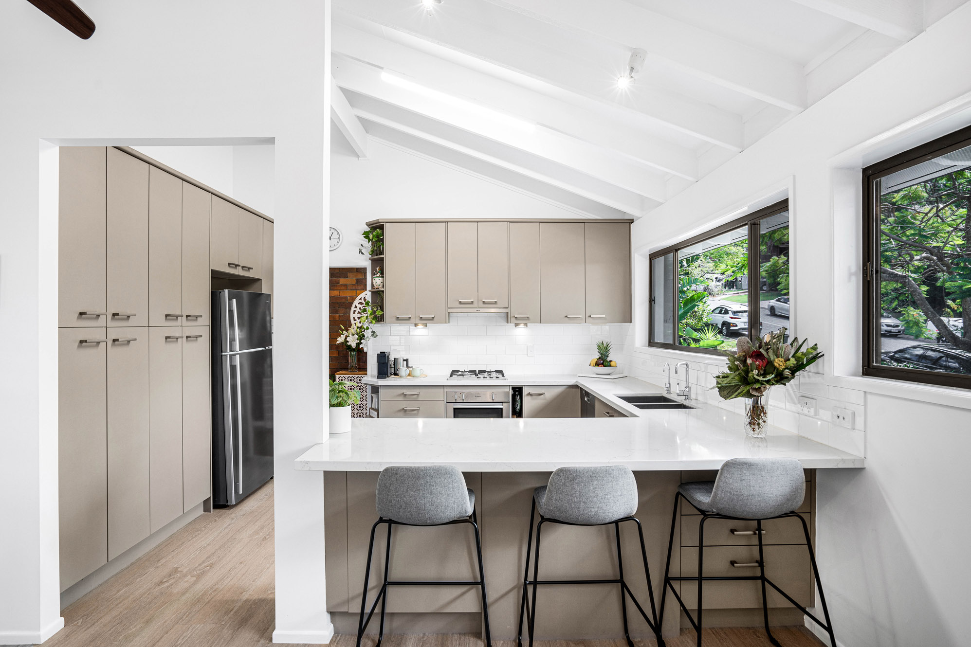 – Contemporary kitchen with gas cooktop, dishwasher and stone benchtops