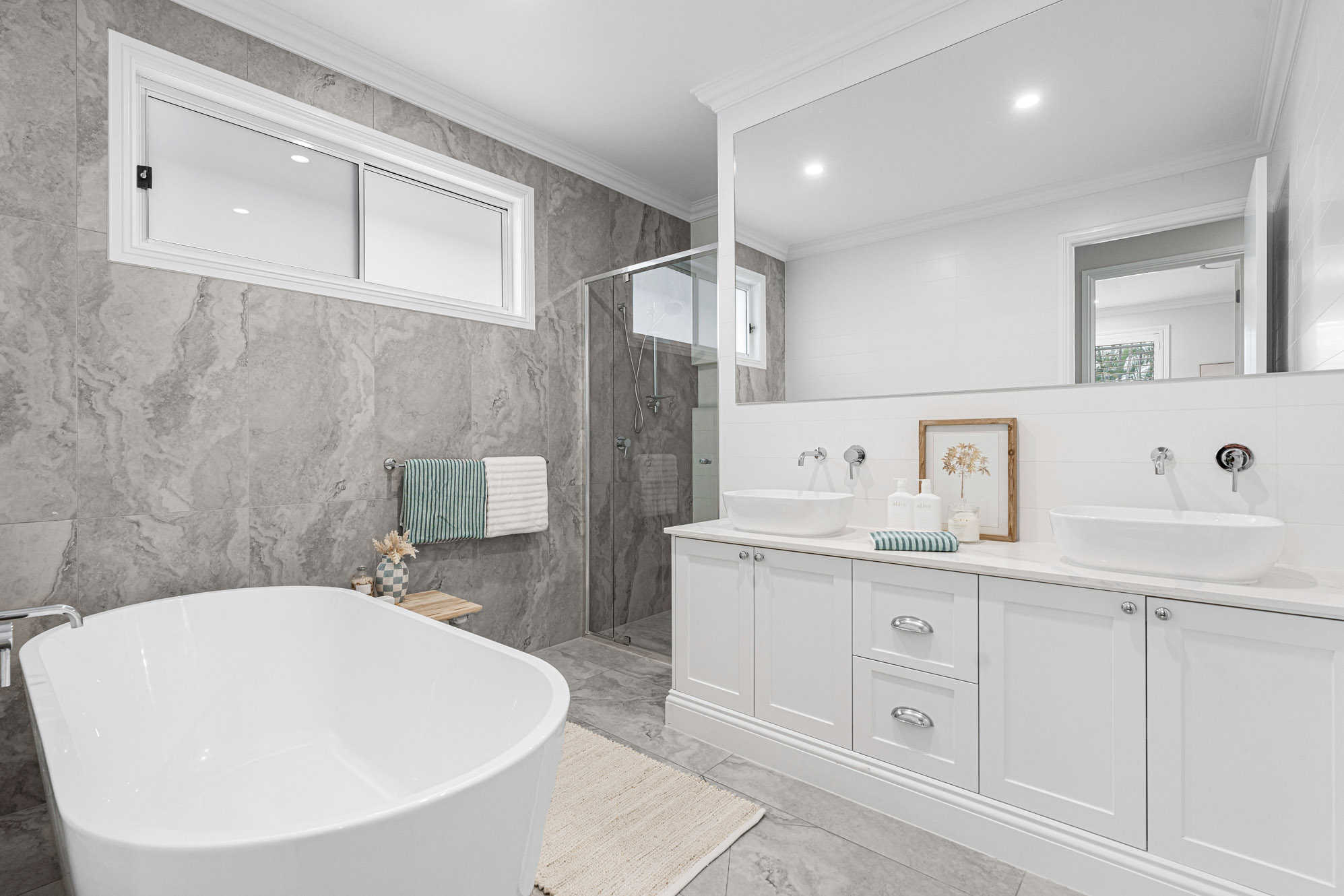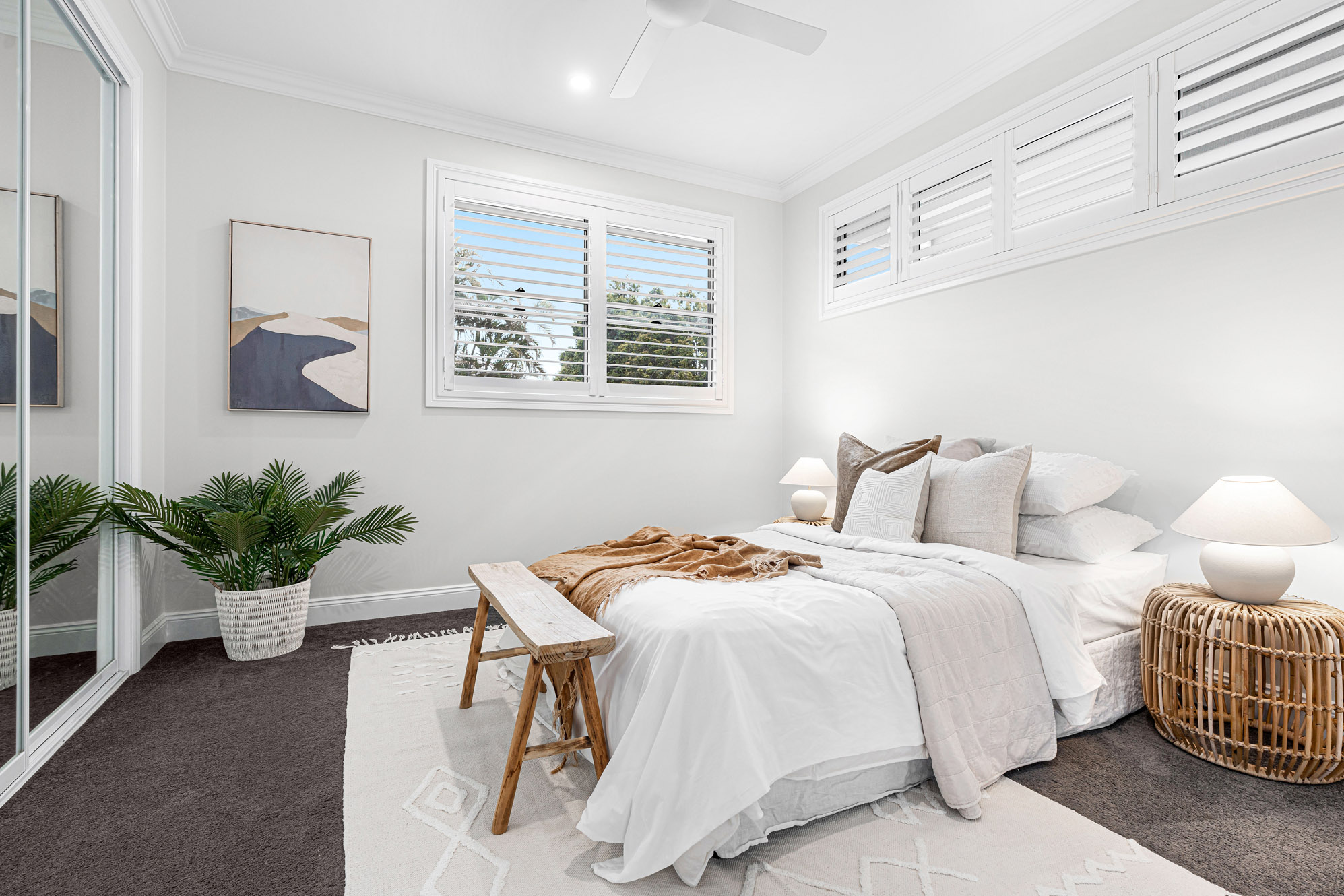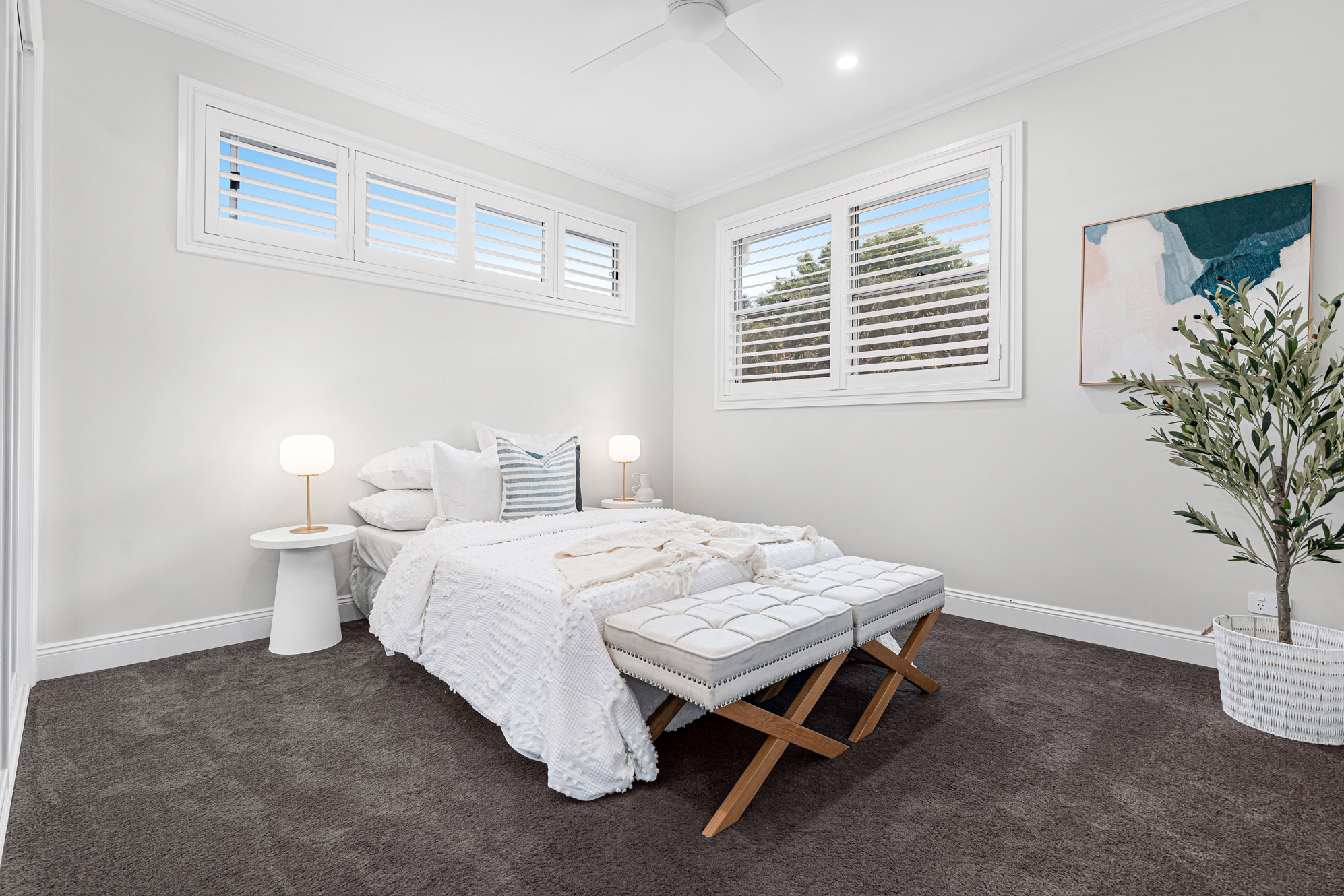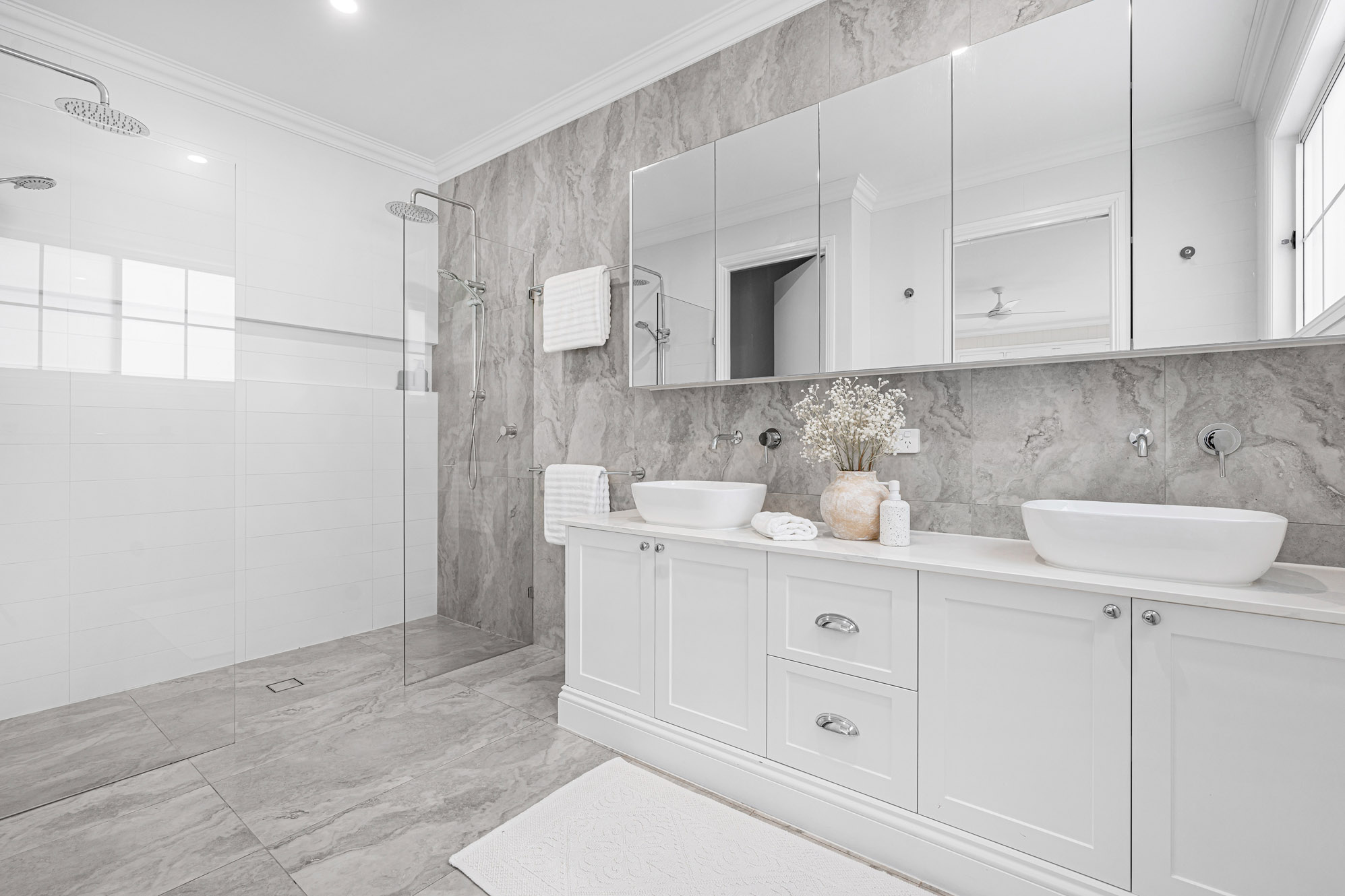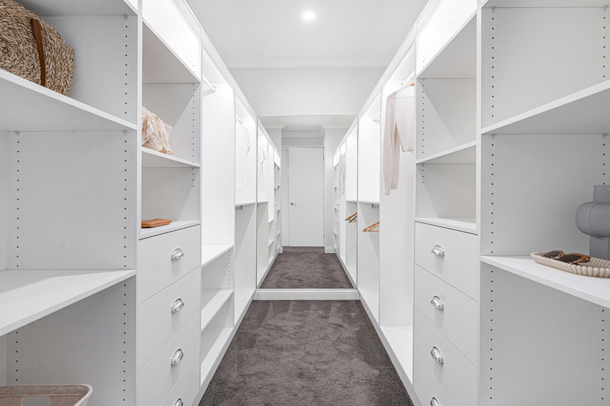 – The family bedrooms all have plush carpets and built-in robes with custom shelving, serviced by an equally attractive main bathroom with a dual showerhead, only steps away