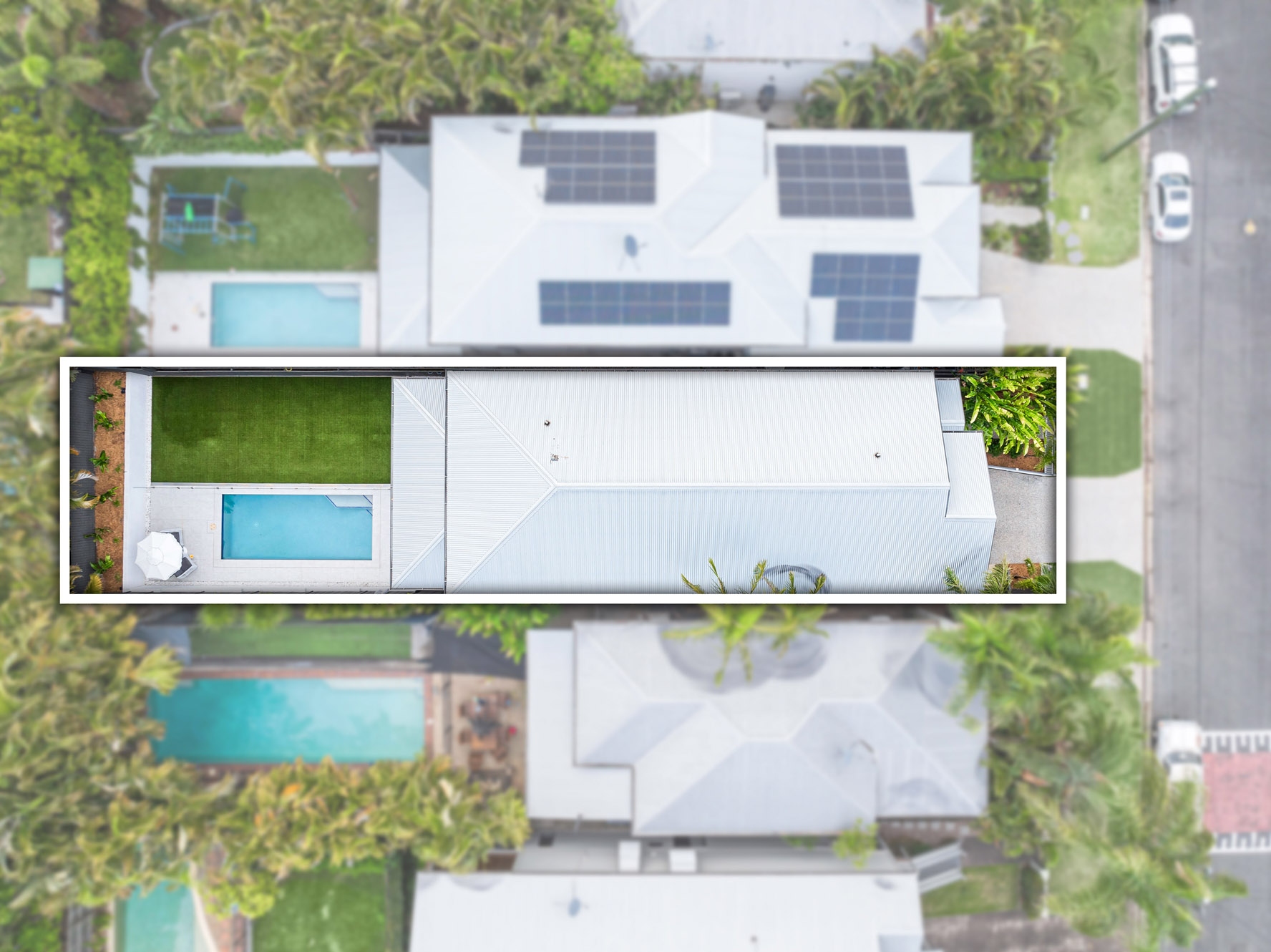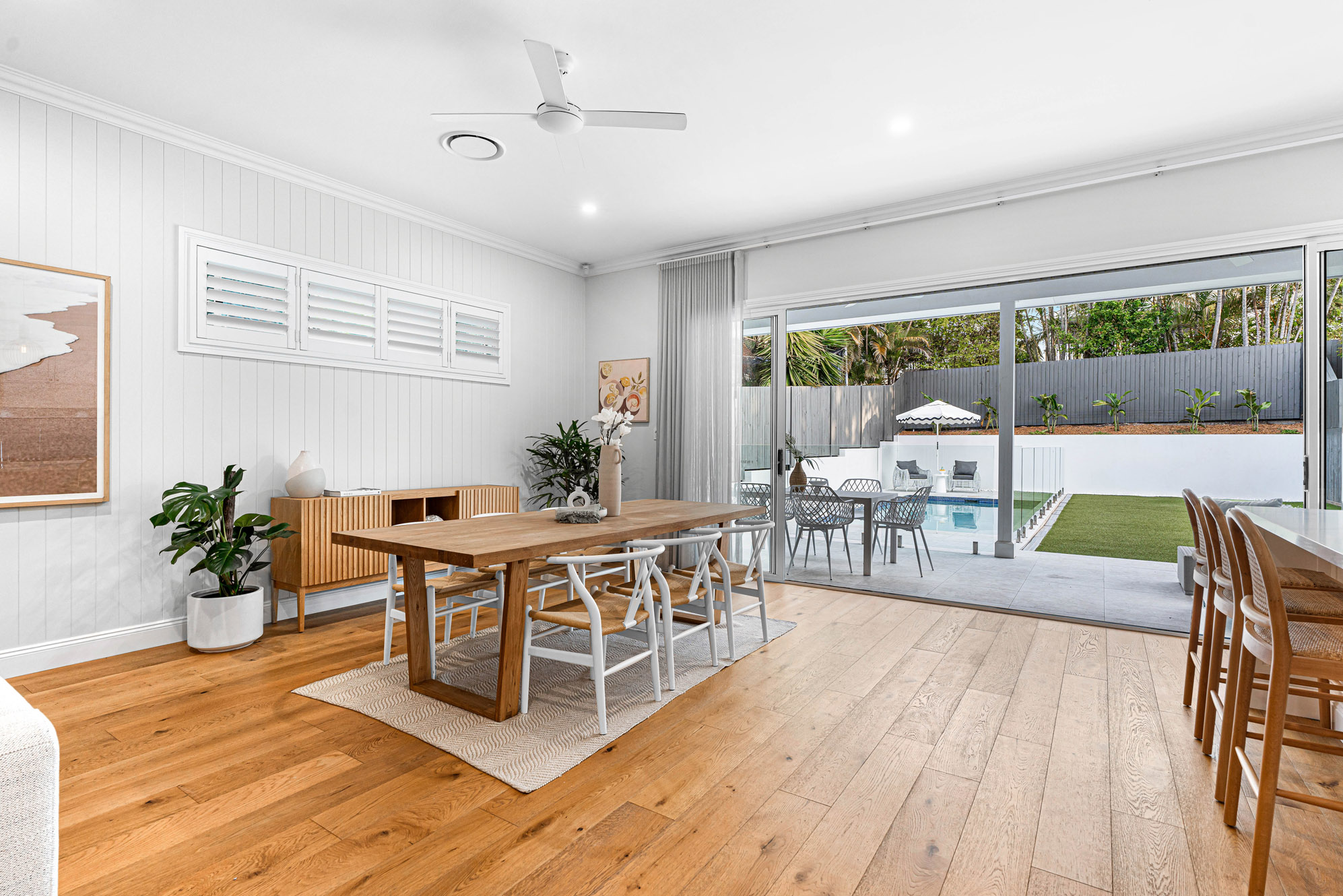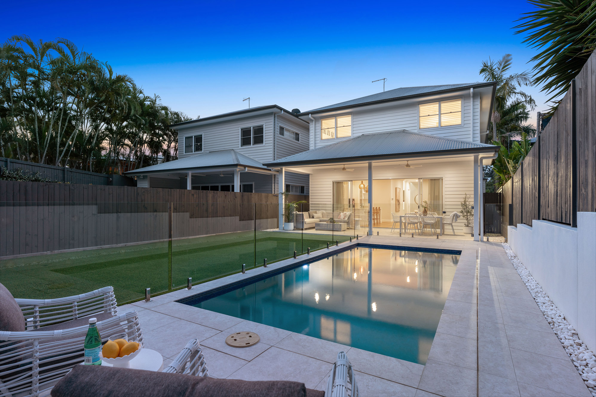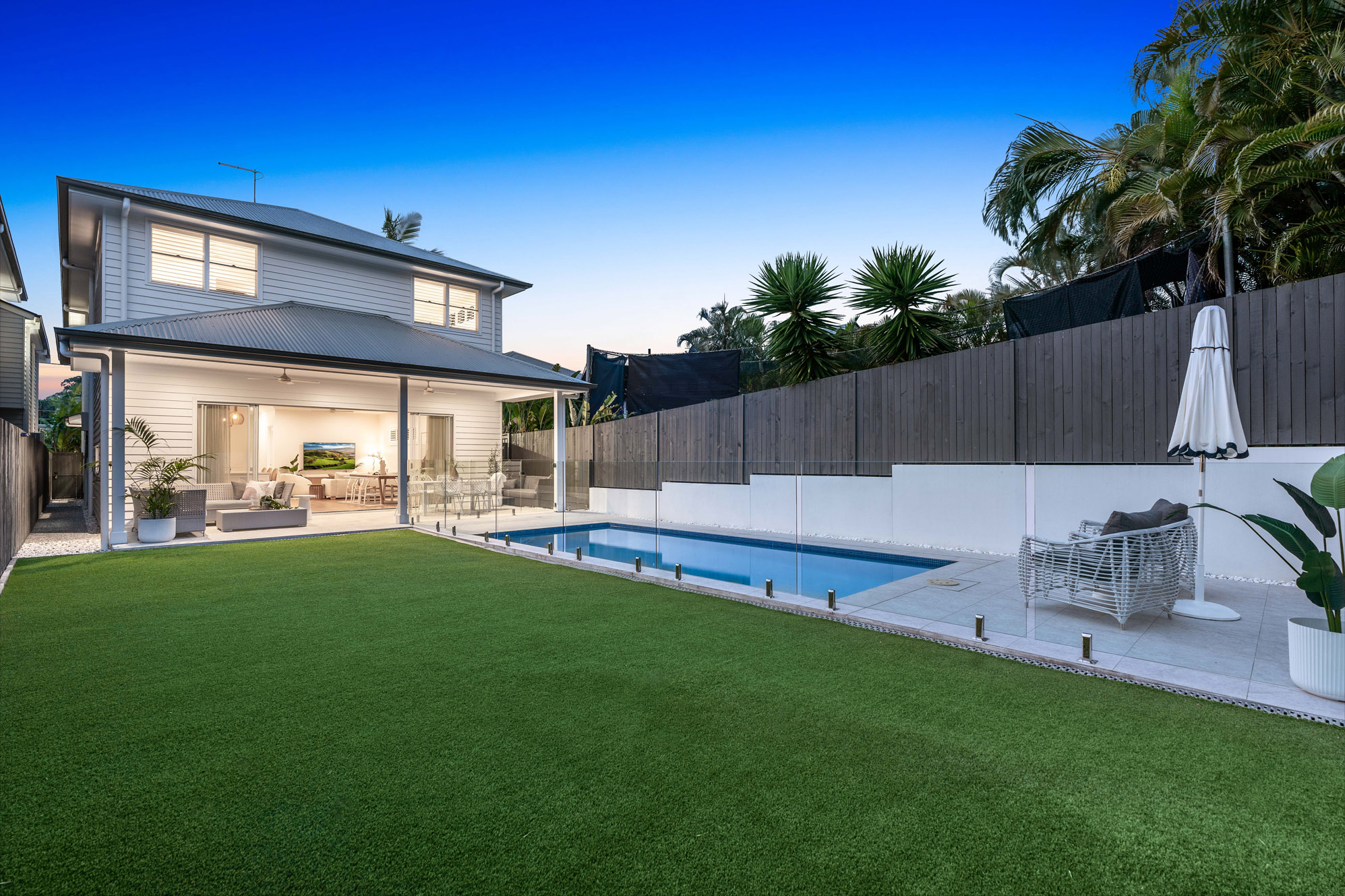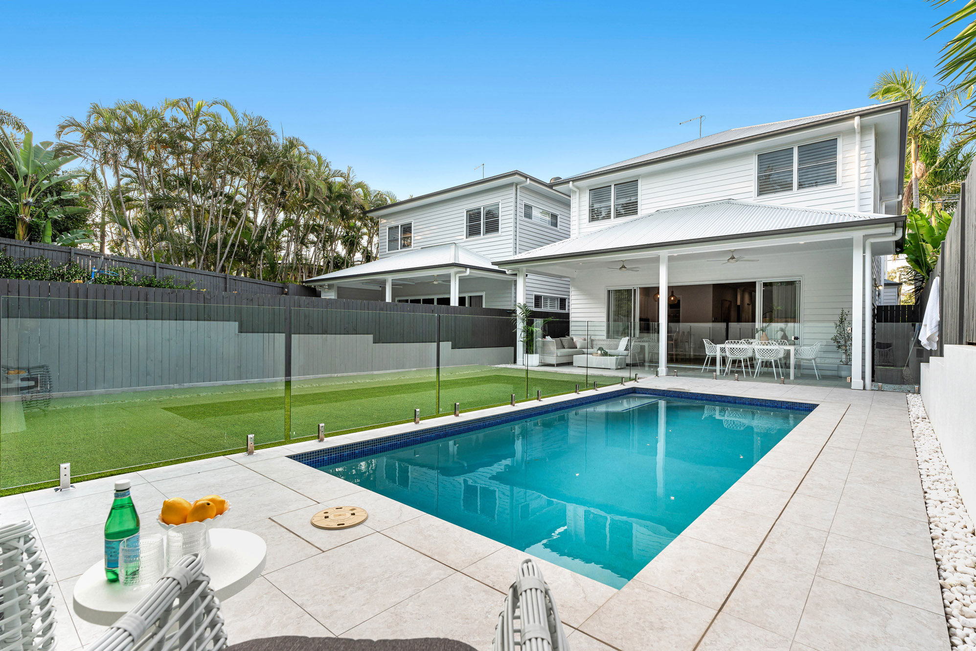 – From here, you can head out for alfresco dining on the covered patio with the shimmering in-ground pool awaiting a refreshing dip, finished with custom seating and excellent drainage
