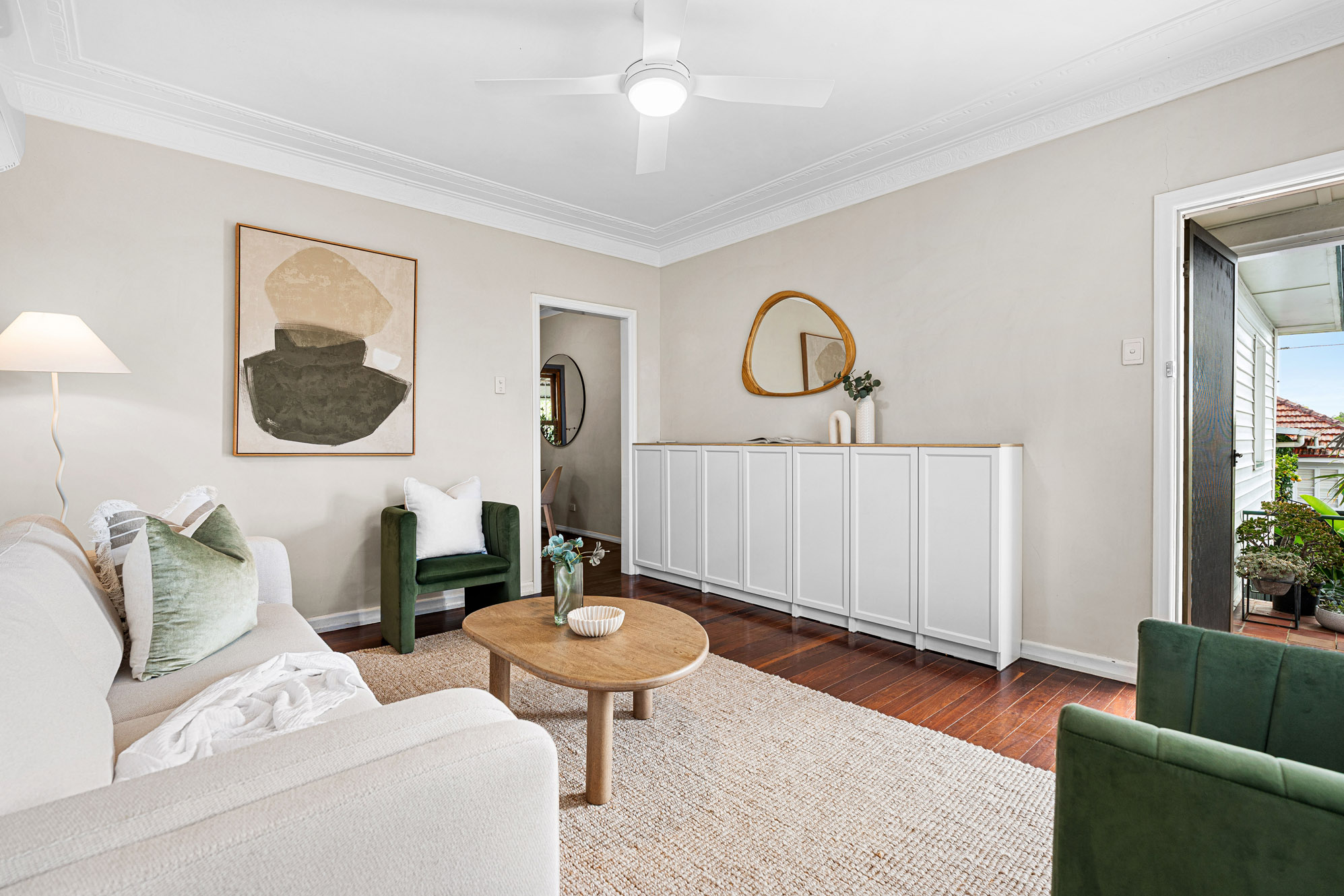 Classic post-war features including casement windows, timber floors and ornate cornices