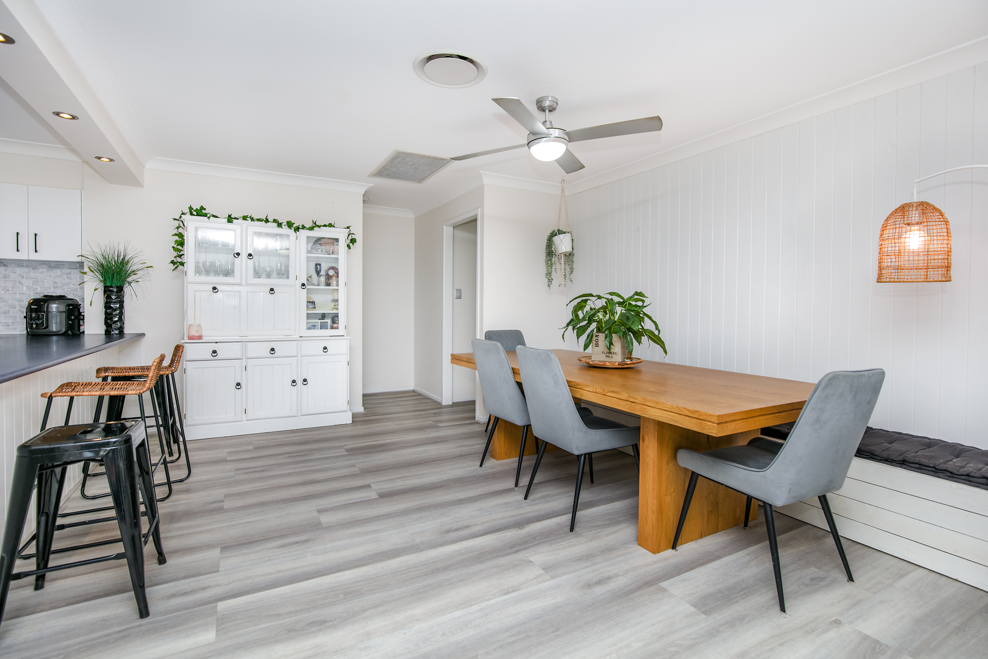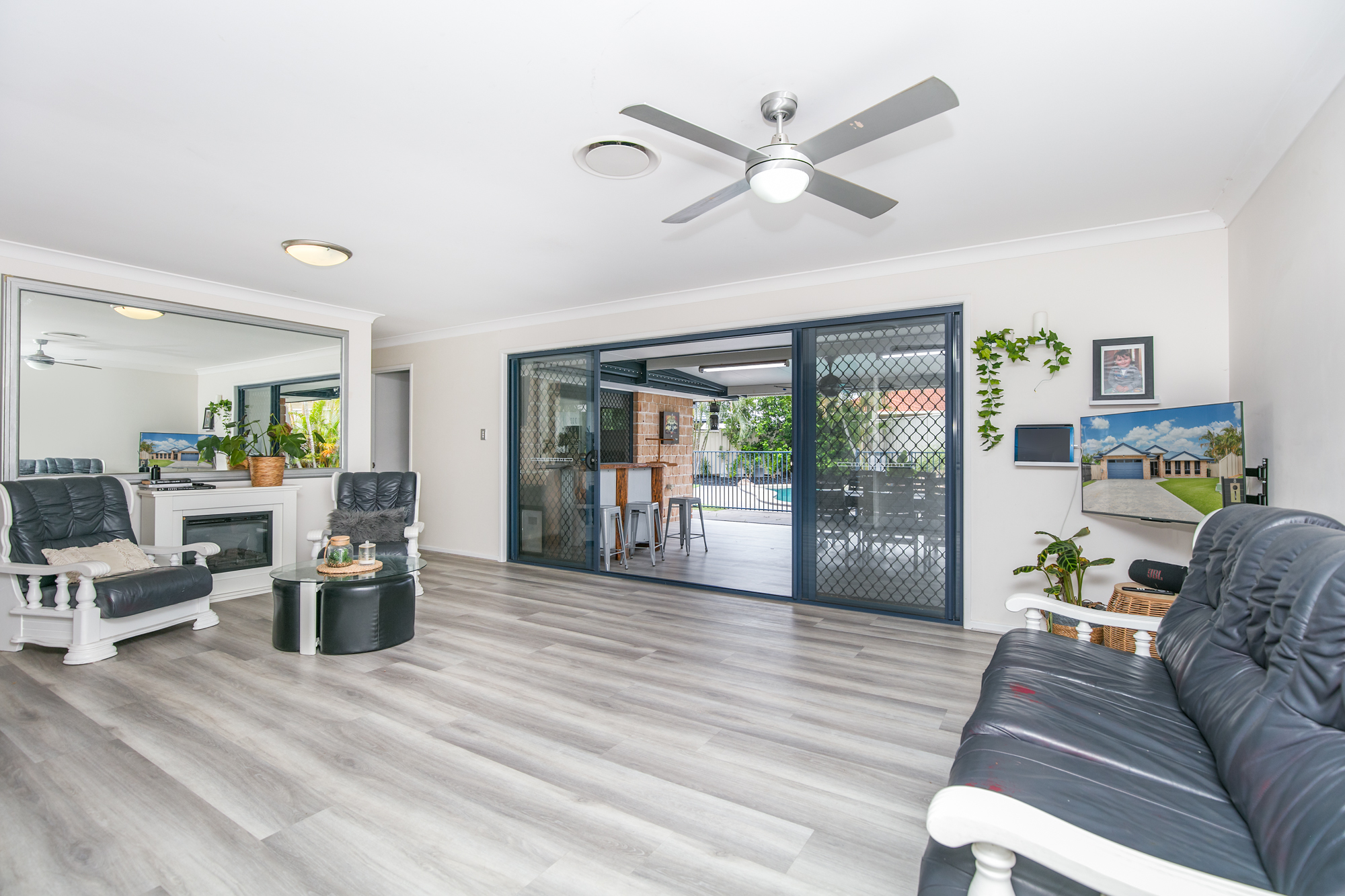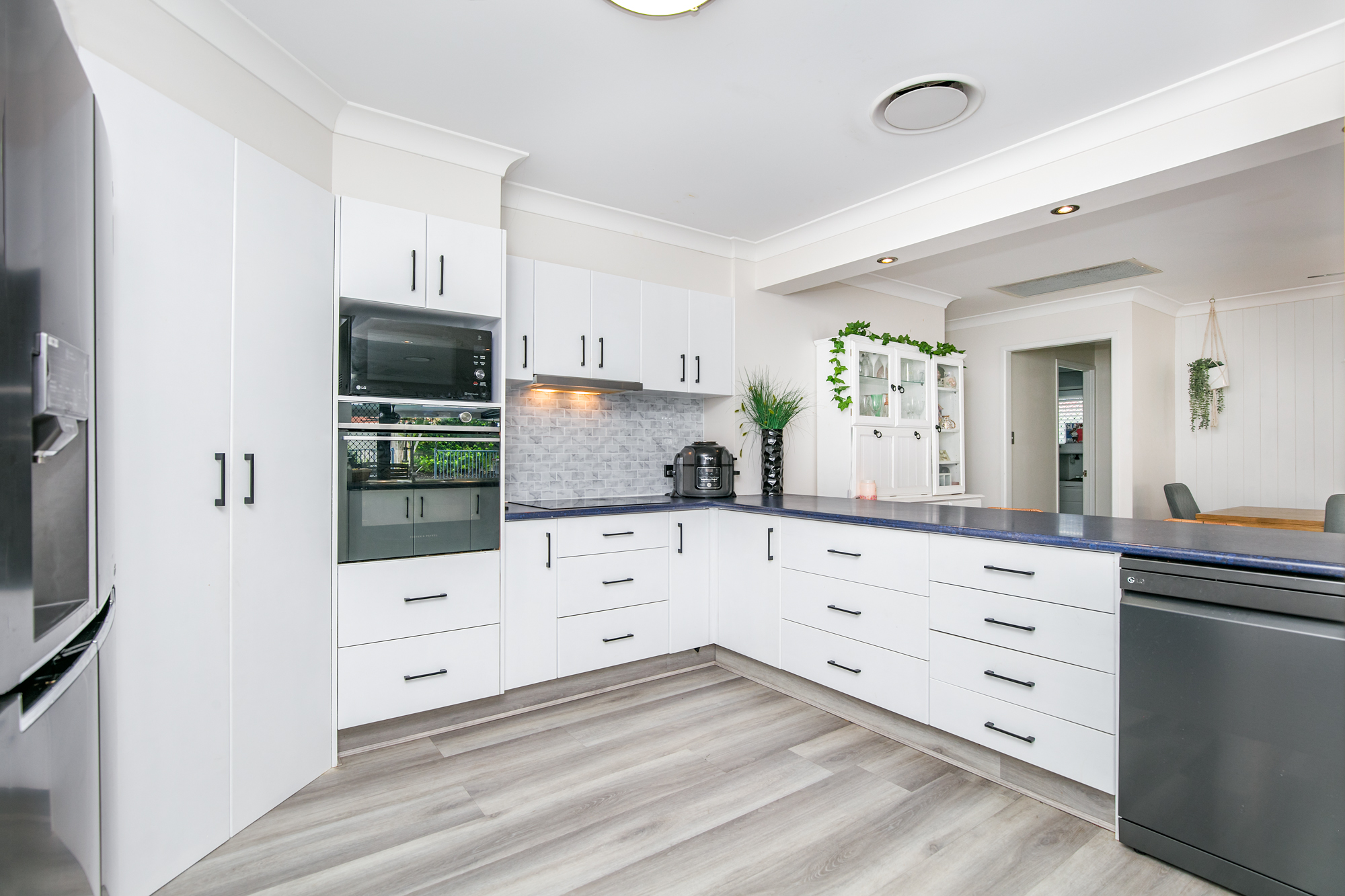 • Large open planned kitchen (with Whirlpool induction cooktop, top of the range Fisher Paykel oven with air fryer setting, LG dishwasher, large pantry, plumbing for fridge, and ample bench and cupboard space)