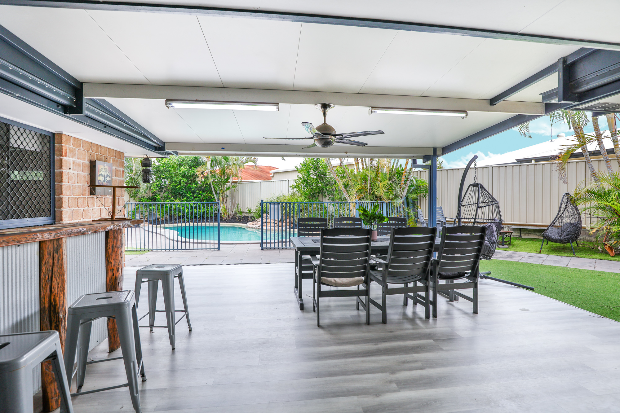 • Covered alfresco area with built in bar, lighting, and ceiling fans