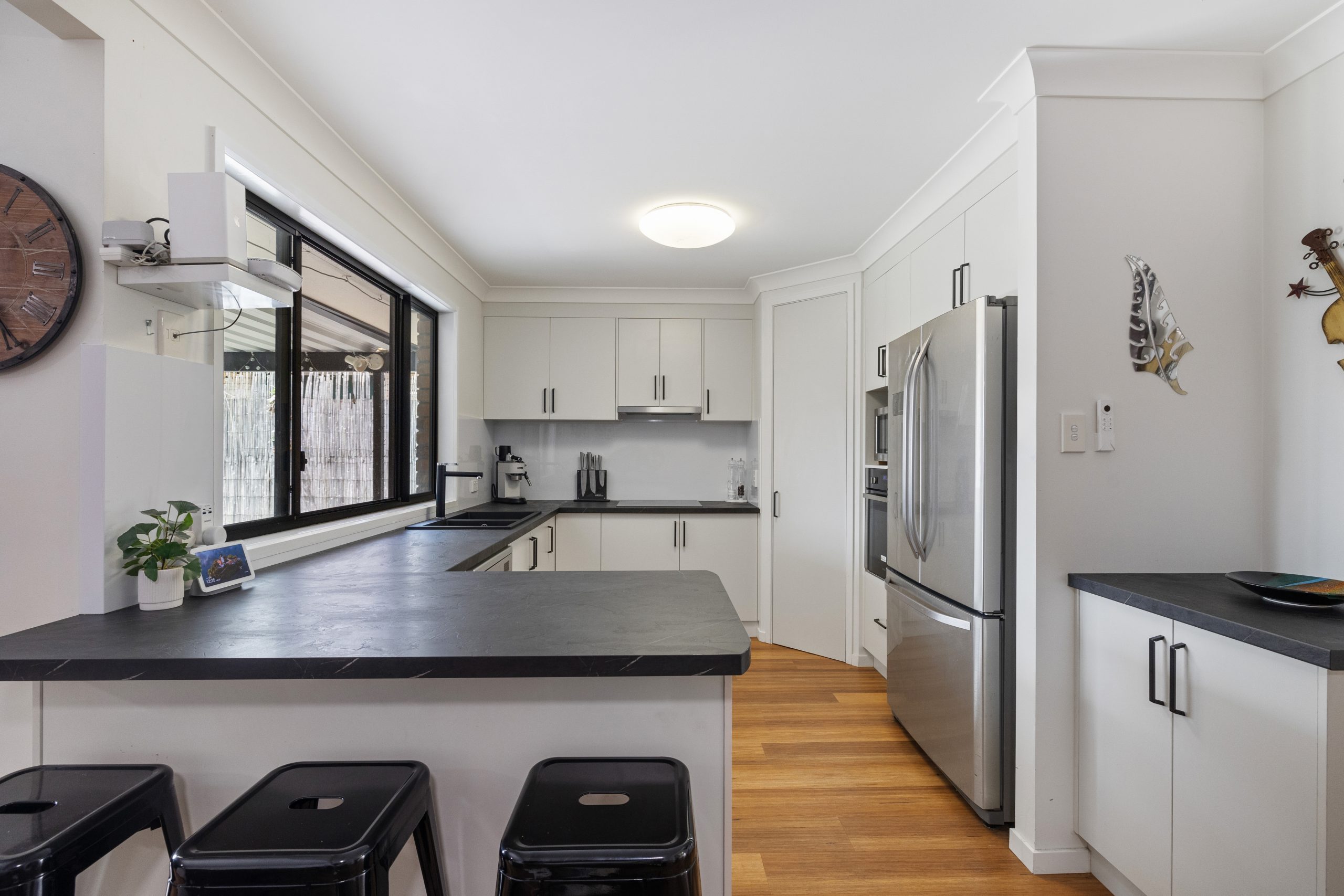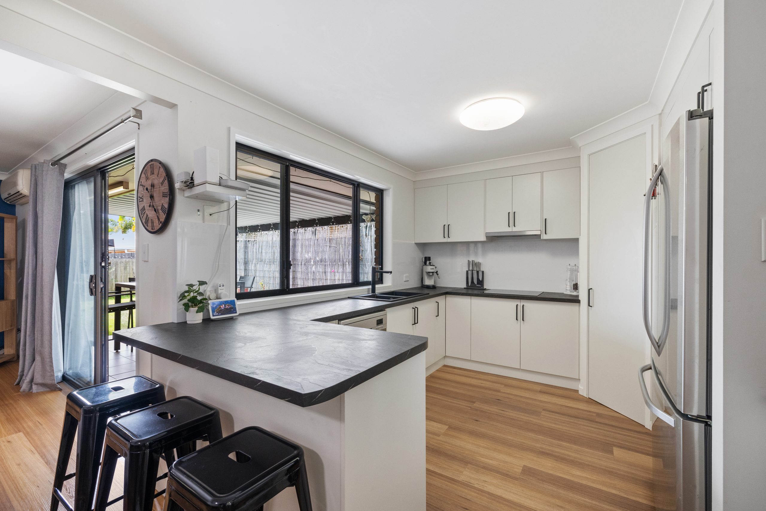 Inside, the home has been thoughtfully updated with a number of modern improvements, including a refreshed kitchen, new flooring throughout, new ceiling fans, split-system air conditioning and an updated awning over the alfresco area. The kitchen features a practical corner pantry with generous shelving and a convenient servery window that connects seamlessly to the outdoor entertaining space – perfect for hosting friends and family.