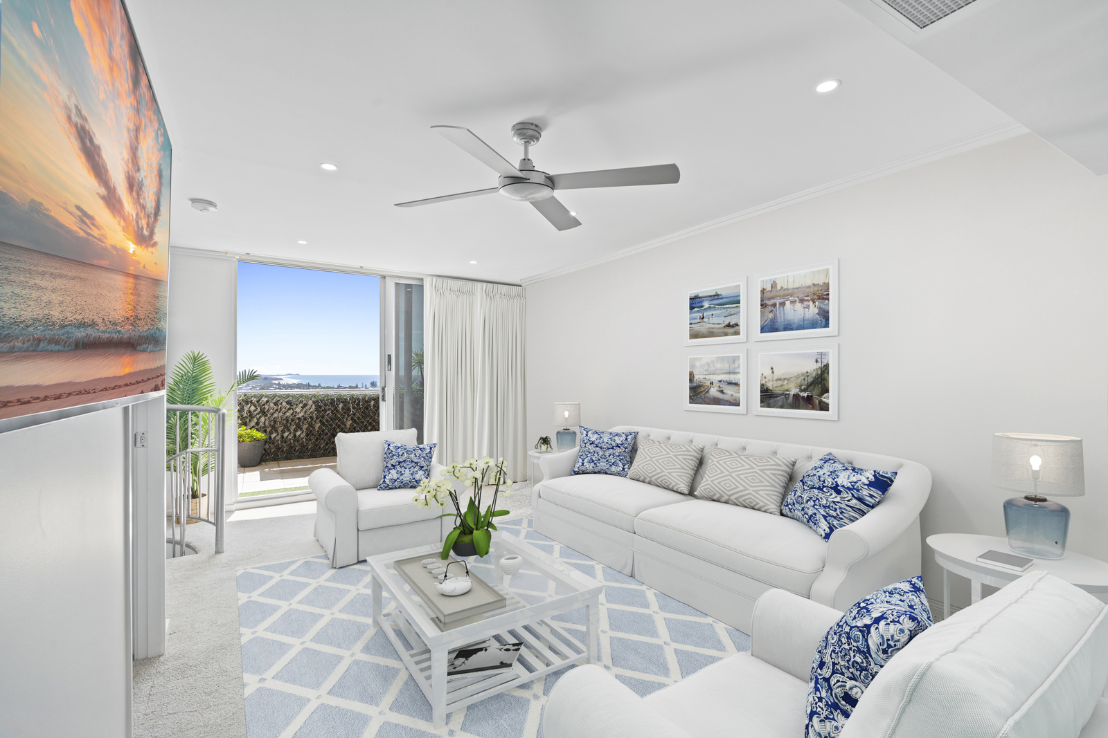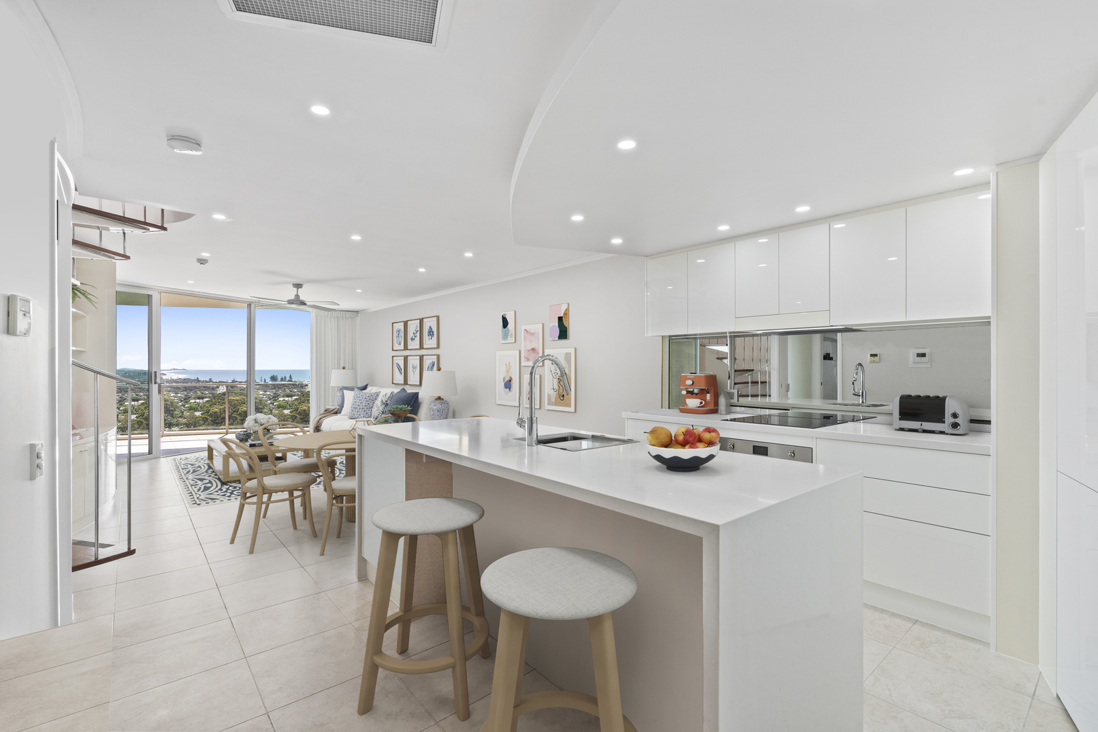 Entering on the first level, the home has a lovely main living area and renovated chef’s kitchen with European appliances, stone benchtops, and ample cupboard space. You can invite guests to experience the views from one of the three spacious balconies. There is always an ideal spot for an alfresco meal or to savour a glass of wine while taking in the sights.