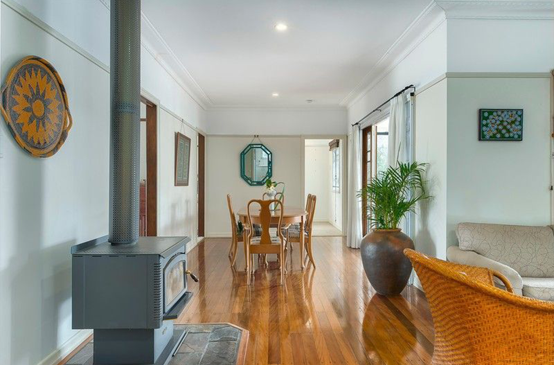 Charming Interiors: Step inside to discover beautiful floorboards that enhance the home’s warmth and character. The inviting open fire place serves as a focal point in the living area, perfect for cozy evenings with family.-
