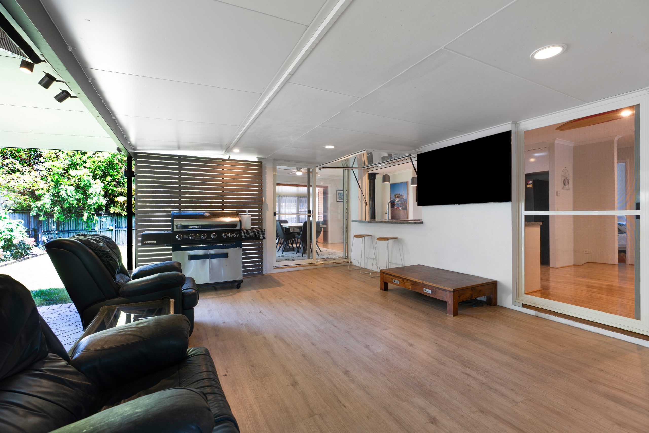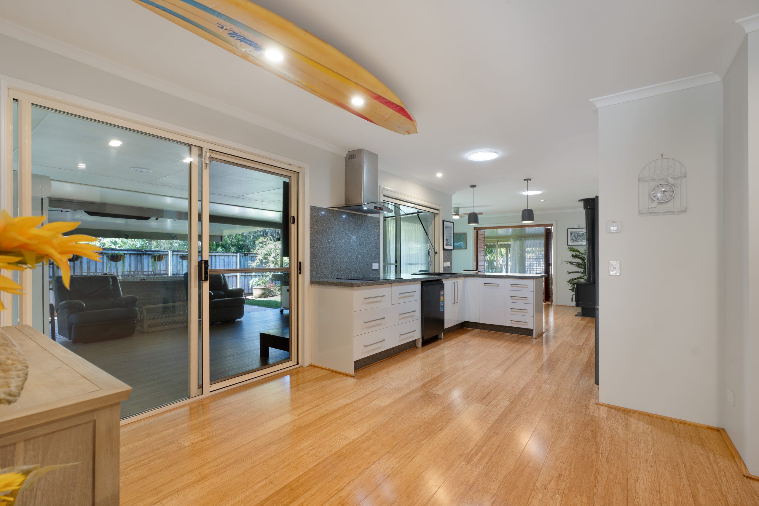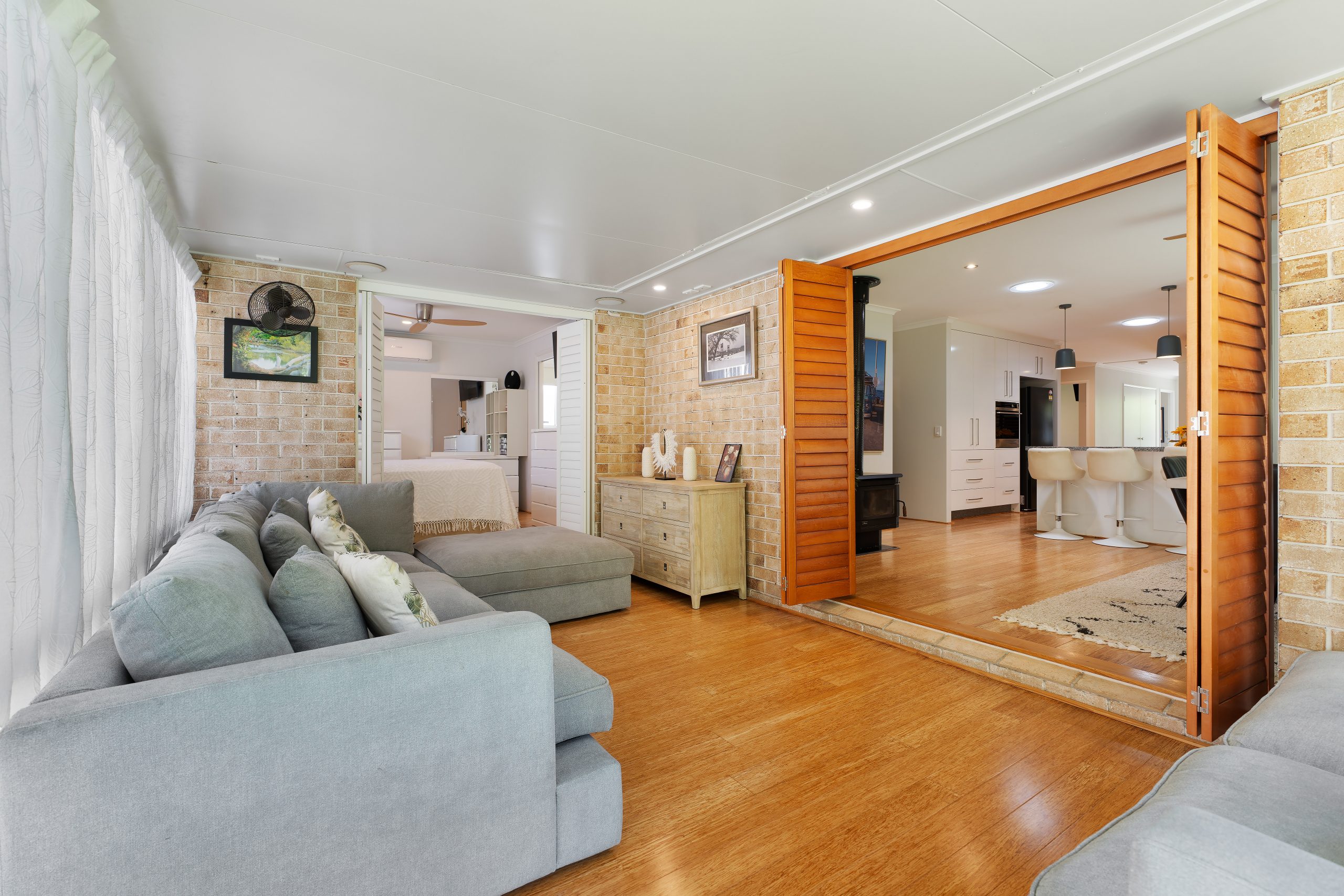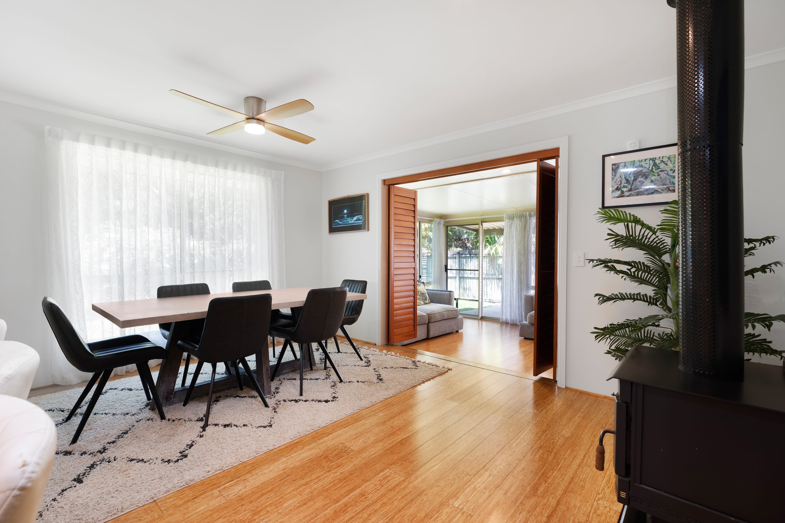 Inside, the home reveals a warm, functional layout designed for relaxed coastal living. Four bedrooms and two bathrooms offer flexibility for families or guests, while a sunroom or sitting area off the master bedroom and dining space creates a peaceful retreat. The dining area, anchored by a fireplace, sets a cosy tone through the cooler months, while the kitchen’s open servery window connects seamlessly to the expansive outdoor entertaining area – the perfect setting for long lunches or evening gatherings overlooking the tranquil bushland.