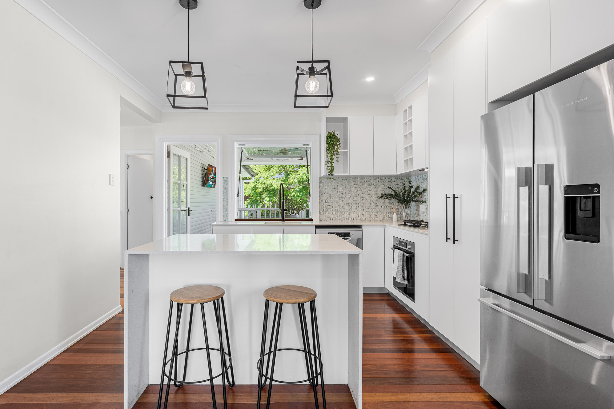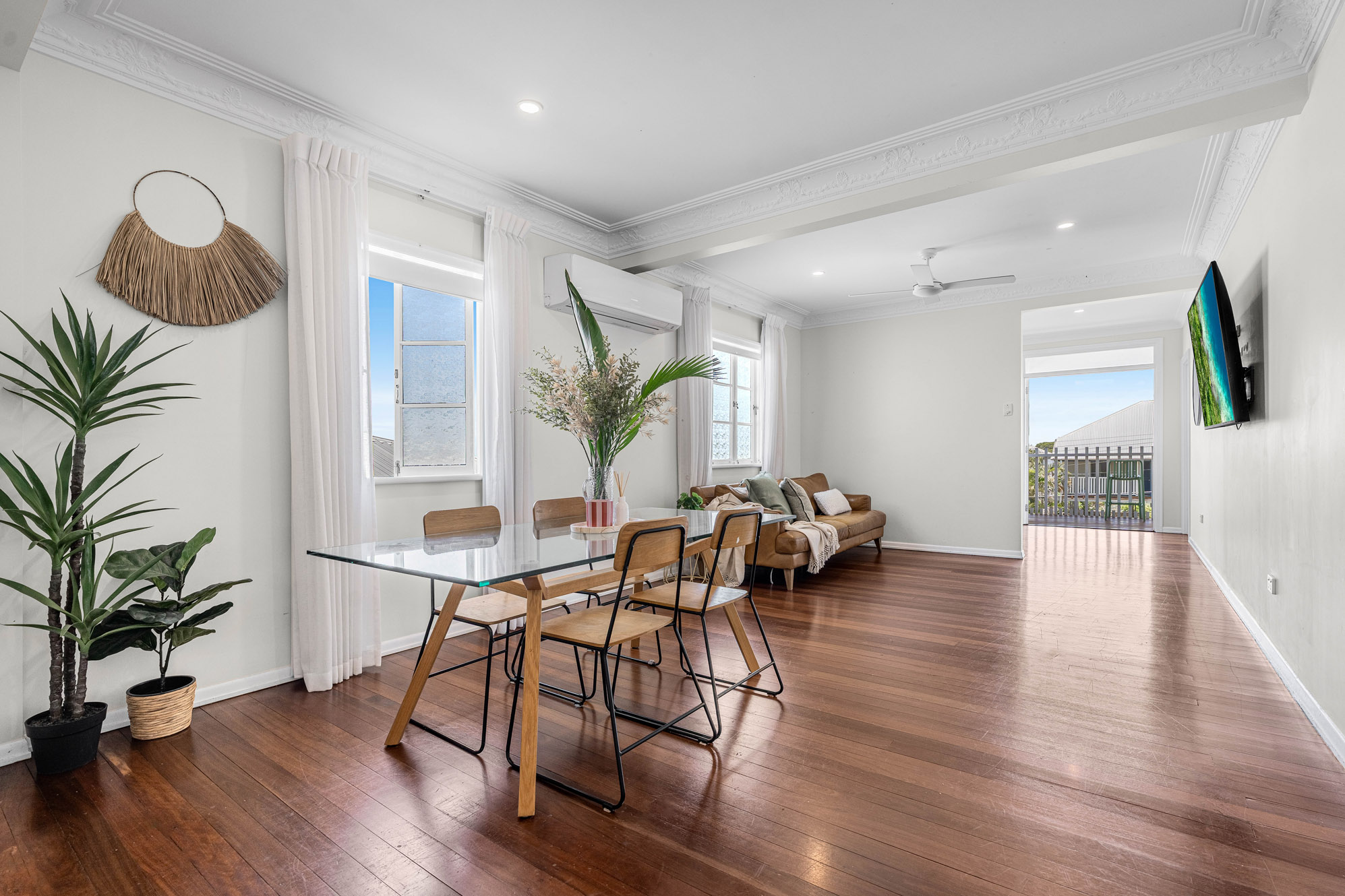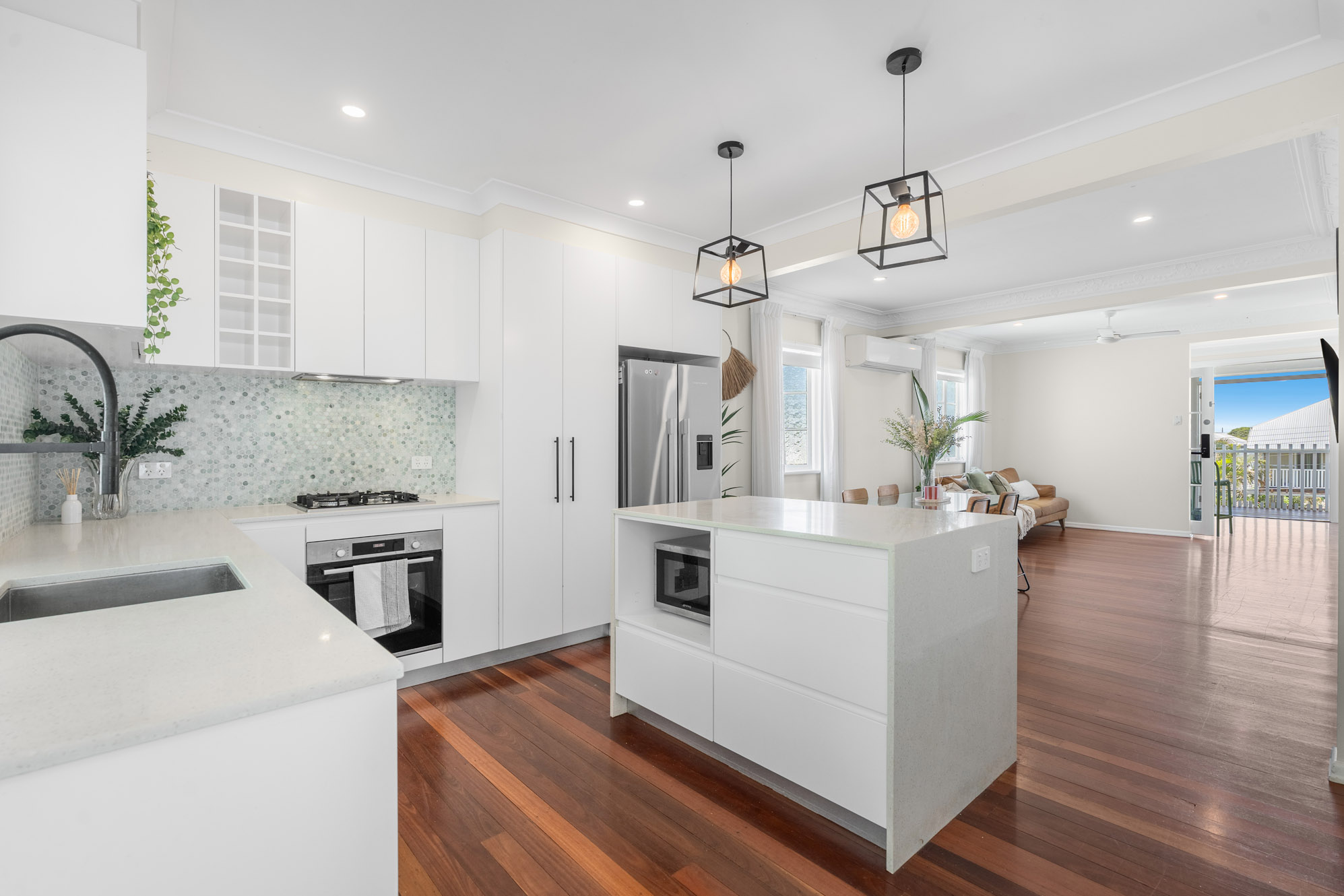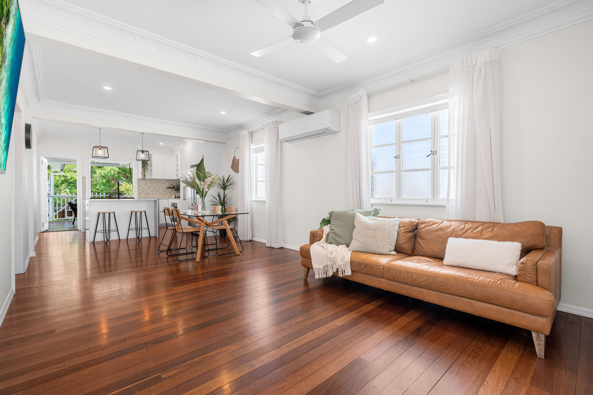 Upstairs, polished hardwood flooring runs throughout the open plan living, dining and kitchen and together with a soft, colour palette and natural light this space creates a warm and inviting atmosphere. Features include air-conditioning, decorative cornices, and a seamless flow to the rear deck. The contemporary kitchen includes stone benchtops, Bosch appliances, gas hob, and a convenient servery window to the deck – ideal for relaxed entertaining.