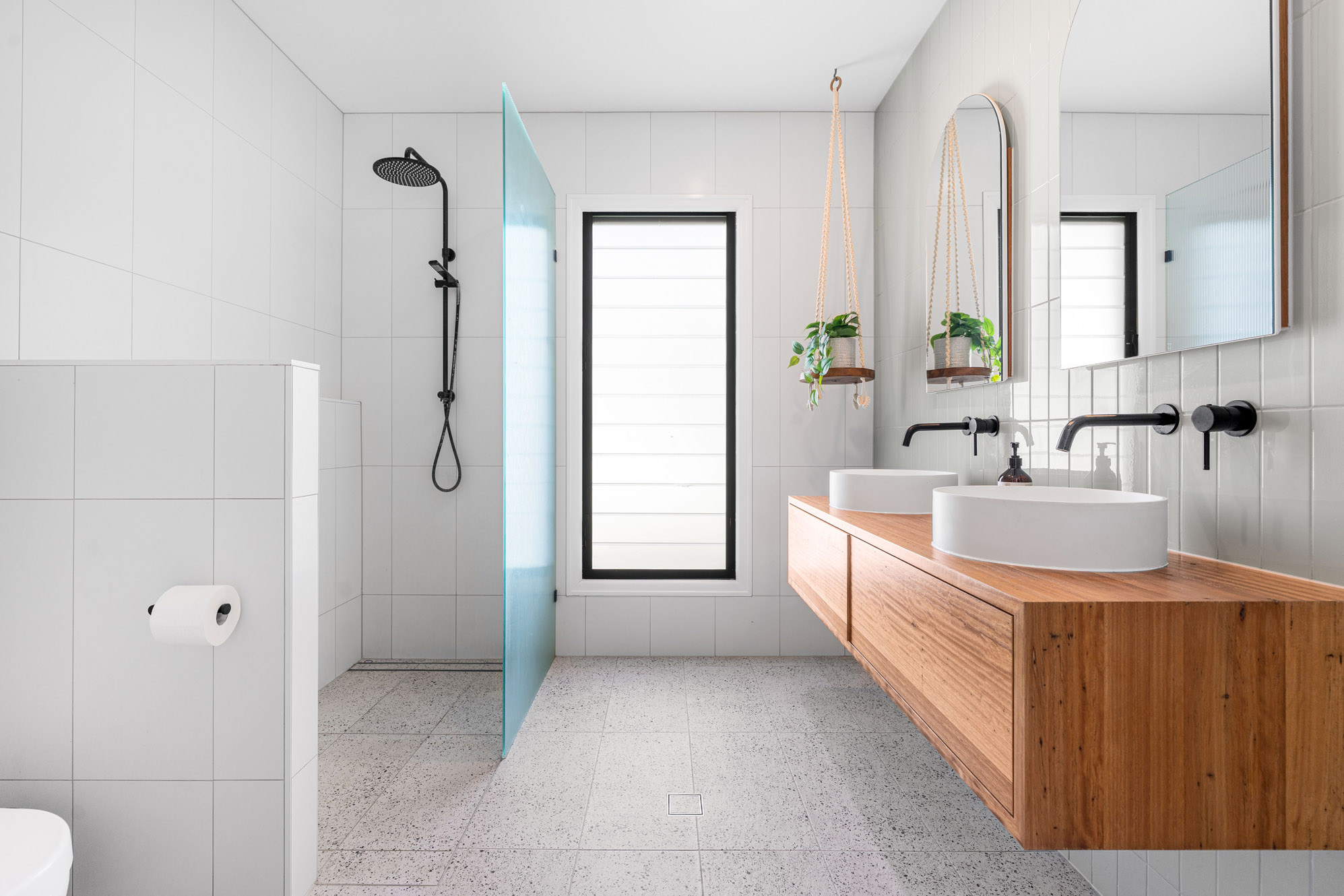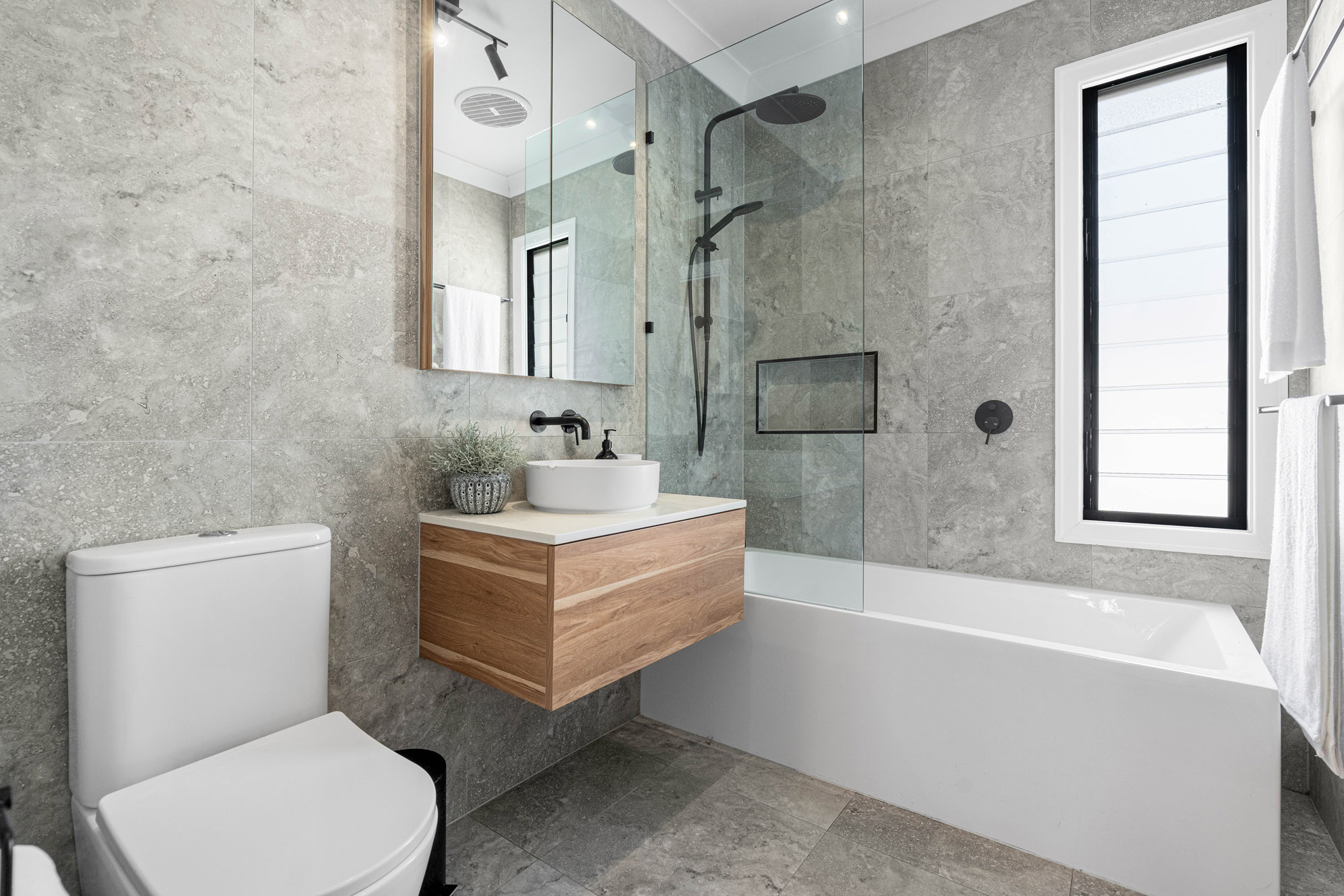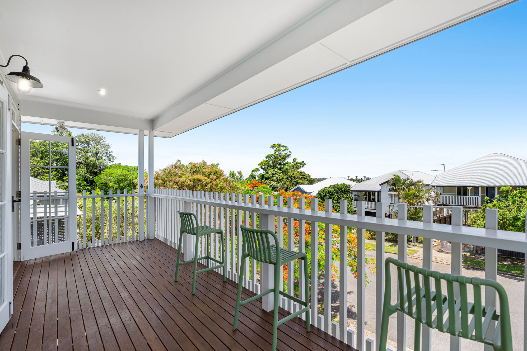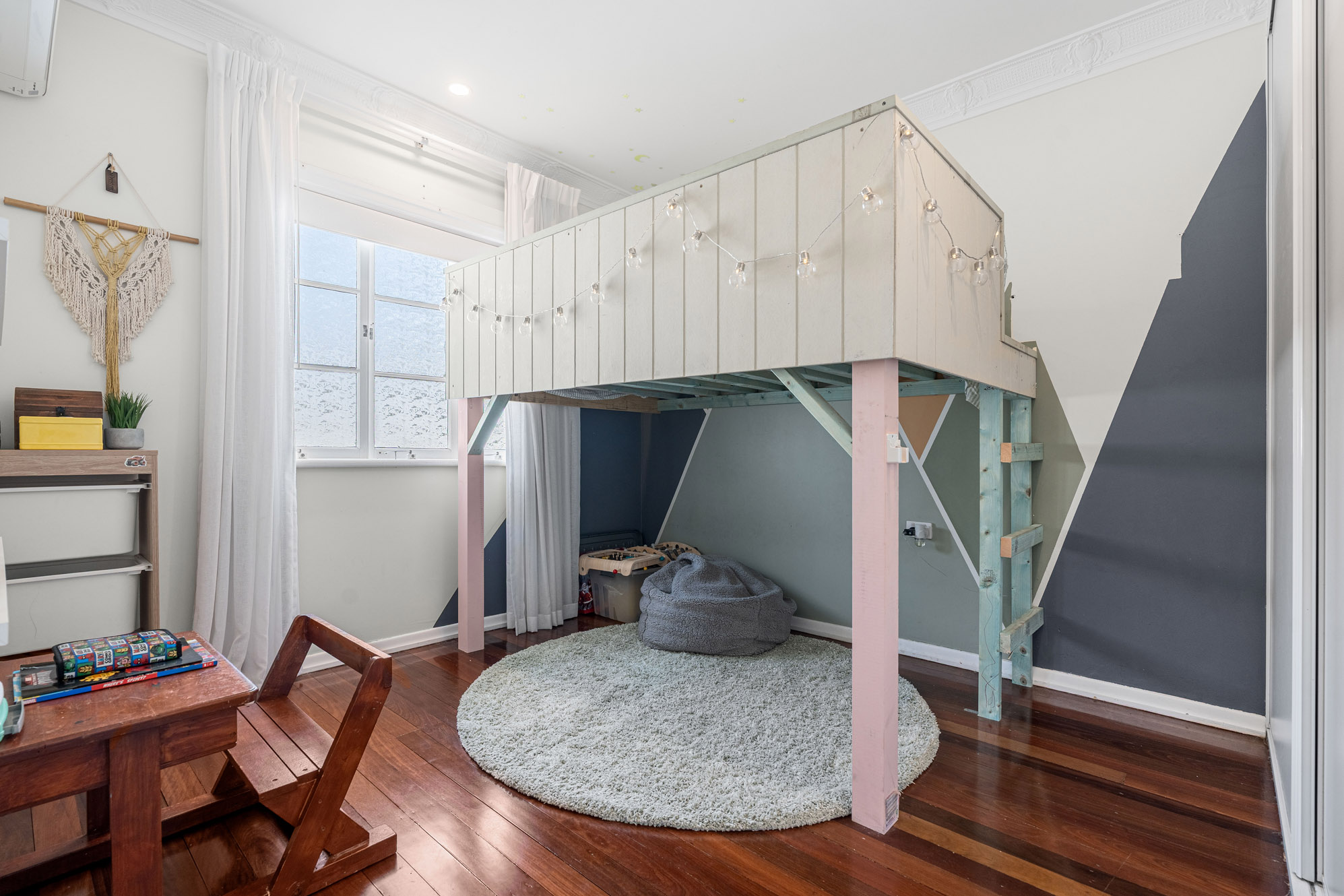 Upstairs, polished hardwood flooring runs throughout the open plan living, dining and kitchen and together with a soft, colour palette and natural light this space creates a warm and inviting atmosphere. Features include air-conditioning, decorative cornices, and a seamless flow to the rear deck. The contemporary kitchen includes stone benchtops, Bosch appliances, gas hob, and a convenient servery window to the deck – ideal for relaxed entertaining.