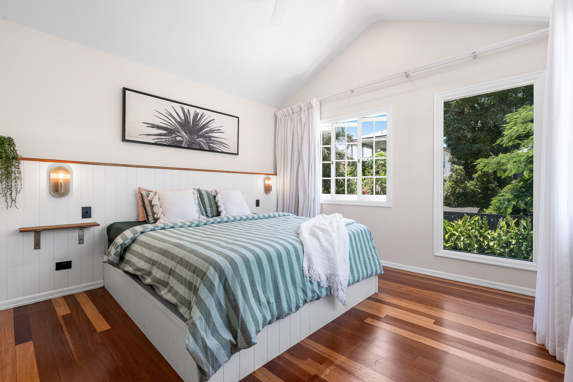 Four bedrooms occupy the upper level, including a light-filled master suite with large picture window with pool and garden outlook, walk-in robe, ensuite with dual vanities, and a VJ feature wall with a built-in king bedframe. The front bedroom opens to a large balcony with cityscape glimpses.